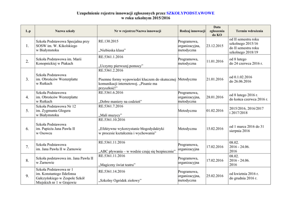 Uzupełnienie rejestru innowacji zgłoszonych przez SZKOŁYPODSTAWOWE w roku szkolnym 2015/2016 L.p 1. 2. 3. 4. 5. Nazwa szkoły Szkoła Podstawowa Specjalna przy SOSW im. W. Kikolskiego w Białymstoku Szkoła Podstawowa im. Marii Konopnickiej w Ptakach Szkoła Podstawowa im. Obrońców Westerplatte w Rutkach Szkoła Podstawowa im. Obrońców Westerplatte w Rutkach Szkoła Podstawowa Nr 12 im. Zygmunta Glogera w Białymstoku 6. Szkoła Podstawowa im. Papieża Jana Pawła II w Osowcu 7. Szkoła Podstawowa im. Jana Pawła II w Żarnowie 8. 9. Szkoła podstawowa im. Jana Pawła II w Żarnowie Szkoła Podstawowa nr 1 im. Konstantego Ildefonsa Gałczyńskiego w Zespole Szkół Miejskich nr 1 w Grajewie Nr w rejestrze/Nazwa innowacji Rodzaj innowacji Data zgłoszenia do KO Termin wdrożenia Programowa, organizacyjna, metodyczna 23.12.2015 od II semestru roku szkolnego 2015/16 do II semestru roku szkolnego 2018/19 Programowa, metodyczna 11.01.2016 od 8 lutego do 24 czerwca 2016 r. Pisemne formy wypowiedzi kluczem do skutecznej Metodyczna komunikacji internetowej. „Pisanie ma przyszłość!” RE.5361.6.2016 Programowa, organizacyjna, metodyczna „Dobre maniery na codzień” RE.5361.7.2016 Metodyczna „Mali muzycy” RE.5361.10.2016 21.01.2016 od 0.1.02.2016 do 26.06.2016 28.01.2016 od 8 lutego 2016 r. do końca czerwca 2016 r. 01.02.2016 2015/2016, 2016/2017 i 2017/2018 „Efektywne wykorzystanie blogodydaktyki w procesie kształcenia i wychowania” 15.02.2016 od 1 marca 2016 do 31 sierpnia 2016 RE.130.2015 „Niebieska klasa” RE.5361.1.2016 „Uczymy pierwszej pomocy” RE.5361.2.2016 RE.5361.11.2016 „ABC pływania – w wodzie czuję się bezpiecznie” RE.5361.11.2016 „Magiczny świat teatru” RE.5361.14.2016 „Szkolny Ogródek ziołowy” Metodyczna Programowa, organizacyjna 17.02.2016 Programowa, organizacyjna 17.02.2016 Programowa, organizacyjna, metodyczna 25.02.2016 08.02. 2016 - 24.06. 2016 08.02. 2016 - 24.06. 2016 od kwietnia 2016 r. do grudnia 2016 r. L.p 10. 11. 12. 13. 14. 15. 16. 17. Nazwa szkoły Szkoła Podstawowa nr 1 im. Konstantego Ildefonsa Gałczyńskiego w Zespole Szkół Miejskich nr 1 w Grajewie Szkoła Podstawowej im. Konstytucji 3 Maja w Zespole Szkół w Jaświłach Szkoła Podstawowej nr 1 im. K.I Gałczyńskiego w Zespole Szkół Miejskich nr 1 w Grajewie Szkoła Podstawowa nr 5 im. Stanisława Staszica w Łomży Szkoła Podstawowa im. Wspólnoty Polskiej w Białostoczku k/Kurian Szkoła Podstawowa im. Wspólnoty Polskiej w Białostoczku k/Kurian Szkoła Podstawowa im. Wspólnoty Polskiej w Białostoczku k/Kurian Szkoła Podstawowa im. Wspólnoty Polskiej w Białostoczku k/Kurian 18. Szkoła Podstawowa im. Wspólnoty Polskiej w Białostoczku k/Kurian 19. Szkoła Podstawowa im. Wspólnoty Polskiej w Białostoczku k/Kurian 20. Szkoła Podstawowa nr 3 z Oddziałami Integracyjnymi i Oddziałami Sportowymi w Zespole Szkół Samorządowych im. 1 Pułku Nr w rejestrze/Nazwa innowacji RE.5361.14.2016 „Zabawa w teatr” RE.5361.15.2016 „Ogród w praktyce” RE.5361.19.2016 „Mały projektant - kółko krawieckie” RE.5361.22.2016 „Sport – Zabawa – Integracja” RE.5361.27.2016 „Z wolontariatem za pan brat” RE.5361.28.2016 „Savoir-vivre rycerza/damy XXI wieku” RE.5361.29.2016 „Zabiegam, pomagam, ratuję” RE.5361.30.2016 „wy-GRA-na matematyka” RE.5361.31.2016 „Mały czyta dużemu. Baśniowe podróże po świecie” RE.5361.32.2016 Rodzaj innowacji Termin wdrożenia Programowa, organizacyjna, metodyczna 25.02.2016 od kwietnia 2016 r. do czerwca 2017 r. Organizacyjna, metodyczna 26.02.2016 od marca 2016 r. do listopada 2016 r. Programowa, organizacyjna, metodyczna 14.03.2016 od września 2016 r. do maja 2017 r. Organizacyjna 16.03.2016 od 1 kwietnia 2016 r. do 17 czerwca 2016 r. 22.03.2016 2016/2017, 2017/2018, 2018/2019 22.03.2016 2016/2017, 2017/2018, 2018/2019 22.03.2016 2016/2017, 2017/2018, 2018/2019 22.03.2016 2016/2017, 2017/2018, 2018/2019 22.03.2016 2016/2017, 2017/2018, 2018/2019 22.03.2016 2016/2017, 2017/2018, 2018/2019 25.03.2016 od września 2016 r. do czerwca 2017 r. Programowa, organizacyjna, metodyczna Programowa, organizacyjna, metodyczna Programowa, organizacyjna, metodyczna Programowa, organizacyjna, metodyczna Programowa, organizacyjna, metodyczna Programowa, organizacyjna, Zajęcia przyrodnicze „ Podążamy tropami ptaków i metodyczna zwierząt” RE.5361.33.2016 Zajęcia przyrodnicze „Podążamy tropami ptaków i zwierząt” Data zgłoszenia do KO Metodyczna L.p 21. 22. 23. 24. 25. 26. Nazwa szkoły Ułanów Krechowieckich w Augustowie Szkoła Podstawowa nr 3 z Oddziałami Integracyjnymi i Oddziałami Sportowymi w Zespole Szkół Samorządowych im. 1 Pułku Ułanów Krechowieckich w Augustowie Szkoła Podstawowa nr 3 z Oddziałami Integracyjnymi i Oddziałami Sportowymi w Zespole Szkół Samorządowych im. 1 Pułku Ułanów Krechowieckich w Augustowie Szkoła Podstawowa nr 3 z Oddziałami Integracyjnymi i Oddziałami Sportowymi w Zespole Szkół Samorządowych im. 1 Pułku Ułanów Krechowieckich w Augustowie Szkoła Podstawowa nr 3 z Oddziałami Integracyjnymi i Oddziałami Sportowymi w Zespole Szkół Samorządowych im. 1 Pułku Ułanów Krechowieckich w Augustowie Szkoła Podstawowa nr 3 z Oddziałami Integracyjnymi i Oddziałami Sportowymi w Zespole Szkół Samorządowych im. 1 Pułku Ułanów Krechowieckich w Augustowie Szkoła Podstawowa nr 3 z Oddziałami Integracyjnymi i Oddziałami Sportowymi w Zespole Szkół Samorządowych im. 1 Pułku Ułanów Krechowieckich w Augustowie Nr w rejestrze/Nazwa innowacji Rodzaj innowacji Data zgłoszenia do KO RE.5361.34.2016 Termin wdrożenia Metodyczna 25.03.2016 od września 2016 r. do czerwca 2018 r. Metodyczna 25.03.2016 2016/2017 - 2017/2018 Metodyczna 25.03.2016 2016/2017 Metodyczna 25.03.2016 01.09.2016 – 30.05. 2019 Metodyczna 25.03.2016 01.09.2016 – 30.06. 2019 Metodyczna 25.03.2016 od września 2016 r. do czerwca 2018 r. „Ortografia w plastyce” 