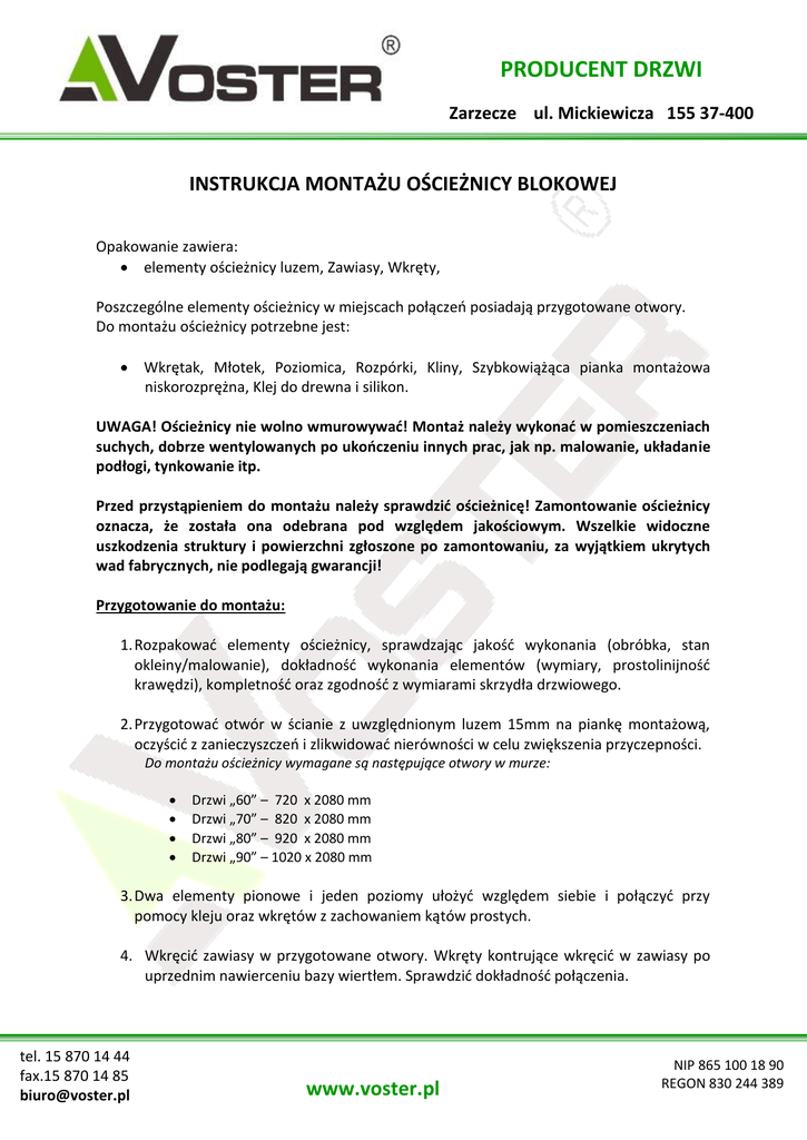 PRODUCENT DRZWI Zarzecze ul. Mickiewicza 155 37-400 Nisko INSTRUKCJA MONTAŻU OŚCIEŻNICY BLOKOWEJ Opakowanie zawiera: elementy ościeżnicy luzem, Zawiasy, Wkręty, Poszczególne elementy ościeżnicy w miejscach połączeń posiadają przygotowane otwory. Do montażu ościeżnicy potrzebne jest: Wkrętak, Młotek, Poziomica, Rozpórki, Kliny, Szybkowiążąca pianka montażowa niskorozprężna, Klej do drewna i silikon. UWAGA! Ościeżnicy nie wolno wmurowywać! Montaż należy wykonać w pomieszczeniach suchych, dobrze wentylowanych po ukończeniu innych prac, jak np. malowanie, układanie podłogi, tynkowanie itp. Przed przystąpieniem do montażu należy sprawdzić ościeżnicę! Zamontowanie ościeżnicy oznacza, że została ona odebrana pod względem jakościowym. Wszelkie widoczne uszkodzenia struktury i powierzchni zgłoszone po zamontowaniu, za wyjątkiem ukrytych wad fabrycznych, nie podlegają gwarancji! Przygotowanie do montażu: 1. Rozpakować elementy ościeżnicy, sprawdzając jakość wykonania (obróbka, stan okleiny/malowanie), dokładność wykonania elementów (wymiary, prostolinijność krawędzi), kompletność oraz zgodność z wymiarami skrzydła drzwiowego. 2. Przygotować otwór w ścianie z uwzględnionym luzem 15mm na piankę montażową, oczyścić z zanieczyszczeń i zlikwidować nierówności w celu zwiększenia przyczepności. Do montażu ościeżnicy wymagane są następujące otwory w murze: Drzwi „60” – 720 x 2080 mm Drzwi „70” – 820 x 2080 mm Drzwi „80” – 920 x 2080 mm Drzwi „90” – 1020 x 2080 mm 3. Dwa elementy pionowe i jeden poziomy ułożyć względem siebie i połączyć przy pomocy kleju oraz wkrętów z zachowaniem kątów prostych. 4. Wkręcić zawiasy w przygotowane otwory. Wkręty kontrujące wkręcić w zawiasy po uprzednim nawierceniu bazy wiertłem. Sprawdzić dokładność połączenia. tel. 15 870 14 44 fax.15 870 14 85 [email protected] www.voster.pl NIP 865 100 18 90 REGON 830 244 389 PRODUCENT DRZWI Zarzecze ul. Mickiewicza 155 37-400 Nisko 5. Sprawdzić prawidłowość wykonania otworu w ścianie (szerokość, wysokość, równość powierzchni). Montaż ościeżnicy w ścianie: 1. Osadzić gotową ościeżnicę w otworze ściany przy pomocy klinów z zachowaniem funkcji LEWA lub PRAWA i szczeliny między elementami a murem około 15mm. 2. Na wysokości zawiasów dolnych, górnych, zamka oraz progu, pomiędzy ościeżnicę a mur włożyć klocki dystansowe (kliny). Elementy pionowe ustabilizować rozpórkami regulowanymi za pomocą klinów. 3. Sprawdzić pion, poziom oraz kąty ościeżnicy. 4. Sprawdzone ościeżnice przymocować na sztywno przy pomocy kołków (dybli) montażowych dostosowanych do rodzaju ściany. Ze względów estetycznych zaleca się wykonanie mocowań w felcu pod uszczelką, poniżej zawiasu górnego i dolnego oraz zaczepu zamka. 5. Dla sprawdzenia poprawności montażu zawiesić skrzydło drzwiowe i sprawdzić jego przyleganie. Wyregulować położenie skrzydła w stosunku do ościeżnicy regulując ustawienie zawiasów. Ustawienie ościeżnicy powinno zapewnić jednakowe szczeliny pomiędzy skrzydłem a ościeżnicą na całej wysokości i szerokości skrzydła. Uszczelka może ulec ściśnięciu max. o 3mm. 6. Zabezpieczyć ościeżnice przed jej zabrudzeniem od nadmiaru pianki montażowej. UWAGA! Stosując taśmy malarskie należy je usunąć natychmiast po montażu, nie później niż przed okresem zalecanym przez producenta taśm. 7. Osadzoną i zabezpieczoną ościeżnicę zespolić z murem przy pomocy pianki montażowej. Piankę wstrzykiwać w szczeliny między mur a ościeżnicę na wysokości rozpórek i w obu górnych narożnikach. Po upływie 24h można zdemontować rozpórki i kliny oraz usunąć nadmiar pianki. 8. Przymocować listwy wykończeniowe. UWAGA! Opaski i ćwierćwałki nie należą do kompletu! 9. W pomieszczeniach narażonych na wilgoć zabezpieczyć silikonem miejsca styku ościeżnicy z podłogą i ścianą. tel. 15 870 14 44 fax.15 870 14 85 [email protected] www.voster.pl NIP 865 100 18 90 REGON 830 244 389