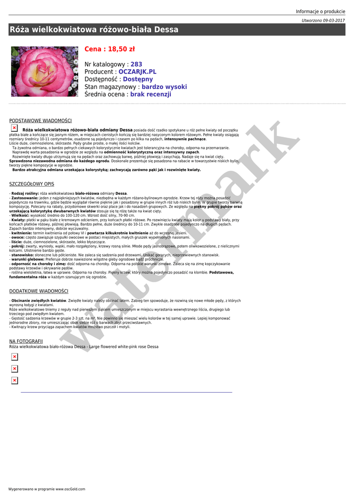 Informacje o produkcie Utworzono 09-03-2017 Róża wielkokwiatowa różowo-biała Dessa Cena : 18,50 zł Nr katalogowy : 283 Producent : OCZARJK.PL Dostępność : Dostępny Stan magazynowy : bardzo wysoki Średnia ocena : brak recenzji PODSTAWOWE WIADOMOŚCI er m ar k Róża wielkokwiatowa różowo-biała odmiany Dessa posiada dość rzadko spotykane u róż pełne kwiaty od początku płatka białe a kończące się jasnym różem, w miejscach cienistych kończą się bardziej nasyconym kolorem różowym. Pełne kwiaty osiągają rozmiary średnicy 10-11 centymetrów, osadzone są pojedynczo i czasem po kilka na pędach, intensywnie pachnące. Liście duże, ciemnozielone, skórzaste. Pędy grube proste, o małej ilości kolców. Ta żywotna odmiana, o bardzo pełnych ciekawych kolorystycznie kwiatach jest tolerancyjna na choroby, odporna na przemarzanie. Naprawdę warta posadzenia w ogrodzie ze względu na odmienność kolorystyczną oraz intensywny zapach. Rozwinięte kwiaty długo utrzymują się na pędach oraz zachowują barwę, później płowieją i zasychają. Nadaje się na kwiat cięty. Sprawdzona niezawodna odmiana do każdego ogrodu. Doskonale prezentuje się posadzona na rabacie w towarzystwie niskich bylin, tworzy piękne kompozycje w ogrodzie. Bardzo atrakcyjna odmiana urzekająca kolorystyką; zachwycają zarówno pąki jak i rozwinięte kwiaty. SZCZEGÓŁOWY OPIS at - Rodzaj rośliny: róża wielkokwiatowa biało-różowa odmiany Dessa. - Zastosowanie: jeden z najpiękniejszych kwiatów, niezbędna w każdym różano-bylinowym ogrodzie. Krzew tej róży można posadzić pojedynczo na trawniku, gdzie będzie wyglądał równie pięknie jak i posadzony w grupie innych róż lub niskich bylin. W grupie tworzy barwną kompozycję. Polecany na rabaty, przydomowe skwerki oraz place jak i do nasadzeń grupowych. Ze względu na piękny pokrój pąków oraz urzekającą kolorystykę dwubarwnych kwiatów stosuje się tę różę także na kwiat cięty. - Wielkość: wysokość średnio do 100-120 cm. Wzrost dość silny, 70-90 cm. - Kwiaty: płatki w pąku białe z kremowym odcieniem, przy końcach płatki różowe. Po rozwinięciu kwiaty mają kolor u podstawy biały, przy końcach płatków różowy, później płowieją. Bardzo pełne, duże średnicy do 10-11 cm. Zwykle osadzone pojedynczo na długich pędach. Zapach bardzo intensywny, dobrze wyczuwalny. - kwitnienie: termin kwitnienia od połowy VI i powtarza kilkukrotnie kwitnienie aż do wczesnej jesieni. - owoce: często zawiązuje szypułki owocowe w postaci mięsistych, małych gruszek wypełnionych nasionami. - liście: duże, ciemnozielone, skórzaste, lekko błyszczące. - pokrój: zwarty, wyniosły, wąski, mało rozgałęziony, krzewy rosną silnie. Młode pędy jasnobrązowe, potem oliwkowozielone, z nielicznymi kolcami. Ulistnienie bardzo gęste. - stanowisko: słoneczne lub półcieniste. Nie zaleca się sadzenia pod drzewami. Unikać gorących, nieprzewiewnych stanowisk. - warunki glebowe: Preferuje dobrze nawiezione wilgotne gleby ogrodowe bądź próchnicze. - odporność na choroby i zimę: dość odporna na choroby. Odporna na polskie warunki zimowe. Zaleca się na zimę kopczykowanie podstawy krzewów i okrywanie pędów. - roślina wieloletnia, łatwa w uprawie. Odporna na choroby. Piękny krzew, który można pojedynczo posadzić na klombie. Podstawowa, fundamentalna róża w każdym szanującym się ogrodzie. DODATKOWE WIADOMOŚCI w - Obcinanie zwiędłych kwiatów. Zwiędłe kwiaty należy obcinać latem. Zabieg ten spowoduje, że rozwiną się nowe młode pędy, z których wyrosną łodygi z kwiatami. Róże wielkokwiatowe tniemy z reguły nad pierwszym pąkiem umieszczonym w miejscu wyrastania wewnętrznego liścia, drugiego lub trzeciego pod zwiędłym kwiatem. - Gęstość sadzenia krzewów w grupie 2-3 szt. na m². Nie powinno się mieszać wielu kolorów w tej samej uprawie. Lepiej komponować jednorodne zbiory, nie umieszczając obok siebie róż o barwach zbyt przeciwstawnych. - Kwitnący krzew przyciąga zapachem kwiatów mnóstwo pszczół i motyli. NA FOTOGRAFII Róża wielkokwiatowa biało-różowa Dessa - Large flowered white-pink rose Dessa Wygenerowano w programie www.oscGold.com DLACZEGO WARTO KUPIĆ ROŚLINY U NAS - Wszystkie rośliny są dobrze ukorzenione, zdrowe oraz zadbane. Dokładamy wszelkich starań, aby wygląd roślin spełniał Państwa oczekiwania. Poza tym na większości stron naszych ofert na ostatnim zdjęciu poniżej przedstawiamy wygląd przykładowych rzeczywistych sadzonek, aby każdy mógł zobaczyć co kupuje. - W okresie zimowym, wczesnowiosennym lub późnojesiennym większość roślin sprzedajemy w stanie bezlistnym (bez liści) oraz z gołym korzeniem zawiniętym w wilgotny torf. W sezonie rośliny posiadają piękne żywe ulistnienie i w większości są w plastikowych lub foliowych doniczkach. - Przedmiotem sprzedaży jest sadzonka róży wysokości ok. 40 cm w okresie jesiennym i wiosennym z korzeniem zawiniętym w torfie, w okresie letnim w doniczce plastikowej lub foliowej. Wygląd sadzonki zapakowanej w wilgotny torf i otulonej folią. w at er m ar k KONIECZNIE ZOBACZ
