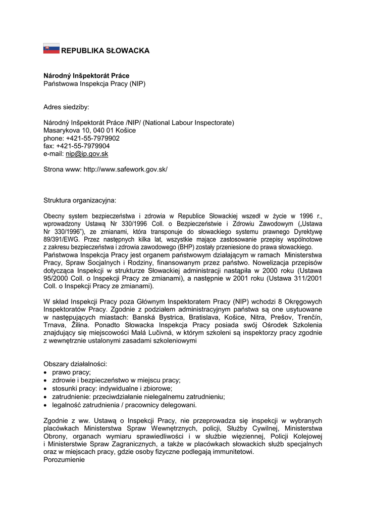 REPUBLIKA SŁOWACKA Národný Inšpektorát Práce Państwowa Inspekcja Pracy (NIP) Adres siedziby: Národný Inšpektorát Práce /NIP/ (National Labour Inspectorate) Masarykova 10, 040 01 Košice phone: +421-55-7979902 fax: +421-55-7979904 e-mail: [email protected] Strona www: http://www.safework.gov.sk/ Struktura organizacyjna: Obecny system bezpieczeństwa i zdrowia w Republice Słowackiej wszedł w życie w 1996 r., wprowadzony Ustawą Nr 330/1996 Coll. o Bezpieczeństwie i Zdrowiu Zawodowym („Ustawa Nr 330/1996”), ze zmianami, która transponuje do słowackiego systemu prawnego Dyrektywę 89/391/EWG. Przez następnych kilka lat, wszystkie mające zastosowanie przepisy wspólnotowe z zakresu bezpieczeństwa i zdrowia zawodowego (BHP) zostały przeniesione do prawa słowackiego. Państwowa Inspekcja Pracy jest organem państwowym działającym w ramach Ministerstwa Pracy, Spraw Socjalnych i Rodziny, finansowanym przez państwo. Nowelizacja przepisów dotycząca Inspekcji w strukturze Słowackiej administracji nastąpiła w 2000 roku (Ustawa 95/2000 Coll. o Inspekcji Pracy ze zmianami), a następnie w 2001 roku (Ustawa 311/2001 Coll. o Inspekcji Pracy ze zmianami). W skład Inspekcji Pracy poza Głównym Inspektoratem Pracy (NIP) wchodzi 8 Okręgowych Inspektoratów Pracy. Zgodnie z podziałem administracyjnym państwa są one usytuowane w następujących miastach: Banská Bystrica, Bratislava, Košice, Nitra, Prešov, Trenčín, Trnava, Žilina. Ponadto Słowacka Inspekcja Pracy posiada swój Ośrodek Szkolenia znajdujący się miejscowości Malá Lučivná, w którym szkoleni są inspektorzy pracy zgodnie z wewnętrznie ustalonymi zasadami szkoleniowymi Obszary działalności: prawo pracy; zdrowie i bezpieczeństwo w miejscu pracy; stosunki pracy: indywidualne i zbiorowe; zatrudnienie: przeciwdziałanie nielegalnemu zatrudnieniu; legalność zatrudnienia / pracownicy delegowani. Zgodnie z ww. Ustawą o Inspekcji Pracy, nie przeprowadza się inspekcji w wybranych placówkach Ministerstwa Spraw Wewnętrznych, policji, Służby Cywilnej, Ministerstwa Obrony, organach wymiaru sprawiedliwości i w służbie więziennej, Policji Kolejowej i Ministerstwie Spraw Zagranicznych, a także w placówkach słowackich służb specjalnych oraz w miejscach pracy, gdzie osoby fizyczne podlegają immunitetowi. Porozumienie Porozumienie o Współpracy pomiędzy Państwową Inspekcją Pracy w Rzeczypospolitej Polskiej a Państwową Inspekcją Pracy w Republice Słowackiej zostało podpisane w Malej Lučivnie w marcu 2013 roku i zastąpiło ono obowiązujący dotychczas protokół o współpracy z 2008 roku. Zakres nowego porozumienia został rozszerzony m.in. o tematykę wymiany informacji na temat delegowania pracowników w ramach dyrektywy 96/71/WE oraz składania wniosków o informacje dotyczące warunków zatrudnienia pracowników polskich i słowackich, świadczących pracę na terenie drugiego państwa.