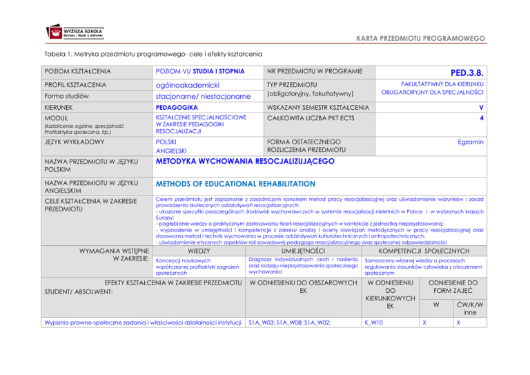 KARTA PRZEDMIOTU PROGRAMOWEGO Tabela 1. Metryka przedmiotu programowego- cele i efekty kształcenia PED.3.8. POZIOM KSZTAŁCENIA POZIOM VI/ STUDIA I STOPNIA NR PRZEDMIOTU W PROGRAMIE PROFIL KSZTAŁCENIA ogólnoakademicki Forma studiów stacjonarne/ niestacjonarne TYP PRZEDMIOTU (obligatoryjny, fakultatywny) KIERUNEK PEDAGOGIKA WSKAZANY SEMESTR KSZTAŁCENIA V MODUŁ KSZTAŁCENIE SPECJALNOŚCIOWE W ZAKRESIE PEDAGOGIKI RESOCJALIZACJI CAŁKOWITA LICZBA PKT ECTS 4 JĘZYK WYKŁADOWY POLSKI ANGIELSKI FORMA OSTATECZNEGO ROZLICZENIA PRZEDMIOTU NAZWA PRZEDMIOTU W JĘZYKU POLSKIM METODYKA WYCHOWANIA RESOCJALIZUJĄCEGO NAZWA PRZEDMIOTU W JĘZYKU ANGIELSKIM METHODS OF EDUCATIONAL REHABILITATION CELE KSZTAŁCENIA W ZAKRESIE PRZEDMIOTU Celem przedmiotu jest zapoznanie z zasadniczym kanonem metod pracy resocjalizacyjnej oraz uświadomienie warunków i zasad prowadzenia skutecznych oddziaływań resocjalizacyjnych - ukazanie specyfiki poszczególnych środowisk wychowawczych w systemie resocjalizacji nieletnich w Polsce i w wybranych krajach Europy; - pogłębianie wiedzy o praktycznym zastosowaniu teorii resocjalizacyjnych w kontakcie z jednostką nieprzystosowaną; - wyposażenie w umiejętności i kompetencje z zakresu analizy i oceny rozwiązań metodycznych w pracy resocjalizacyjnej oraz stosowania metod i technik wychowania w procesie oddziaływań kulturotechnicznych i antropotechnicznych, - uświadomienie etycznych aspektów roli zawodowej pedagoga resocjalizacyjnego oraz społecznej odpowiedzialności (kształcenie ogólne, specjalność Profilaktyka społeczna, itp.) WYMAGANIA WSTĘPNE W ZAKRESIE: FAKULTATYWNY DLA KIERUNKU OBLIGATIORYJNY DLA SPECJALNOŚCI Egzamin WIEDZY UMIEJĘTNOŚCI KOMPETENCJI SPOŁECZNYCH Koncepcji naukowych współczesnej profilaktyki zagrożeń społecznych Diagnozy indywidualnych cech i nasilenia oraz rodzaju nieprzystosowania społecznego wychowanka Samooceny własnej wiedzy o procesach regulowania stosunków człowieka z otoczeniem społecznym W ODNIESIENIU DO OBSZAROWYCH EK W ODNIESIENIU DO KIERUNKOWYCH EK EFEKTY KSZTAŁCENIA W ZAKRESIE PRZEDMIOTU STUDENT/ ABSOLWENT: Wyjaśnia prawno-społeczne zadania i właściwości działalności instytucji S1A_W03; S1A_W08; S1A_W02; K_W10 ODNIESIENIE DO FORM ZAJĘĆ W X ĆW/K/W inne X KARTA PRZEDMIOTU PROGRAMOWEGO wychowawczych Definiuje procedury, zasady i metody resocjalizacji H1A_W04; K_W16 X Interpretuje zasady i normy etyczne w pracy resocjalizacyjnej S1A_U07 K_W19 X X Analizuje problemy oddziaływań wychowawczych przez pryzmat koncepcji resocjalizacyjnych H1A_U04; H1A_U06; S1A_U03; S1A_U08 K_U03 X X Projektuje działania wychowawcze o charakterze resocjalizacyjnym - K_K08 X Tabela 2. Walidacja i weryfikacja efektów kształcenia EFEKTY KSZTAŁCENIA- student Formy prezentacji EK Poziomy osiągnięcia EK i odpowiadające im oceny ndst (2) dst (3) Poprawnie nazywa większość placówek resocjalizacyjnych, popełnia błędy w wyjaśnianiu celów społecznych niektórych z nich oraz prawnych podstaw organizacyjnych. Poprawnie nazywa poszczególne instytucje resocjalizacyjne, wąsko wskazuje na ich zadania oraz wąsko wyjaśnia prawne podstawy organizacyjne db (4) Poprawnie nazywa poszczególne instytucje resocjalizacyjne, wyczerpująco wskazuje na ich zadania oraz właściwie wyjaśnia prawne podstawy organizacyjne bdb (5) Wyjaśnia prawno-społeczne zadania i właściwości działalności instytucji wychowawczych Pisemne zadanie testowe (wielokrotnego wyboru) Błędnie nazywa poszczególne instytucje resocjalizacyjne, wskazuje na ich zadania oraz prawne podstawy organizacyjne. Definiuje procedury, zasady i metody resocjalizacji Pisemne zadanie testowe (wielokrotnego wyboru) Błędnie określa i opisuje procedury i zasady. Zbyt powierzchownie przedstawia metody. Popełnia znaczące błędy w przyporządkowywaniu metod do określonych procedur. Popełnia błędy w opisie procedur oraz charakterystyce zasad. Wąsko opisuje metody. Popełnia nieznaczące błędy w przyporządkowywaniu metod do określonych procedur. Nie popełnia błędów w opisie procedur oraz charakterystyce zasad. Poprawnie opisuje najważniejsze cechy metody. Nie popełnia błędów w przyporządkowywaniu metod do określonych procedur. Poprawnie opisuje procedury oraz charakteryzuje zasady. Wyczerpująco opisuje metody. Trafnie przyporządkowuje metody do określonych procedur. Interpretuje zasady i normy etyczne w pracy resocjalizacyjnej Praca pisemna o charakterze problemowym Nie przedstawia struktury procesu ewaluacji pracy własnej, błędnie interpretuje standardy zawodowe i etyczne pracy pedagoga resocjalizacyjnego w poszczególnych środowiskach pracy Popełnia błędy w prezentacji struktury procesu ewaluacji pracy własnej, wąsko interpretuje standardy zawodowe i etyczne pracy pedagoga resocjalizacyjnego w poszczególnych środowiskach pracy Poprawnie prezentuje strukturę procesu ewaluacji pracy własnej, właściwie interpretuje standardy zawodowe i etyczne pracy pedagoga resocjalizacyjnego w poszczególnych środowiskach pracy Wyczerpująco prezentuje strukturę procesu ewaluacji pracy własnej oraz charakteryzuje poszczególne jej składniki pod kątem zasad i norm etycznych, trafnie interpretuje standardy zawodowe i etyczne pracy pedagoga resocjalizacyjnego w poszczególnych środowiskach pracy Analizuje problemy oddziaływań Praca pisemna Nieprawidłowo wiąże Popełnia nieznaczne Prawidłowo wiąże Trafnie wiąże poszczególne KARTA PRZEDMIOTU PROGRAMOWEGO wychowawczych przez pryzmat koncepcji resocjalizacyjnych o charakterze problemowym poszczególne koncepcje resocjalizacyjne z problemami wychowawczymi. Nie wynajduje teoretycznych uzasadnień dla określonych metod oddziaływań wychowawczych. błędy w powiązaniu poszczególnych koncepcji resocjalizacyjnych z problemami wychowawczymi. Wynajduje niektóre teoretyczne uzasadnienia dla określonych metod oddziaływań wychowawczych. poszczególne koncepcje resocjalizacyjne z problemami