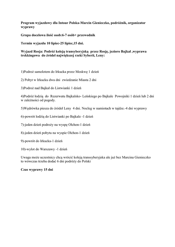 Program wyjazdowy dla Intour Polska-Marcin Gienieczko, podróżnik, organizator wyprawy Grupa docelowa ilość osob:6-7 osób+ przewodnik Termin wyjazdu 10 lipiec-25 lipiec,15 dni. Wyjazd Rosja: Podróż koleją transyberyjską przez Rosję, jezioro Bajkał ,wyprawa trekkingowa do źródeł największej rzeki Syberii, Leny: 1)Podroż samolotem do Irkucka przez Moskwę 1 dzień 2) Pobyt w Irkucku dwa dni zwiedzanie Miasta 2 dni 3)Podroż nad Bajkał do Listwianki 1 dzień 4)Podróż łodzią do Rezerwatu Bajkalsko- Leńskiego po Bajkale Powojniki 1 dzień lub 2 dni w zależności od pogody. 5)Wędrówka piesza do źródeł Leny 4 dni. Nocleg w namiotach w tajdze.-4 dni wyprawy 6)-powrót lodżią do Listwianki po Bajkale -1 dzień 7)-jeden dzień podroży na wyspę Olchon-1 dzień 8)-jeden dzień pobytu na wyspie Olchon-1 dzień 9)-powrót do Irkucka-1 dzień 10)-wylot do Warszawy -1 dzień Uwaga może uczestnicy chcą wrócić koleją transsyberyjska ale już bez Marcina Gienieczko to wówczas trzeba dodać 6 dni podróży do Polski Czas wyprawy 15 dni