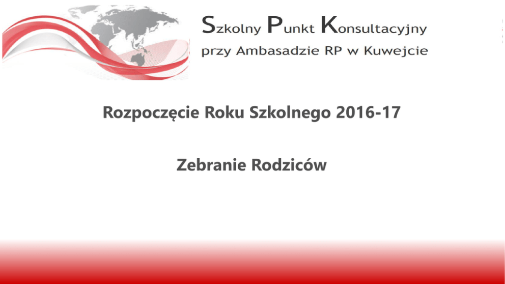 Nauczyciele: mgr Jolanta Żarkowska mgr Iwona Konieczka • • • • • • • • • • • tudia stacjonarne, na wydziale Nauk Społecznych o kierunku Pedagogika, Uniwersytet Gdański, Gdańsk (stypendium naukowe UG, indywidualny tok studiów) Kwalifikacje uprawniające do pracy z dziećmi i młodzieżą metoda Marii Montessori, Uniwersytet Gdański, Gdańsk Odpowiednik podyplomowej Filologii Angielskiej, Trinity College, London Studia podyplomowe w trybie zjazdowym na wydziale Matematyki i Zastosowań, Szkoła Wyższa im. Pawła Włodkowicza, siedziba w Iławie Studia podyplomowe - dyplom trenerski uprawniający do kształcenia nauczycieli, MCI London Edukacja kinezjologiczna / Trening rozwijający metoda Brain Gym', Wspieranie dzieci z dysleksją, Wspomaganie dzieci z ADHD, Kreatywne myślenie / Myślenie rozwijające / Stymulacja uwagi, Budowanie i kierowanie zespołem – trening menadżerski / Zarządzanie, Tworzenie programów edukacyjnych z wykorzystaniem tablic interaktywnych, Obsługi aplikacji i platform edukacyjnych wspierających prace nauczycieli mgr Kinga Masternak mgr Dagmara Mathes - Sobocińska Organizacja Roku Szkolnego 2016-17 • Pracuje w oparciu o podstawę programową dla uczniów uczących się za granicą i obowiązujące ramy programowe kształcenia uzupełniającego dla Szkolnych Punktów Konsultacyjnych, na podstawie Rozporządzenia Ministra Edukacji Narodowej z dnia 31 sierpnia 2010 r. w sprawie organizacji kształcenia dzieci obywateli polskich czasowo przebywających za granicą (Dz. U. Nr 170, poz. 1143 z późn. zm.). • Prowadzi nauczanie uzupełniające na 4 poziomach, w grupach wiekowych - Szkoły Podstawowej, Gimnazjum i Liceum Ogólnokształcacego w zakresie edukacji wczesnoszkolnej, języka polskiego oraz wiedzy o Polsce (geografii, wiedzy o społeczeństwie i historii Polski) Organizacja Roku Szkolnego 2016-17 • Pamiętajmy o tym, że w budynkach Kuwait English School jesteśmy gośćmi. W sposób szczególny dbajmy o powierzone nam mienie. • Pamiętajmy o tym, że podczas lekcji i przerw uczniowie przebywają tylko w tej części budynku, w której znajduje się nasz korytarz i przylegające do niego, wyznaczone sale lekcyjne. • Pamiętajmy o tym, by na terenie budynku szkolnego zachowywać się w sposób odpowiedzialny oraz nie zagrażający bezpieczeństwu swojemu i innych. • Pamiętajmy o tym, by uczniowie nie przynosili ze sobą do szkoły rzeczy wartościowych. SPK nie odpowiada za wartościowe przedmioty przynoszone do szkoły przez uczniów. • Pamiętajmy o tym, by bez zgody nauczyciela uczniowie nie korzystali ze sprzętu technicznego znajdującego się w klasach. • Pamiętajmy o tym, że uczniowie nie opuszczają samowolnie sali lekcyjnej, budynku i terenu szkoły. • Pamiętajmy o tym, że rodzice odprowadzają i odbierają dzieci przy GATE 2 Zadania na Rok Szkolny 2016-17 • • • • • Samorząd Uczniowski (uczniowie) / grono pedagogiczne) Patron SPK (uczniowie / rada rodziców / grono pedagogiczne) Logo SPK (uczniowie / rada rodziców / grono pedagogiczne) Status SPK (kierownik / grono pedagogiczne / rada rodziców) Strona internetowa (kierownik / grono pedagogiczne / uczniowie / rodzice) Uroczystości szkolne: • • • • • Jasełka Piknik Wiosenny Dzień Matki Dzień Dziecka Inne propozycje Rada Rodziców i Budżet 2016-17 • Beata Rutkowska • Joanna Duma • Iwona Al Manae • • • • wynajem sal lekcyjnych ochrona i sprzątanie komitet rodzicielski dofinansowanie z Ambasady RP Organizacja Roku Szkolnego 2016-17 • Podręczniki • Legitymacje szkolne • Frekwencja Pytania Dziękuję za przybycie. ŻYCZĘ DZIECIOM, PAŃSTWU i NAUCZYCIELOM OWOCNEGO ROKU SZKOLNEGO. Iwona Konieczka