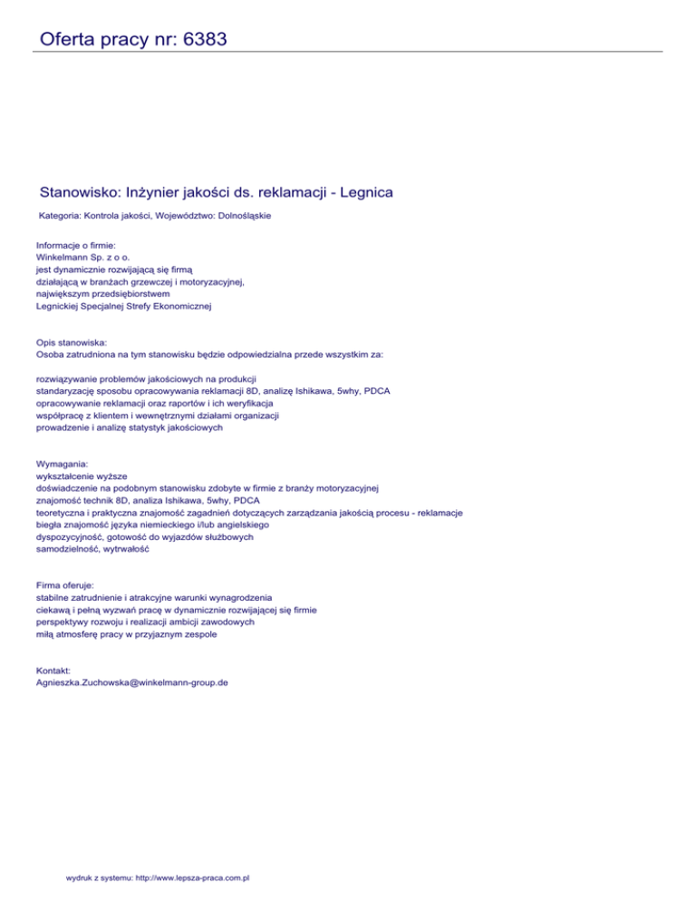 Oferta pracy nr: 6383 Stanowisko: Inżynier jakości ds. reklamacji - Legnica Kategoria: Kontrola jakości, Województwo: Dolnośląskie Informacje o firmie: Winkelmann Sp. z o o. jest dynamicznie rozwijającą się firmą działającą w branżach grzewczej i motoryzacyjnej, największym przedsiębiorstwem Legnickiej Specjalnej Strefy Ekonomicznej Opis stanowiska: Osoba zatrudniona na tym stanowisku będzie odpowiedzialna przede wszystkim za: rozwiązywanie problemów jakościowych na produkcji standaryzację sposobu opracowywania reklamacji 8D, analizę Ishikawa, 5why, PDCA opracowywanie reklamacji oraz raportów i ich weryfikacja współpracę z klientem i wewnętrznymi działami organizacji prowadzenie i analizę statystyk jakościowych Wymagania: wykształcenie wyższe doświadczenie na podobnym stanowisku zdobyte w firmie z branży motoryzacyjnej znajomość technik 8D, analiza Ishikawa, 5why, PDCA teoretyczna i praktyczna znajomość zagadnień dotyczących zarządzania jakością procesu - reklamacje biegła znajomość języka niemieckiego i/lub angielskiego dyspozycyjność, gotowość do wyjazdów służbowych samodzielność, wytrwałość Firma oferuje: stabilne zatrudnienie i atrakcyjne warunki wynagrodzenia ciekawą i pełną wyzwań pracę w dynamicznie rozwijającej się firmie perspektywy rozwoju i realizacji ambicji zawodowych miłą atmosferę pracy w przyjaznym zespole Kontakt: [email protected] wydruk z systemu: http://www.lepsza-praca.com.pl