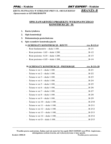 PPAL – Kraków DKT EXPERT – Kraków KRYTA PŁYWALNIA W STRZLINIE PRZY UL. OKULICKIEGO Opracowanie nr KP/1002/B/08/PW BRANŻA B SPIS ZAWARTOŚCI PROJEKTU WYKONAWCZEGO KONSTRUKCJE - B: 1. Karta tytułowa 2. Opis konstrukcji 3. Dokumentacja geotechniczna 4. Spis rysunków konstrukcyjnych A) SCHEMATY KONSTRUKCJI - RZUTY rys. B-1/1÷4 - Rzut fundamentów – skala 1:100 B-1/1 - Rzut poziomu –3,65 – skala 1:200 B-1/2 - Rzut poziomu –0,10 – skala 1:200 B-1/3 - Rzut poziomu +3,05 – skala 1:200 B-1/4 B) SCHEMATY KONSTRUKCJI - PRZEKROJE rys. B-2/1÷28 - Ściana w osi 1 – skala 1:100 B-2/1 - Ściana w osi 2 – skala 1:100 B-2/2 - Ściana w osi 3 – skala 1:100 B-2/3 - Ściana w osi 4 – skala 1:100 B-2/4 - Ściana w osi 5 – skala 1:100 B-2/5 - Ściana w osi 6 – skala 1:100 B-2/6 - Ściana w osi 7 – skala 1:100 B-2/7 - Ściana w osi 8 – skala 1:100 B-2/8 - Ściana w osi 9 – skala 1:100 B-2/9 - Ściana w osi 10 – skala 1:100 B-2/10 - Ściana w osi 11 – skala 1:100 B-2/11 - Ściana w osi 12 – skala 1:100 B-2/12 - Ściana w osi 13 – skala 1:100 B-2/13 - Ściana w osi 14 – skala 1:100 B-2/14 - Ściana w osi O – skala 1:100 B-2/15 Wszelkie prawa zastrzeżone. Żadna część nie może być bez zgody DKT EXPERT oraz PPAL kopiowana , udostępniana osobom trzecim, ani wykorzystywana w inny sposób. Kraków 2008.10 Wszelkie prawa zastrzeżone PPAL – Kraków DKT EXPERT – Kraków KRYTA PŁYWALNIA W STRZLINIE PRZY UL. OKULICKIEGO Opracowanie nr KP/1002/B/08/PW - Ściana w osi N – skala 1:100 BRANŻA B B-2/16 - Ściana w osi L – skala 1:100 B-2/17 - Ściana w osi K – skala 1:100 B-2/18 - Ściana w osi H – skala 1:100 B-2/19 - Ściana w osi G – skala 1:100 B-2/20 - Ściana w osi F – skala 1:100 B-2/21 - Ściana w osi D – skala 1:100 B-2/22 - Ściana w osi B – skala 1:100 B-2/23 - Ściana w osi A – skala 1:100 B-2/24 - Ściana w osi PA – skala 1:100 B-2/25 - Ściana w osi PC – skala 1:100 B-2/26 - Ściana w osi PE – skala 1:100 B-2/27 - Ściana w osi PF – skala 1:100 B-2/28 C) ZBROJENIE FUNDAMENTÓW – STOPY - POZ. 1 rys. B-3/1/1÷37 - Zbrojenie stopy – poz. 1.1.1 – skala 1:20 B-3/1/1 - Zbrojenie stopy – poz. 1.1.2 – skala 1:20 B-3/1/2 - Zbrojenie stopy – poz. 1.1.3 – skala 1:20 B-3/1/3 - Zbrojenie stopy – poz. 1.1.4 – skala 1:20 B-3/1/4 - Zbrojenie stopy – poz. 1.1.5 – skala 1:20 B-3/1/5 - Zbrojenie stopy – poz. 1.1.6 – skala 1:20 B-3/1/6 - Zbrojenie stopy – poz. 1.1.7 – skala 1:20 B-3/1/7 - Zbrojenie stopy – poz. 1.1.8 – skala 1:20 B-3/1/8 - Zbrojenie stopy – poz. 1.1.9 – skala 1:20 B-3/1/9 - Zbrojenie stopy – poz. 1.1.10 – skala 1:20 B-3/1/10 - Zbrojenie stopy – poz. 1.1.11– skala 1:20 B-3/1/11 - Zbrojenie stopy – poz. 1.1.12 – skala 1:20 B-3/1/12 - Zbrojenie stopy – poz. 1.1.13 – skala 1:20 B-3/1/13 - Zbrojenie stopy – poz. 1.1.14 – skala 1:20 B-3/1/14 - Zbrojenie stopy – poz. 1.1.15 – skala 1:20 B-3/1/15 - Zbrojenie stopy – poz. 1.1.16 – skala 1:20 B-3/1/16 Wszelkie prawa zastrzeżone. Żadna część nie może być bez zgody DKT EXPERT oraz PPAL kopiowana , udostępniana osobom trzecim, ani wykorzystywana w inny sposób. Kraków 2008.10 Wszelkie prawa zastrzeżone PPAL – Kraków DKT EXPERT – Kraków KRYTA PŁYWALNIA W STRZLINIE PRZY UL. OKULICKIEGO Opracowanie nr KP/1002/B/08/PW - Zbrojenie stopy – poz. 1.1.17 – skala 1:20 BRANŻA B B-3/1/17 - Zbrojenie stopy – poz. 1.1.18 – skala 1:20 B-3/1/18 - Zbrojenie stopy – poz. 1.1.19 – skala 1:20 B-3/1/19 - Zbrojenie stopy – poz. 1.1.20 – skala 1:20 B-3/1/20 - Zbrojenie stopy – poz. 1.1.21 – skala 1:20 B-3/1/21 - Zbrojenie stopy – poz. 1.1.22 – skala 1:20 B-3/1/22 - Zbrojenie stopy – poz. 1.1.23 – skala 1:20 B-3/1/23 - Zbrojenie stopy – poz. 1.2.1 – skala 1:20 B-3/1/24 - Zbrojenie stopy – poz. 1.2.2 – skala 1:20 B-3/1/25 - Zbrojenie stopy – poz. 1.2.2 – skala 1:20 B-3/1/26 - Zbrojenie stopy – poz. 1.2.3 – skala 1:20 B-3/1/27 - Zbrojenie stopy – poz. 1.2.4 – skala 1:20 B-3/1/28 - Zbrojenie stopy – poz. 1.2.5 – skala 1:20 B-3/1/29 - Zbrojenie stopy – poz. 1.1.9 i 1.7.1 – skala 1:20 B-3/1/30 - Zbrojenie stopy – poz. 1.7.2 – skala 1:20 B-3/1/31 - Zbrojenie stopy – poz. 1.7.3 – skala 1:20 B-3/1/32 - Zbrojenie stopy – poz. 1.7.4 – skala 1:20 B-3/1/33 - Zbrojenie stopy – poz. 1.8.1 – skala 1:20 B-3/1/34 - Zbrojenie stopy – poz. 1.8.2 – skala 1:20 B-3/1/35 - Zbrojenie stopy – poz. 1.8.3 – skala 1:20 B-3/1/36 - Zbrojenie stopy – poz. 1.8.4 – skala 1:20 B-3/1/37 - Zestawienie stali zbrojeniowej D) ZBROJENIE FUNDAMENTÓW – ŁAWY- POZ. 1 rys. B-3/2/1÷18 - Zbrojenie ławy – poz. 1.3.1 – skala 1:20 B-3/2/1 - Zbrojenie ławy – poz. 1.1.2 – skala 1:20 B-3/2/2 - Zbrojenie ławy – poz. 1.1.3 – skala 1:20 B-3/2/3 - Zbrojenie ławy – poz. 1.1.4 – skala 1:20 B-3/2/4 - Zbrojenie ławy – poz. 1.1.5 – skala 1:20 B-3/2/5 - Zbrojenie ławy – poz. 1.1.6 – skala 1:20 B-3/2/6 - Zbrojenie ławy – poz. 1.1.7 – skala 1:20 B-3/2/7 Wszelkie prawa zastrzeżone. Żadna część nie może być bez zgody DKT EXPERT oraz PPAL kopiowana , udostępniana osobom trzecim, ani wykorzystywana w inny sposób. Kraków 2008.10 Wszelkie prawa zastrzeżone PPAL – Kraków DKT EXPERT – Kraków KRYTA PŁYWALNIA W STRZLINIE PRZY UL. OKULICKIEGO Opracowanie nr KP/1002/B/08/PW - Zbrojenie ławy – poz. 1.1.8 – skala 1:20 BRANŻA B B-3/2/8 - Zbrojenie ławy – poz. 1.1.9 – skala 1:20 B-3/2/9 - Zbrojenie ławy – poz. 1.1.10 – skala 1:20 B-3/2/10 - Zbrojenie ławy – poz. 1.1.11 – skala 1:20 B-3/2/11 - Zbrojenie ławy – poz. 1.1.12 – skala 1:20 B-3/2/12 - Zbrojenie ławy – poz. 1.4.1 – skala 1:20 B-3/2/13 - Zbrojenie ławy – poz. 1.4.2 – skala 1:20 B-3/2/14 - Zbrojenie ławy – poz. 1.4.3 – skala 1:20 B-3/2/15 - Zbrojenie ławy – poz. 1.4.3 – skala 1:20 B-3/2/16 - Zbrojenie ławy – poz. 1.4.5 – skala 1:20 B-3/2/17 - Zbrojenie ławy –