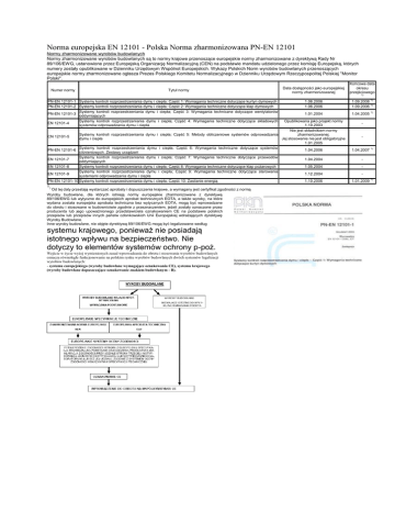 Norma europejska EN 12101 - Polska Norma zharmonizowana PN-EN 12101 Normy zharmonizowane wyrobów budowlanych Normy zharmonizowane wyrobów budowlanych są to normy krajowe przenoszące europejskie normy zharmonizowane z dyrektywą Rady Nr 89/106/EWG, ustanowione przez Europejską Organizację Normalizacyjną (CEN) na podstawie mandatu udzielonego przez komisję Europejską, których numery zostały opublikowane w Dzienniku Urzędowym Wspólnot Europejskich. Wykazy Polskich Norm wyrobów budowlanych przenoszących europejskie normy zharmonizowane ogłasza Prezes Polskiego Komitetu Normalizacyjnego w Dzienniku Urzędowym Rzeczypospolitej Polskiej "Monitor Polski". Numer normy Tytuł normy PN-EN 12101-1 Systemy kontroli rozprzestrzeniania dymu i ciepła; Część 1: Wymagania techniczne dotyczące kurtyn dymowych PN-EN 12101-2 Systemy kontroli rozprzestrzeniania dymu i ciepła; Część 2: Wymagania techniczne dotyczące klap dymowych Systemy kontroli rozprzestrzeniania dymu i ciepła; Część 3: Wymagania techniczne dotyczące wentylatorów PN-EN 12101-3 oddymiających Systemy kontroli rozprzestrzeniania dymu i ciepła; Część 4: Wymagania techniczne dotyczące składowych EN 12101-4 systemów odprowadzania dymu i ciepła Data dostępności jako europejskiej normy zharmonizowanej Końcowa data okresu przejściowego 1.06.2006 1.06.2006 1.09.2008 1) 1.09.2006 1) 1.01.2004 1.04.2005 1) Opublikowana jako projekt normy 1.10.2003 Nie jest składnikiem normy Systemy kontroli rozprzestrzeniania dymu i ciepła; Część 5: Metody obliczeniowe systemów odprowadzania zharmonizowanej. CN 12101-5 dymu i ciepła Jej stosowanie nie jest obligatoryjne 1.01.2005 Systemy kontroli rozprzestrzeniania dymu i ciepła; Część 6: Wymagania techniczne dotyczące systemów PN-EN 12101-6 1.04.2006 ciśnieniowych. Zestawy urządzeń Systemy kontroli rozprzestrzeniania dymu i ciepła; Część 7: Wymagania techniczne dotyczące przewodów EN 12101-7 1.04.2004 oddymiających Systemy kontroli rozprzestrzeniania dymu i ciepła; Część 8: Wymagania techniczne dotyczące klap pożarowych Systemy kontroli rozprzestrzeniania dymu i ciepła; Część 9: Wymagania techniczne dotyczące sterowania EN 12101-9 systemami odprowadzania dymu i ciepła PN-EN 12101-10 Systemy kontroli rozprzestrzeniania dymu i ciepła; Część 10: Zasilanie energią EN 12101-8 1) Od tej daty przestają wystarczać aprobaty i dopuszczenia krajowe, a wymagany jest certyfikat zgodności z normą Wyroby budowlane, dla których istnieją normy europejskie zharmonizowane z dyrektywą 89/106/EWG lub wytyczne do europejskich aprobat technicznych EOTA, a także wyroby, na które wydana została europejska aprobata techniczna bez wytycznych EOTA, mogą być wprowadzane do obrotu i stosowane w budownictwie zgodnie z przeznaczeniem, jeżeli zostały oznaczone przez producenta lub jego upoważnionego przedstawiciela oznakowaniem CE na podstawie polskich przepisów lub przepisów innych państw członkowskich Unii Europejskiej wdrażających dyrektywę Wyroby Budowlane. Inne wyroby budowlane, nie objęte dyrektywą 89/106/EWG mogą być legalizowane według systemu krajowego, ponieważ nie posiadają istotnego wpływu na bezpieczeństwo. Nie dotyczy to elementów systemów ochrony p-poż. Wejście w życie wyżej wymienionych zasad wprowadzania do obrotu i stosowania wyrobów budowlanych oznacza równoległe funkcjonowanie na polskim rynku wyrobów budowlanych dwóch systemów legalizacji wyrobów budowlanych: - systemu europejskiego (wyroby budowlane wymagające oznakowania CE), systemu krajowego (wyroby budowlane dopuszczające oznakowanie znakiem budowlanym - B). 1.05.2004 1) - - 1.04.2007 1) - 1.12.2004 - 1.10.2006 1.01.2009 1)