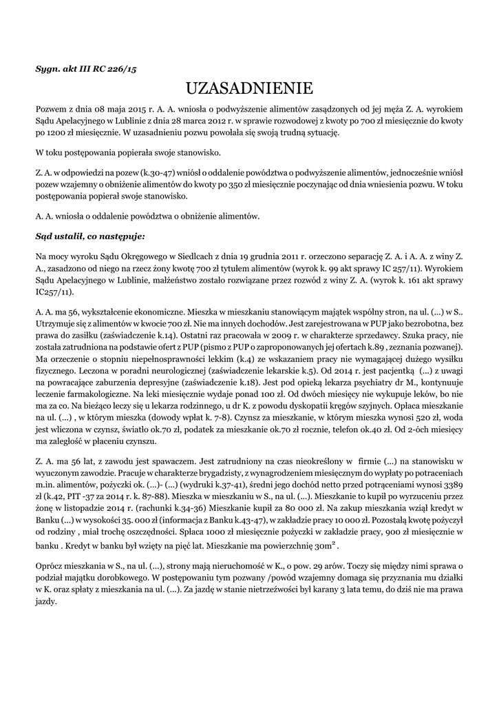 Sygn. akt III RC 226/15 UZASADNIENIE Pozwem z dnia 08 maja 2015 r. A. A. wniosła o podwyższenie alimentów zasądzonych od jej męża Z. A. wyrokiem Sądu Apelacyjnego w Lublinie z dnia 28 marca 2012 r. w sprawie rozwodowej z kwoty po 700 zł miesięcznie do kwoty po 1200 zł miesięcznie. W uzasadnieniu pozwu powołała się swoją trudną sytuację. W toku postępowania popierała swoje stanowisko. Z. A. w odpowiedzi na pozew (k.30-47) wniósł o oddalenie powództwa o podwyższenie alimentów, jednocześnie wniósł pozew wzajemny o obniżenie alimentów do kwoty po 350 zł miesięcznie poczynając od dnia wniesienia pozwu. W toku postępowania popierał swoje stanowisko. A. A. wniosła o oddalenie powództwa o obniżenie alimentów. Sąd ustalił, co następuje: Na mocy wyroku Sądu Okręgowego w Siedlcach z dnia 19 grudnia 2011 r. orzeczono separację Z. A. i A. A. z winy Z. A., zasadzono od niego na rzecz żony kwotę 700 zł tytułem alimentów (wyrok k. 99 akt sprawy IC 257/11). Wyrokiem Sądu Apelacyjnego w Lublinie, małżeństwo zostało rozwiązane przez rozwód z winy Z. A. (wyrok k. 161 akt sprawy IC257/11). A. A. ma 56, wykształcenie ekonomiczne. Mieszka w mieszkaniu stanowiącym majątek wspólny stron, na ul. (...) w S.. Utrzymuje się z alimentów w kwocie 700 zł. Nie ma innych dochodów. Jest zarejestrowana w PUP jako bezrobotna, bez prawa do zasiłku (zaświadczenie k.14). Ostatni raz pracowała w 2009 r. w charakterze sprzedawcy. Szuka pracy, nie została zatrudniona na podstawie ofert z PUP (pismo z PUP o zaproponowanych jej ofertach k.89 , zeznania pozwanej). Ma orzeczenie o stopniu niepełnosprawności lekkim (k.4) ze wskazaniem pracy nie wymagającej dużego wysiłku fizycznego. Leczona w poradni neurologicznej (zaświadczenie lekarskie k.5). Od 2014 r. jest pacjentką (...) z uwagi na powracające zaburzenia depresyjne (zaświadczenie k.18). Jest pod opieką lekarza psychiatry dr M., kontynuuje leczenie farmakologiczne. Na leki miesięcznie wydaje ponad 100 zł. Od dwóch miesięcy nie wykupuje leków, bo nie ma za co. Na bieżąco leczy się u lekarza rodzinnego, u dr K. z powodu dyskopatii kręgów szyjnych. Opłaca mieszkanie na ul. (...) , w którym mieszka (dowody wpłat k. 7-8). Czynsz za mieszkanie, w którym mieszka wynosi 520 zł, woda jest wliczona w czynsz, światło ok.70 zł, podatek za mieszkanie ok.70 zł rocznie, telefon ok.40 zł. Od 2-óch miesięcy ma zaległość w płaceniu czynszu. Z. A. ma 56 lat, z zawodu jest spawaczem. Jest zatrudniony na czas nieokreślony w firmie (...) na stanowisku w wyuczonym zawodzie. Pracuje w charakterze brygadzisty, z wynagrodzeniem miesięcznym do wypłaty po potraceniach m.in. alimentów, pożyczki ok. (...)- (...) (wydruki k.37-41), średni jego dochód netto przed potrąceniami wynosi 3389 zł (k.42, PIT -37 za 2014 r. k. 87-88). Mieszka w mieszkaniu w S., na ul. (...). Mieszkanie to kupił po wyrzuceniu przez żonę w listopadzie 2014 r. (rachunki k.34-36) Mieszkanie kupił za 80 000 zł. Na zakup mieszkania wziął kredyt w Banku (...) w wysokości 35. 000 zł (informacja z Banku k.43-47), w zakładzie pracy 10 000 zł. Pozostałą kwotę pożyczył od rodziny , miał trochę oszczędności. Spłaca 1000 zł miesięcznie pożyczki w zakładzie pracy, 900 zł miesięcznie w banku . Kredyt w banku był wzięty na pięć lat. Mieszkanie ma powierzchnię 30m2 . Oprócz mieszkania w S., na ul. (...), strony mają nieruchomość w K., o pow. 29 arów. Toczy się między nimi sprawa o podział majątku dorobkowego. W postępowaniu tym pozwany /powód wzajemny domaga się przyznania mu działki w K. oraz spłaty z mieszkania na ul. (...). Za jazdę w stanie nietrzeźwości był karany 3 lata temu, do dziś nie ma prawa jazdy. Powyższy stan faktyczny sąd ustalił na podstawie zeznań stron ( k.92-94v) oraz wskazanych dokumentów. Stan faktyczny co do zasady nie był kwestionowany, strony natomiast prezentując swoje stanowiska negowały możliwość podwyższenia bądź obniżenia alimentów . Sąd zważył, co następuje: Powództwo o podwyższenie alimentów nie jest zasadne i jako takie zostało oddalone. Zgodnie z art. 138 k.r.o. można żądać zmiany orzeczenia dotyczącego obowiązku alimentacyjnego w razie zmiany stosunków. Zmiana stosunków może prowadzić do uchylenia obowiązku alimentacyjnego bądź do podwyższenia lub obniżenia alimentów. W ocenie Sądu A. A. nie wykazała , by w okresie od ustalenia obowiązku alimentacyjnego męża wobec niej nastąpiła taka zmiana jej sytuacji majątkowej , zdrowotnej, by alimenty należało podwyższyć i to do kwoty żądanej w pozwie. Nie kwestionowane jest, że strony mają majątek wspólny, o który toczy się spór oraz że pozwany ma majątek odrębny w postaci zakupionego mieszkania na ul. (...), które utrzymuje. Nową okolicznością jest zaliczenie powódki/ pozwanej wzajemnej do osób niepełnosprawnych w stopniu lekkim. Nie zostało jednak wykazane, by w sposób istotny wpłynęło to na wydatki powódki/pozwanej wzajemnej. W dalszym ciągu ma ona możliwości podjęcia zatrudnienia z ograniczeniem wynikającym z zaświadczenia- ze wskazaniem pracy nie wymagającej dużego wysiłku fizycznego. A. A. w okresie od 2009 r. do 2015 r uzyskała kilkanaście propozycji pracy. Czasokres tych propozycji wskazuje, iż otrzymywała je zarówno przed uzyskaniem orzeczenia o niepełnosprawności, jak i po jego uzyskaniu. Powódka w zeznaniach swoich (k.93) podawała przyczyny nie podjęcia zatrudniania. W ocenie Sądu nie zostało wykazane, by we wszystkich propozycjach pracy , nie podjęcie zatrudniania miało miejsce z przyczyn od niej niezależnych. Należy mieć na uwadze, iż stopień niepełnosprawności nie dyskwalifikuje jej do podjęcia zatrudniania. W przeciwnym razie , gdyby miała stwierdzoną całkowitą niezdolność do pracy, nie byłaby zarejestrowana w PUP jako bezrobotna. W ocenie sądu powódka/pozwana wzajemna nie wykorzystuje swoi