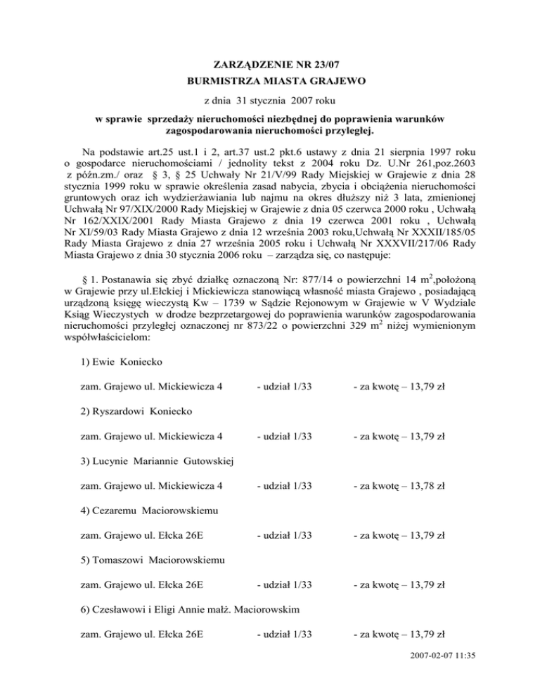 ZARZĄDZENIE NR 23/07 BURMISTRZA MIASTA GRAJEWO z dnia 31 stycznia 2007 roku w sprawie sprzedaŜy nieruchomości niezbędnej do poprawienia warunków zagospodarowania nieruchomości przyległej. Na podstawie art.25 ust.1 i 2, art.37 ust.2 pkt.6 ustawy z dnia 21 sierpnia 1997 roku o gospodarce nieruchomościami / jednolity tekst z 2004 roku Dz. U.Nr 261,poz.2603 z późn.zm./ oraz § 3, § 25 Uchwały Nr 21/V/99 Rady Miejskiej w Grajewie z dnia 28 stycznia 1999 roku w sprawie określenia zasad nabycia, zbycia i obciąŜenia nieruchomości gruntowych oraz ich wydzierŜawiania lub najmu na okres dłuŜszy niŜ 3 lata, zmienionej Uchwałą Nr 97/XIX/2000 Rady Miejskiej w Grajewie z dnia 05 czerwca 2000 roku , Uchwałą Nr 162/XXIX/2001 Rady Miasta Grajewo z dnia 19 czerwca 2001 roku , Uchwałą Nr XI/59/03 Rady Miasta Grajewo z dnia 12 września 2003 roku,Uchwałą Nr XXXII/185/05 Rady Miasta Grajewo z dnia 27 września 2005 roku i Uchwałą Nr XXXVII/217/06 Rady Miasta Grajewo z dnia 30 stycznia 2006 roku – zarządza się, co następuje: § 1. Postanawia się zbyć działkę oznaczoną Nr: 877/14 o powierzchni 14 m2,połoŜoną w Grajewie przy ul.Ełckiej i Mickiewicza stanowiącą własność miasta Grajewo , posiadającą urządzoną księgę wieczystą Kw – 1739 w Sądzie Rejonowym w Grajewie w V Wydziale Ksiąg Wieczystych w drodze bezprzetargowej do poprawienia warunków zagospodarowania nieruchomości przyległej oznaczonej nr 873/22 o powierzchni 329 m2 niŜej wymienionym współwłaścicielom: 1) Ewie Koniecko zam. Grajewo ul. Mickiewicza 4 - udział 1/33 - za kwotę – 13,79 zł - udział 1/33 - za kwotę – 13,79 zł - udział 1/33 - za kwotę – 13,78 zł - udział 1/33 - za kwotę – 13,79 zł - udział 1/33 - za kwotę – 13,79 zł 2) Ryszardowi Koniecko zam. Grajewo ul. Mickiewicza 4 3) Lucynie Mariannie Gutowskiej zam. Grajewo ul. Mickiewicza 4 4) Cezaremu Maciorowskiemu zam. Grajewo ul. Ełcka 26E 5) Tomaszowi Maciorowskiemu zam. Grajewo ul. Ełcka 26E 6) Czesławowi i Eligi Annie małŜ. Maciorowskim zam. Grajewo ul. Ełcka 26E - udział 1/33 - za kwotę – 13,79 zł 2007-02-07 11:35 7) Sławomirowi Olszewskiemu zam. Grajewo ul. Ełcka 26 C - udział 2/11 - za kwotę – 82,74 zł 8) Barbarze i Stanisławowi małŜ. Kwit zam. Grajewo ul.Ełcka 26A - udział 1/11 - za kwotę – 41,37 zł 9) Alinie i Ryszardowi małŜ. Chilińskim zam. Grajewo ul. Ełcka 44 - udział 1/11 - za kwotę – 41,37 zł 10) Stanisławie i Janowi małŜ. Sulewskim zam. Grajewo Os. Centrum 8/20 - udział 1/11 - za kwotę – 41,37 zł 11) Krystynie i Władysławowi małŜ. Bud - Gusajim zam. Grajewo ul. Mickiewicza 2 - udział 2/11 - za kwotę – 82,74 zł - udział 1/11 - za kwotę - 41,37 zł 12) Robertowi Próchniak zam.Grajewo ul.Mickiewicza 6 13) BoŜenie i Andrzejowi małŜ.Kudrawiec zam.Grajewo ul.Ełcka 24 - udział 1/11 - za kwotę - 41,37 zł Zbycie nastąpi na rzecz w/w za łączną kwotę 373,00 zł /słownie złotych:trzysta siedemdziesiąt trzy /.Do kwoty dolicza się podatek VAT w wysokości 22 % co stanowi kwotę 82,06 zł /słownie złotych: osiemdziesiąt dwa 06/100 /. Łączna kwota z podatkiem VAT wynosi 455,06 zł /słownie złotych: czterysta pięćdziesiąt pięć 06/100/. § 2. Niniejsze zarządzenie stanowi podstawę do złoŜenia oświadczenia woli w formie aktu notarialnego. § 3. Zarządzenie wchodzi w Ŝycie z dniem podpisania. Burmistrz Miasta Grajewo Krzysztof Waszkiewicz 2007-02-07 11:35
