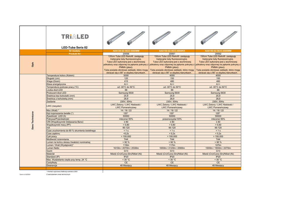 LED-Tuba Seria 02 Opis Nr modelu Produkt Nr: Temperatura koloru (Kelwin) Długość (cm) Waga (Gram) Klasa energetyczna Temperatura podczas pracy (°C) Liczba diod LED Producent diod LED Średnica bez końcówki (mm) Średnica z końcówką (mm) Zasilanie Dane Techniczne LWC (rezystor) Moc (Watt) * Kąt rozproszenia światła (°) Żywotność LED (h) Pokrywa/Przenikalność CRI (Współczynnik Oddawania Barw) Współczynnik mocy (PF) mA Czas uruchomienia do 60 % strumienia świetlnego Czas zapłonu Cykl pracy Możliwość ściemniania Lumen na końcu okresu trwałości nominalnej Lumen / Watt (Wydajność)* Lumen Netto Gwint Materiał Standard (IP) Max. Wydzielanie ciepła przy temp. 24 °C Certyfikaty Gwarancja * Wartość wyjściowa (Kalibracja wartości) 230V Dane na 10/2014 Z zastrzeżeniem zmian technicznych AAA120-02-5633-5000MM AAA150-02-5633-4000KK AAA150-02-5633-4000MM 20056 20061 20062 120cm Tuba LED Retrofit zastępuję 150cm Tuba LED Retrofit zastępuję 150cm Tuba LED Retrofit zastępuję tradycyjne tuby fluorescencyjne. tradycyjne tuby fluorescencyjne. tradycyjne tuby fluorescencyjne. Tuba LED wykonana jest z aluminiowej Tuba LED wykonana jest z aluminiowej Tuba LED wykonana jest z aluminiowej półosłony oraz odpornej na pękanie pokrywy z półosłony oraz odpornej na pękanie pokrywy z półosłony oraz odpornej na pękanie pokrywy z PMMA (plexi). PMMA (plexi). PMMA (plexi). Tuba posiada obrotowe zaślepki, które mogą Tuba posiada obrotowe zaślepki, które mogą Tuba posiada obrotowe zaślepki, które mogą obracać się o 90° w obydwu kierunkach. obracać się o 90° w obydwu kierunkach. obracać się o 90° w obydwu kierunkach. 5000 4000 4000 120 150 150 415 480 480 A++ A++ A++ od -30°C do 50°C od -30°C do 50°C od -30°C do 50°C 88 88 88 Samsung 5630 Samsung 5630 Samsung 5630 25,9 25,9 25,9 28,9 28,9 28,9 230V, 50Hz 230V, 50Hz 230V, 50Hz LWC Zielony / LWC Niebieski / LWC Zielony / LWC Niebieski / LWC Zielony / LWC Niebieski / LWC Pomarańczowy LWC Pomarańczowy LWC Pomarańczowy 14 / 18 / 22 14 / 18 / 22 14 / 18 / 22 120° 120° 120° 50000 50000 50000 mleczna/ 85% przezroczysta/ 93% mleczna/ 85% ≥ 80 ≥ 80 ≥ 80 > 0,80 > 0,80 > 0,80 95-120 95-120 95-120 <1s <1s <1s <0,2s < 0,2s < 0,2s > 100.000 > 100.000 > 100.000 TAK TAK TAK > 90 % > 90 % > 90 % 115lm 117lm 107lm 1610lm / 2070lm / 2530lm 1650lm / 2120lm / 2590lm 1500lm / 1930lm / 2370lm G13 G13 G13 Miedź (Cn)/Cyna (Sn)/Nikiel (Ni) Miedź (Cn)/Cyna (Sn)/Nikiel (Ni) Miedź (Cn)/Cyna (Sn)/Nikiel (Ni) IP20 IP20 IP20 < 30 °C < 30 °C < 30 °C CE CE CE 48 Miesięcy 48 Miesięcy 48 Miesięcy LED-Tuba Seria 02 Opis Nr modelu Produkt Nr: Temperatura koloru (Kelwin) Długość (cm) Waga (Gram) Klasa energetyczna Temperatura podczas pracy (°C) Liczba diod LED Producent diod LED Średnica bez końcówki (mm) Średnica z końcówką (mm) Zasilanie Dane Techniczne LWC (rezystor) Moc (Watt) * Kąt rozproszenia światła (°) Żywotność LED (h) Pokrywa/Przenikalność CRI (Współczynnik Oddawania Barw) Współczynnik mocy (PF) mA Czas uruchomienia do 60 % strumienia świetlnego Czas zapłonu Cykl pracy Możliwość ściemniania Lumen na końcu okresu trwałości nominalnej Lumen / Watt (Wydajność)* Lumen Netto Gwint Materiał Standard (IP) Max. Wydzielanie ciepła przy temp. 24 °C Certyfikaty Gwarancja * Wartość wyjściowa (Kalibracja wartości) 230V Dane na 10/2014 Z zastrzeżeniem zmian technicznych AAA150-02-5633-5000KK AAA150-02-5633-5000MM 20063 20064 150cm Tuba LED Retrofit zastępuję 150cm Tuba LED Retrofit zastępuję tradycyjne tuby fluorescencyjne. tradycyjne tuby fluorescencyjne. Tuba LED wykonana jest z aluminiowej Tuba LED wykonana jest z aluminiowej półosłony oraz odpornej na pękanie pokrywy z półosłony oraz odpornej na pękanie pokrywy z PMMA (plexi). PMMA (plexi). Tuba posiada obrotowe zaślepki, które mogą Tuba posiada obrotowe zaślepki, które mogą obracać się o 90° w obydwu kierunkach. obracać się o 90° w obydwu kierunkach. 5000 5000 150 150 480 480 A++ A++ od -30°C do 50°C od -30°C do 50°C 88 88 Samsung 5630 Samsung 5630 25,9 25,9 28,9 28,9 230V, 50Hz 230V, 50Hz LWC Zielony / LWC Niebieski / LWC Zielony / LWC Niebieski / LWC Pomarańczowy LWC Pomarańczowy 14 / 18 / 22 14 / 18 / 22 120° 120° 50000 50000 przezroczysta/ 93% mleczna/ 85% ≥ 80 ≥ 80 > 0,80 > 0,80 95-120 95-120 <1s <1s < 0,2s < 0,2s > 100.000 > 100.000 TAK TAK > 90 % > 90 % 125lm 115lm 1760lm / 2260lm / 2770lm 1610lm / 2070lm / 2530lm G13 G13 Miedź (Cn)/Cyna (Sn)/Nikiel (Ni) Miedź (Cn)/Cyna (Sn)/Nikiel (Ni) IP20 IP20 < 30 °C < 30 °C CE CE 48 Miesięcy 48 Miesięcy