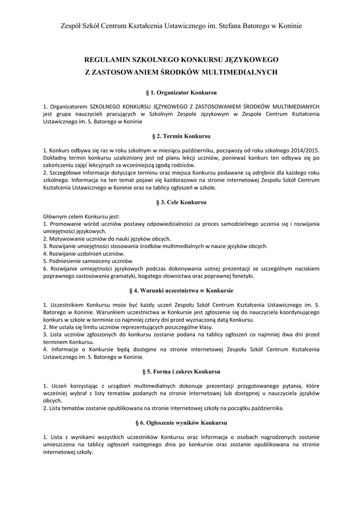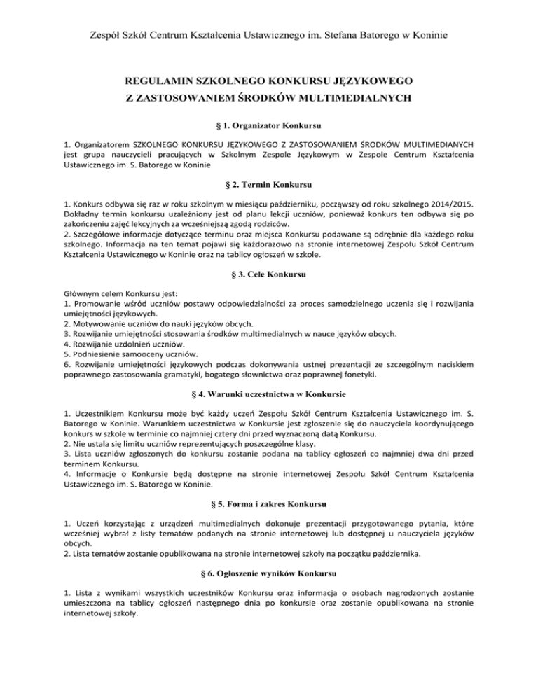 Zespół Szkół Centrum Kształcenia Ustawicznego im. Stefana Batorego w Koninie REGULAMIN SZKOLNEGO KONKURSU JĘZYKOWEGO Z ZASTOSOWANIEM ŚRODKÓW MULTIMEDIALNYCH § 1. Organizator Konkursu 1. Organizatorem SZKOLNEGO KONKURSU JĘZYKOWEGO Z ZASTOSOWANIEM ŚRODKÓW MULTIMEDIANYCH jest grupa nauczycieli pracujących w Szkolnym Zespole Językowym w Zespole Centrum Kształcenia Ustawicznego im. S. Batorego w Koninie § 2. Termin Konkursu 1. Konkurs odbywa się raz w roku szkolnym w miesiącu październiku, począwszy od roku szkolnego 2014/2015. Dokładny termin konkursu uzależniony jest od planu lekcji uczniów, ponieważ konkurs ten odbywa się po zakończeniu zajęć lekcyjnych za wcześniejszą zgodą rodziców. 2. Szczegółowe informacje dotyczące terminu oraz miejsca Konkursu podawane są odrębnie dla każdego roku szkolnego. Informacja na ten temat pojawi się każdorazowo na stronie internetowej Zespołu Szkół Centrum Kształcenia Ustawicznego w Koninie oraz na tablicy ogłoszeń w szkole. § 3. Cele Konkursu Głównym celem Konkursu jest: 1. Promowanie wśród uczniów postawy odpowiedzialności za proces samodzielnego uczenia się i rozwijania umiejętności językowych. 2. Motywowanie uczniów do nauki języków obcych. 3. Rozwijanie umiejętności stosowania środków multimedialnych w nauce języków obcych. 4. Rozwijanie uzdolnień uczniów. 5. Podniesienie samooceny uczniów. 6. Rozwijanie umiejętności językowych podczas dokonywania ustnej prezentacji ze szczególnym naciskiem poprawnego zastosowania gramatyki, bogatego słownictwa oraz poprawnej fonetyki. § 4. Warunki uczestnictwa w Konkursie 1. Uczestnikiem Konkursu może być każdy uczeń Zespołu Szkół Centrum Kształcenia Ustawicznego im. S. Batorego w Koninie. Warunkiem uczestnictwa w Konkursie jest zgłoszenie się do nauczyciela koordynującego konkurs w szkole w terminie co najmniej cztery dni przed wyznaczoną datą Konkursu. 2. Nie ustala się limitu uczniów reprezentujących poszczególne klasy. 3. Lista uczniów zgłoszonych do konkursu zostanie podana na tablicy ogłoszeń co najmniej dwa dni przed terminem Konkursu. 4. Informacje o Konkursie będą dostępne na stronie internetowej Zespołu Szkół Centrum Kształcenia Ustawicznego im. S. Batorego w Koninie. § 5. Forma i zakres Konkursu 1. Uczeń korzystając z urządzeń multimedialnych dokonuje prezentacji przygotowanego pytania, które wcześniej wybrał z listy tematów podanych na stronie internetowej lub dostępnej u nauczyciela języków obcych. 2. Lista tematów zostanie opublikowana na stronie internetowej szkoły na początku października. § 6. Ogłoszenie wyników Konkursu 1. Lista z wynikami wszystkich uczestników Konkursu oraz informacja o osobach nagrodzonych zostanie umieszczona na tablicy ogłoszeń następnego dnia po konkursie oraz zostanie opublikowana na stronie internetowej szkoły. Zespół Szkół Centrum Kształcenia Ustawicznego im. Stefana Batorego w Koninie § 7. Przebieg konkursu. 1. Konkurs składa się wyłącznie z jednego etapu. 2. Czas trwania jednej prezentacji nie może przekraczać 5 minut, ale nie może być krótszy niż 3 minuty. 3. Uczeń w czasie prezentacji tematu nie może dokonywać odczytu prezentacji. Może jednak korzystać z notatek, lub jednostkowych informacji zapisanych w prezentacji. 4. Uczeń ma do dyspozycji laptop szkolny, rzutnik multimedialny, radio CD. 5. Uczestnik konkursu jest oceniany przez komisję konkursową uzyskując od 0 do 5 punktów od każdego członka jury. Liczba nauczycieli oceniających wypowiedzi uczestników nie może być mniejsza niż dwie osoby i nie większa niż cztery osoby. Oceniane są następujące rzeczy: - adekwatne zastosowanie środków multimedialnych - poprawne użycie środków językowych - oryginalne przedstawienie tematu - sprawność środków językowych - płynność językowa 3. W przypadku uzyskania przez dwóch lub więcej uczniów identycznej liczby punktów, przyznaje się miejsca równoległe. 4. Nadzór nad prawidłowym przebiegiem Konkursu przejmuje Komisja Konkursowa. § 8. Nagrody 1. Uczniowie, którzy uzyskali pierwsze, drugie lub trzecie miejsce w Konkursie uzyskują następujące nagrody: a) dyplom, b) nagroda książkowa lub inna nagroda, c) za pierwsze miejsce - celująca ocena cząstkowa z języka obcego (jakim posługiwał się uczestnik konkursu podczas prezentacji), d) za drugie i trzecie miejsce - bardzo dobra ocena cząstkowa z języka obcego. §9. Postanowienia końcowe 1. Regulamin Konkursu dostępny jest w siedzibie Organizatora oraz na stronie internetowej szkoły. 2. Przystępując do Konkursu uczestnik potwierdza, iż akceptuje niniejszy Regulamin i opisane w nim warunki uczestnictwa. 3. Uczestnik Konkursu poprzez udział w Konkursie wyraża zgodę na przetwarzanie jego danych osobowych w celu związanym z realizacją Konkursu i sposobem ogłaszania wyników. 4. W kwestiach spornych oraz innych nieuregulowanych w niniejszym Regulaminie decydujący głos ma Komisja Konkursowa. 5. Organizator Konkursu ma prawo modyfikacji Regulaminu. W takim przypadku wszelkie zmiany zostają podane do wiadomości uczestników Konkursu poprzez umieszczenie ich na stronie internetowej Zespołu Centrum Kształcenia Ustawicznego. Organizatorzy konkursu: Adrian Krajewski, Jolanta Nowak, Magdalena Szeflińska, Marta Sieradzan