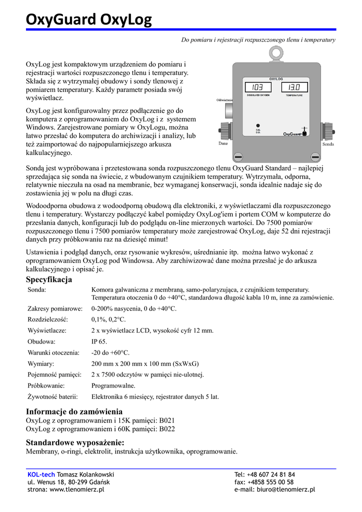 OxyGuard OxyLog Do pomiaru i rejestracji rozpuszczonego tlenu i temperatury OxyLog jest kompaktowym urządzeniem do pomiaru i rejestracji wartości rozpuszczonego tlenu i temperatury. Składa się z wytrzymałej obudowy i sondy tlenowej z pomiarem temperatury. Każdy parametr posiada swój wyświetlacz. OxyLog jest konfigurowalny przez podłączenie go do komputera z oprogramowaniem do OxyLog i z systemem Windows. Zarejestrowane pomiary w OxyLogu, można łatwo przesłać do komputera do archiwizacji i analizy, lub też zaimportować do najpopularniejszego arkusza kalkulacyjnego. Sondą jest wypróbowana i przetestowana sonda rozpuszczonego tlenu OxyGuard Standard – najlepiej sprzedająca się sonda na świecie, z wbudowanym czujnikiem temperatury. Wytrzymała, odporna, relatywnie nieczuła na osad na membranie, bez wymaganej konserwacji, sonda idealnie nadaje się do zostawienia jej w polu na długi czas. Wodoodporna obudowa z wodoodporną obudową dla elektroniki, z wyświetlaczami dla rozpuszczonego tlenu i temperatury. Wystarczy podłączyć kabel pomiędzy OxyLog'iem i portem COM w komputerze do przesłania danych, konfiguracji lub do podglądu on-line mierzonych wartości. Do 7500 pomiarów rozpuszczonego tlenu i 7500 pomiarów temperatury może zarejestrować OxyLog, daje 52 dni rejestracji danych przy próbkowaniu raz na dziesięć minut! Ustawienia i podgląd danych, oraz rysowanie wykresów, uśrednianie itp. można łatwo wykonać z oprogramowaniem OxyLog pod Windowsa. Aby zarchiwizować dane można przesłać je do arkusza kalkulacyjnego i opisać je. Specyfikacja Sonda: Komora galwaniczna z membraną, samo-polaryzująca, z czujnikiem temperatury. Temperatura otoczenia 0 do +40°C, standardowa długość kabla 10 m, inne za zamówienie. Zakresy pomiarowe: 0-200% nasycenia, 0 do +40°C. Rozdzielczość: 0,1%, 0,2°C. Wyświetlacze: 2 x wyświetlacz LCD, wysokość cyfr 12 mm. Obudowa: IP 65. Warunki otoczenia: -20 do +60°C. Wymiary: 200 mm x 200 mm x 100 mm (SxWxG) Pojemność pamięci: 2 x 7500 odczytów w pamięci nie-ulotnej. Próbkowanie: Programowalne. Żywotność baterii: Elektronika 6 miesięcy, rejestrator danych 5 lat. Informacje do zamówienia OxyLog z oprogramowaniem i 15K pamięci: B021 OxyLog z oprogramowaniem i 60K pamięci: B022 Standardowe wyposażenie: Membrany, o-ringi, elektrolit, instrukcja użytkownika, oprogramowanie. KOL-tech Tomasz Kolankowski ul. Wenus 18, 80-299 Gdańsk strona: www.tlenomierz.pl Tel: +48 607 24 81 84 fax: +4858 555 00 58 e-mail: [email protected]