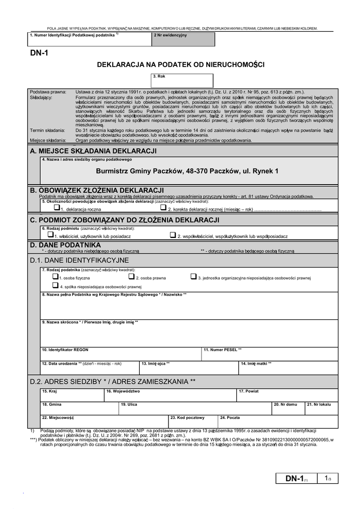 POLA JASNE WYPE NIA PODATNIK. WYPE NIA NA MASZYNIE, KOMPUTEROWO LUB R CZNIE, DU YMI DRUKOWANYMI LITERAMI, CZARNYM LUB NIEBIESKIM KOLOREM. 1. Numer Identyfikacji Podatkowej podatnika 1) 2 Nr ewidencyjny DN-1 DEKLARACJA NA PODATEK OD NIERUCHOMO CI 3. Rok Podstawa prawna: Sk adaj cy: Termin sk adania: Miejsce sk adania: Ustawa z dnia 12 stycznia 1991 r. o podatkach i op atach lokalnych (t.j. Dz. U. z 2010 r. Nr 95, poz. 613 z pó n. zm.). Formularz przeznaczony dla osób prawnych, jednostek organizacyjnych oraz spóek niemaj cych osobowo ci prawnej b d cych w a cicielami nieruchomo ci lub obiektów budowlanych, posiadaczami samoistnymi nieruchomo ci lub obiektów budowlanych, u ytkownikami wieczystymi gruntów, posiadaczami nieruchomo ci lub ich cz ci albo obiektów budowlanych lub ich cz ci, stanowi cych w asno Skarbu Pa stwa lub jednostki samorz du terytorialnego oraz dla osób fizycznych b d cych wspó w a cicielami lub wspóposiadaczami z osobami prawnymi, b d z innymi jednostkami organizacyjnymi nieposiadaj cymi osobowo ci prawnej lub ze spó kami nieposiadaj cymi osobowo ci prawnej, z wyj tkiem osób fizycznych tworz cych wspólnot mieszkaniow . Do 31 stycznia ka dego roku podatkowego lub w terminie 14 dni od zaistnienia okoliczno ci maj cych wp yw na powstanie b d wyga ni cie obowi zku podatkowego, lub wysoko opodatkowania. Organ podatkowy w a ciwy ze wzgl du na miejsce poo enia przedmiotów opodatkowania. A. MIEJSCE SK ADANIA DEKLARACJI 4. Nazwa i adres siedziby organu podatkowego Burmistrz Gminy Paczków, 48-370 Paczków, ul. Rynek 1 B. OBOWI ZEK Z O ENIA DEKLARACJI Podatnik ma obowi zek z o enia wraz z korekt deklaracji pisemnego uzasadnienia przyczyny korekty - art. 81 ustawy Ordynacja podatkowa. 5. Okoliczno ci powoduj ce obowi zek z o enia deklaracji (zaznaczy w a ciwy kwadrat): q1. deklaracja roczna q 2. korekta deklaracji rocznej (miesi c – rok) ……………………………………... C. PODMIOT ZOBOWI ZANY DO Z O ENIA DEKLARACJI 6. Rodzaj podmiotu (zaznaczy w a ciwy kwadrat): q1. w a ciciel, u ytkownik lub posiadacz q 2. wspó w a ciciel, wspó u ytkownik lub wspóposiadacz D. DANE PODATNIKA * - dotyczy podatnika nieb d cego osob fizyczn ** - dotyczy podatnika b d cego osob fizyczn D.1. DANE IDENTYFIKACYJNE 7. Rodzaj podatnika (zaznaczy w a ciwy kwadrat): q1. osoba fizyczna q 2. osoba prawna q 4. spó ka nieposiadaj ca osobowo ci prawnej q 3. jednostka organizacyjna nieposiadaj ca osobowo ci prawnej 8. Nazwa pe na Podatnika wg Krajowego Rejestru S dowego * / Nazwisko ** 9. Nazwa skrócona * / Pierwsze Imi , drugie imi ** 10. Identyfikator REGON 11. Numer PESEL ** 12. Data urodzenia ** (dzie - miesi c - rok) 13. Imi ojca ** 14. Imi matki ** D.2. ADRES SIEDZIBY * / ADRES ZAMIESZKANIA ** 15. Kraj 18. Gmina 22. Miejscowo 16. Województwo 17. Powiat 19. Ulica 20. Nr domu 23. Kod pocztowy 21. Nr lokalu 24. Poczta 1) Podaj podmioty, które s obowi zane posiada NIP na podstawie ustawy z dnia 13 pa dziernika 1995r. o zasadach ewidencji i identyfikacji podatników i p atników (t.j. Dz. U. z 2004r. Nr 269, poz. 2681 z pó n. zm.). ***) Podatek obliczony w niniejszej deklaracji nale y wp aca – bez wezwania – na konto BZ WBK SA I O/Paczków Nr 38109022130000000572000065, w ratach proporcjonalnych do czasu trwania obowi zku podatkowego w terminie do dnia 15 ka dego miesi ca, a za stycze do dnia 31 stycznia. DN-1 (1) 1/3 POLA JASNE WYPE NIA PODATNIK. WYPE NIA NA MASZYNIE, KOMPUTEROWO LUB R CZNIE, DU YMI DRUKOWANYMI LITERAMI, CZARNYM LUB NIEBIESKIM KOLOREM. E. DANE DOTYCZ CE PRZEDMIOTÓW OPODATKOWANIA NIEPODLEGAJ CYCH ZWOLNIENIU Stawka podatku Podstawa opodatkowania w m2(ha) Kwota podatku (bez zaokr gle ) z, z, gr gr E.1. POWIERZCHNIA GRUNTÓW 1. Zwi zane z prowadzeniem dzia alno ci gospodarczej, bez wzgl du na sposób zakwalifikowania w ewidencji gruntów i budynków 25. 2. Pod jeziorami, zaj te na zbiorniki wodne retencyjne lub elektrowni wodnych 2) 28. 3. Pozosta e grunty, w tym zaj te na prowadzenie odp atnej statutowej dzia alno ci po ytku publicznego przez organizacje po ytku publicznego 31. 27. 26. m2 , , 29. , , ha , 32. m2 E.2. POWIERZCHNIA BUDYNKÓW LUB ICH CZ 30. CI 33. , , Stawka podatku Kwota podatku (bez zaokr gle ) z, 3) Podstawa opodatkowania w m2 z, 1. Budynki mieszkalne - ogó em 34. 35. m2 - od 1,40 do 2,20 m (nale y wpisa 50% powierzchni) - powy ej 2,20 m w tym kondygnacji o wysoko ci: 2. Zwi zane z prowadzeniem dzia alno ci gospodarczej oraz budynki mieszkalne lub ich cz ci zaj te na prowadzenie dzia alno ci gospodarczej - ogó em: w tym kondygnacji o wysoko ci: 3. Zaj te na prowadzenie dzia alno ci gospodarczej w zakresie obrotu kwalifikowanym materia em siewnym - ogó em - od 1,40 do 2,20 m (nale y wpisa 50% powierzchni) w tym kondygnacji - powy ej 2,20 m o wysoko ci: 4. Zwi zane z udzielaniem wiadcze zdrowotnych w rozumieniu przepisów o diza alnosci leczniczej, zaj te przez podmioty udzielaj ce tych wiadcze - ogó em - od 1,40 do 2,20 m (nale y wpisa 50% powierzchni) - powy ej 2,20 m w tym kondygnacji o wysoko ci: 5. Pozosta e, w tym zaj te na prowadzenie odp atnej statutowej dzia alno ci po ytku publicznego przez organizacje po ytku publicznego - ogó em , m2 38. m2 39. 40. w tym kondygnacji o wysoko ci: 41. , , 42. m2 43. m2 44. 45. m2 46. , , 47. m2 48. m2 49. 50. m2 51. , , 52. m2 53. m2 54. 55. m2 - od 1,40 do 2,20 m (nale y wpisa 50% powierzchni) - powy ej 2,20 m gr 36. 37. m2 - od 1,40 do 2,20 m (nale y wpisa 50% powierzchni) - powy ej 2,20 m gr 56. , , 57. m2 58. m2 2) Nale y poda z dok adno ci do czterech miejsc po przecinku. 3) Podstaw opodatkowania dla budynków lub ich cz ci stanowi powierzchnia u ytkowa, czyli powierzchnia mierzona po wewn trznej d ugo ci cian na wszystkich kondygnacjach, z wyj tkiem powierzchni klatek schodowych oraz szybów d wigowych; za kondygnacj uwa a si równie gara e podziemne, piwnice, sutereny i poddasza u ytkowe. DN-1 (1) 2/3 POLA JASNE WYPE NIA PODATNIK. WYPE NIA NA MASZYNIE, KOMPUTEROWO LUB R CZNIE, DU YMI DRUK