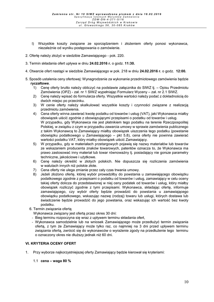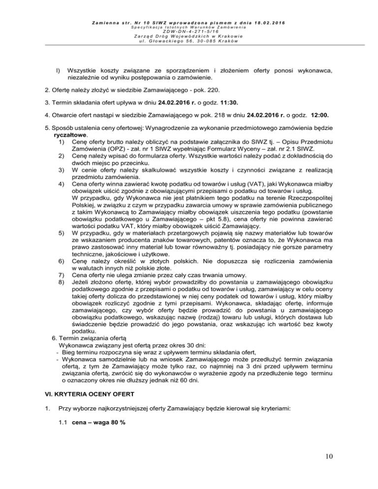 Zamienna str. Nr 10 SIWZ wprowadzona pismem z dnia 18.02.2016 Specyfikacja Istotnych Warunków Zamówienia ZDW-DN-4-271-5/16 Zarząd Dróg W ojewódzkich w Krakowie ul. Głowackiego 56, 30-085 Kraków l) Wszystkie koszty związane ze sporządzeniem i złożeniem oferty ponosi wykonawca, niezależnie od wyniku postępowania o zamówienie. 2. Ofertę należy złożyć w siedzibie Zamawiającego - pok. 220. 3. Termin składania ofert upływa w dniu 24.02.2016 r. o godz. 11:30. 4. Otwarcie ofert nastąpi w siedzibie Zamawiającego w pok. 218 w dniu 24.02.2016 r. o godz. 12:00. 5. Sposób ustalenia ceny ofertowej: Wynagrodzenie za wykonanie przedmiotowego zamówienia będzie ryczałtowe. 1) Cenę oferty brutto należy obliczyć na podstawie załącznika do SIWZ tj. – Opisu Przedmiotu Zamówienia (OPZ) - zał. nr 1 SIWZ wypełniając Formularz Wyceny – zał. nr 2.1 SIWZ. 2) Cenę należy wpisać do formularza oferty. Wszystkie wartości należy podać z dokładnością do dwóch miejsc po przecinku. 3) W cenie oferty należy skalkulować wszystkie koszty i czynności związane z realizacją przedmiotu zamówienia. 4) Cena oferty winna zawierać kwotę podatku od towarów i usług (VAT), jaki Wykonawca miałby obowiązek uiścić zgodnie z obowiązującymi przepisami o podatku od towarów i usług. W przypadku, gdy Wykonawca nie jest płatnikiem tego podatku na terenie Rzeczpospolitej Polskiej, w związku z czym w przypadku zawarcia umowy w sprawie zamówienia publicznego z takim Wykonawcą to Zamawiający miałby obowiązek uiszczenia tego podatku (powstanie obowiązku podatkowego u Zamawiającego – pkt 5.8), cena oferty nie powinna zawierać wartości podatku VAT, który miałby obowiązek uiścić Zamawiający. 5) W przypadku, gdy w materiałach przetargowych pojawią się nazwy materiałów lub towarów ze wskazaniem producenta znaków towarowych, patentów oznacza to, że Wykonawca ma prawo zastosować inny materiał lub towar równoważny tj. posiadający nie gorsze parametry techniczne, jakościowe i użytkowe. 6) Cenę należy określić w złotych polskich. Nie dopuszcza się rozliczenia zamówienia w walutach innych niż polskie złote. 7) Cena oferty nie ulega zmianie przez cały czas trwania umowy. 8) Jeżeli złożono ofertę, której wybór prowadziłby do powstania u zamawiającego obowiązku podatkowego zgodnie z przepisami o podatku od towarów i usług, zamawiający w celu oceny takiej oferty dolicza do przedstawionej w niej ceny podatek od towarów i usług, który miałby obowiązek rozliczyć zgodnie z tymi przepisami. Wykonawca, składając ofertę, informuje zamawiającego, czy wybór oferty będzie prowadzić do powstania u zamawiającego obowiązku podatkowego, wskazując nazwę (rodzaj) towaru lub usługi, których dostawa lub świadczenie będzie prowadzić do jego powstania, oraz wskazując ich wartość bez kwoty podatku. 6. Termin związania ofertą Wykonawca związany jest ofertą przez okres 30 dni: - Bieg terminu rozpoczyna się wraz z upływem terminu składania ofert, - Wykonawca samodzielnie lub na wniosek Zamawiającego może przedłużyć termin związania ofertą, z tym że Zamawiający może tylko raz, co najmniej na 3 dni przed upływem terminu związania ofertą, zwrócić się do wykonawców o wyrażenie zgody na przedłużenie tego terminu o oznaczony okres nie dłuższy jednak niż 60 dni. VI. KRYTERIA OCENY OFERT 1. Przy wyborze najkorzystniejszej oferty Zamawiający będzie kierował się kryteriami: 1.1 cena – waga 80 % 10