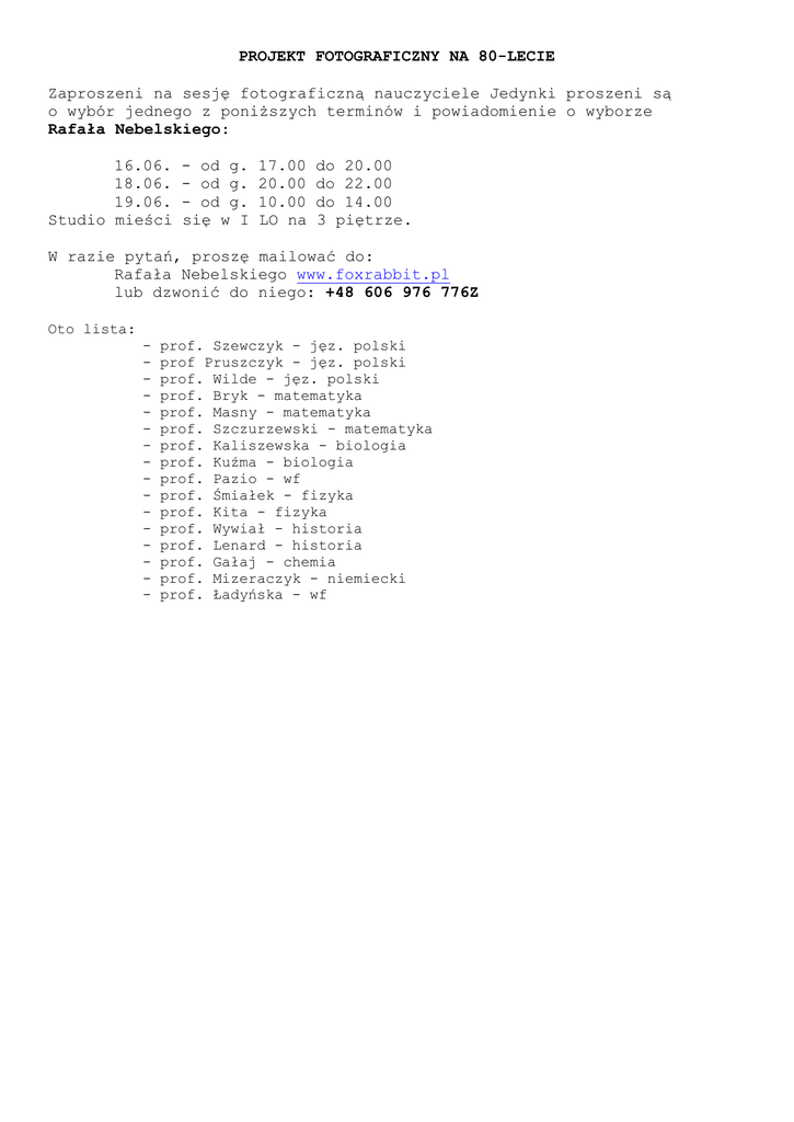 PROJEKT FOTOGRAFICZNY NA 80-LECIE Zaproszeni na sesję fotograficzną nauczyciele Jedynki proszeni są o wybór jednego z poniższych terminów i powiadomienie o wyborze Rafała Nebelskiego: 16.06. 18.06. 19.06. Studio mieści - od g. - od g. - od g. się w I 17.00 20.00 10.00 LO na do 20.00 do 22.00 do 14.00 3 piętrze. W razie pytań, proszę mailować do: Rafała Nebelskiego www.foxrabbit.pl lub dzwonić do niego: +48 606 976 776Z Oto lista: - prof. Szewczyk - jęz. polski prof Pruszczyk - jęz. polski prof. Wilde - jęz. polski prof. Bryk - matematyka prof. Masny - matematyka prof. Szczurzewski - matematyka prof. Kaliszewska - biologia prof. Kuźma - biologia prof. Pazio - wf prof. Śmiałek - fizyka prof. Kita - fizyka prof. Wywiał - historia prof. Lenard - historia prof. Gałaj - chemia prof. Mizeraczyk - niemiecki prof. Ładyńska - wf