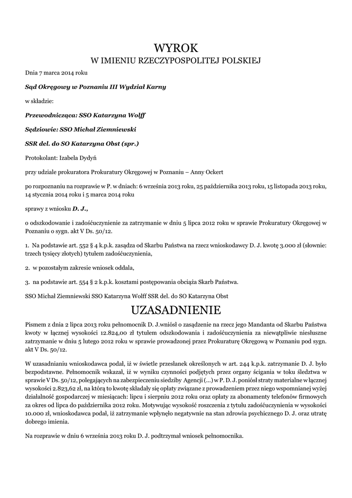 WYROK W IMIENIU RZECZYPOSPOLITEJ POLSKIEJ Dnia 7 marca 2014 roku Sąd Okręgowy w Poznaniu III Wydział Karny w składzie: Przewodnicząca: SSO Katarzyna Wolff Sędziowie: SSO Michał Ziemniewski SSR del. do SO Katarzyna Obst (spr.) Protokolant: Izabela Dydyń przy udziale prokuratora Prokuratury Okręgowej w Poznaniu – Anny Ockert po rozpoznaniu na rozprawie w P. w dniach: 6 września 2013 roku, 25 października 2013 roku, 15 listopada 2013 roku, 14 stycznia 2014 roku i 5 marca 2014 roku sprawy z wniosku D. J., o odszkodowanie i zadośćuczynienie za zatrzymanie w dniu 5 lipca 2012 roku w sprawie Prokuratury Okręgowej w Poznaniu o sygn. akt V Ds. 50/12. 1. Na podstawie art. 552 § 4 k.p.k. zasądza od Skarbu Państwa na rzecz wnioskodawcy D. J. kwotę 3.000 zł (słownie: trzech tysięcy złotych) tytułem zadośćuczynienia, 2. w pozostałym zakresie wniosek oddala, 3. na podstawie art. 554 § 2 k.p.k. kosztami postępowania obciąża Skarb Państwa. SSO Michał Ziemniewski SSO Katarzyna Wolff SSR del. do SO Katarzyna Obst UZASADNIENIE Pismem z dnia 2 lipca 2013 roku pełnomocnik D. J.wniósł o zasądzenie na rzecz jego Mandanta od Skarbu Państwa kwoty w łącznej wysokości 12.824,00 zł tytułem odszkodowania i zadośćuczynienia za niewątpliwie niesłuszne zatrzymanie w dniu 5 lutego 2012 roku w sprawie prowadzonej przez Prokuraturę Okręgową w Poznaniu pod sygn. akt V Ds. 50/12. W uzasadnianiu wnioskodawca podał, iż w świetle przesłanek określonych w art. 244 k.p.k. zatrzymanie D. J. było bezpodstawne. Pełnomocnik wskazał, iż w wyniku czynności podjętych przez organy ścigania w toku śledztwa w sprawie V Ds. 50/12, polegających na zabezpieczeniu siedziby Agencji (...) w P. D. J. poniósł straty materialne w łącznej wysokości 2.823,62 zł, na którą to kwotę składały się opłaty związane z prowadzeniem przez niego wspomnianej wyżej działalność gospodarczej w miesiącach: lipcu i sierpniu 2012 roku oraz opłaty za abonamenty telefonów firmowych za okres od lipca do października 2012 roku. Motywując wysokość roszczenia z tytułu zadośćuczynienia w wysokości 10.000 zł, wnioskodawca podał, iż zatrzymanie wpłynęło negatywnie na stan zdrowia psychicznego D. J. oraz utratę dobrego imienia. Na rozprawie w dniu 6 września 2013 roku D. J. podtrzymał wniosek pełnomocnika. Sąd Okręgowy ustalił następujący stan faktyczny: Wnioskodawca D. J. od 1989 roku prowadził Agencję (...) w P.. W dniu 5 lipca 2012 roku o godzinie 10.00. wnioskodawca został zatrzymany przez funkcjonariuszy CBŚ KGP w P., w obecności jego pracownicy K. S.. W tym też dniu Policja przeszukała siedzibę należącej do D. J. Agencji (...) w P. przy os. (...), dokonując zabezpieczenia dokumentacji oraz sprzętu związanego z prowadzeniem działalności gospodarczej, w tym należących do wnioskodawcy telefonów komórkowych. Postanowieniem z dnia 5 lipca 2012 roku, sygn. akt V Ds. 50/12, prokurator Prokuratury Okręgowej w Poznaniu, postawił D. J. zarzut popełnienia przestępstwa z art.189a § 1 k.k., polegającego na tym, że w okresie od stycznia 2012 roku do końca czerwca 2012 roku w P., działając wspólnie i w porozumieniu z M. M. z domu Ś. i innymi dotąd nieustalonymi osobami dopuścił się handlu ludźmi polegającego na werbowaniu lub dostarczaniu co najmniej kilku kobiet za pośrednictwem Agencji (...) w P. do pracy w charakterze hostessy w klubie (...) w T., podczas, gdy w rzeczywistości ustalone oraz nieustalone kobiety były wprowadzane w błąd co do charakteru pracy i wykorzystywane do świadczenia innych form seksualnych, aniżeli prostytucja, czy też pornografia oraz innych form poniżających godność człowieka, aniżeli niewolnictwo, działania te popełnione były na szkodę dotychczas ustalonych: K. M. i A. H.. Następnie, D. J. o godzinie 15.30 został przesłuchany w charakterze podejrzanego. Przesłuchanie wnioskodawcy zakończyło się o godzinie 18.30. Około godziny 21.00. D. J. został zwolniony. Po opuszczeniu Komisariatu Policji zdenerwowany wnioskodawca udał się do znajomej A. T., która dała mu lek na uspokojenie. Postanowieniem prokuratora Prokuratury Okręgowej w Poznaniu z dnia 6 lipca 2012 roku zastosowano wobec D. J.środki zapobiegawcze o charakterze wolnościowym w postaci: dozoru Policji polegającego na zobowiązaniu go do stawiennictwa w KPP – Nowe Miasto jeden raz w tygodniu, połączonego z zakazem kontaktowania się z pokrzywdzonymi : A. H.i K. M., a także z innymi kobietami, co do których pośredniczył w załatwianiu wyjazdu do Japonii do pracy w klubie (...)oraz poręczenia majątkowego w kwocie 10.000 zł. Postanowienie o zastosowaniu środków zapobiegawczych zaskarżył obrońca D. J., składając zażalenie z dnia 13 lipca 2012 roku. Postanowieniem z dnia 9 sierpnia 2012 roku, sygn. akt III Kp 492/12, Sąd Rejonowy Poznań – Stare Miasto w P., utrzymał w mocy zaskarżone postanowienie o zastosowaniu wobec D. J. środków zapobiegawczych w postaci dozoru Policji i poręczenia majątkowego. W dniu 14 listopada 2012 roku wnioskodawca odebrał wszystkie rzeczy zabezpieczone w trakcie przeszukania pomieszczeń zajmowanych przez Agencję (...) w P. z dnia 5 lipca 2012 roku, z wyjątkiem teczki zawierającej umowy o zatrudnienie na terenie Japonii. Postanowieniem z dnia 21 listopada 2012 roku, sygn. akt V Ds. 50/12, prokurator Prokuratury Okręgowej w Poznaniu uchylił stosowane wobec D. J. środki zapobiegawcze w postaci dozoru Policji i poręczenia majątkowego. Postanowieniem z dnia 31 grudnia 2012 roku prokurator Prokuratury Okręgowej w Poznaniu umorzył śledztwo w sprawie V Ds. 50/12, prowadzonej przeciwko wnioskodawcy D. J. podejrzanemu o popełnienie czynu z art. 189a§1 k.k. wobec stwierdzenia, iż zachowanie podejrzanych nie wyczerpuje znamion czynu zabronionego. Dowody: dokumenty zgromadzone w sprawie o sygn. akt V Ds. 50/12, w szczególności: protokół zatrzymana D. J.(k. 50), protokół 