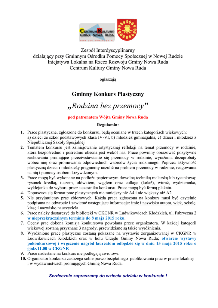 Zespół Interdyscyplinarny działający przy Gminnym Ośrodku Pomocy Społecznej w Nowej Rudzie Inicjatywa Lokalna na Rzecz Rozwoju Gminy Nowa Ruda Centrum Kultury Gminy Nowa Ruda ogłaszają Gminny Konkurs Plastyczny „Rodzina bez przemocy” pod patronatem Wójta Gminy Nowa Ruda Regulamin: 1. Prace plastyczne, zgłoszone do konkursu, będą oceniane w trzech kategoriach wiekowych: a) dzieci ze szkół podstawowych klasa IV-VI, b) młodzież gimnazjalna, c) dzieci i młodzież z Niepublicznej Szkoły Specjalnej 2. Tematem konkursu jest zainicjowanie artystycznej refleksji na temat przemocy w rodzinie, która bezpośrednio i pośrednio obecna jest wokół nas. Prace powinny obrazować pozytywne zachowania promujące przeciwstawianie się przemocy w rodzinie, wyrażania dezaprobaty wobec niej oraz promowania odpowiednich wzorców życia rodzinnego. Poprzez aktywność plastyczną dzieci i młodzieży pragniemy uczulić na problem przemocy w rodzinie, reagowania na nią i pomocy osobom krzywdzonym. 3. Prace mogą być wykonane na podłożu papierowym dowolną techniką malarską lub rysunkową: rysunek kredką, tuszem, ołówkiem, węglem oraz collage (kolaż), witraż, wydzieranka, wyklejanka do wyboru przez uczestnika konkursu. Prace mogą być formą plakatu. 4. Dopuszcza się format prac plastycznych nie mniejszy niż A4 i nie większy niż A2 5. Nie przyjmujemy prac zbiorowych. Każda praca zgłoszona na konkurs musi być czytelnie podpisana na odwrocie i zawierać następujące informacje: imię i nazwisko autora, wiek, szkołę, klasę i nazwisko nauczyciela. 6. Pracę należy dostarczyć do biblioteki w CKGNR w Ludwikowicach Kłodzkich, ul. Fabryczna 2 w nieprzekraczalnym terminie do 8 maja 2015 roku. 7. Oceny prac dokona komisja konkursowa powołana przez organizatora. W każdej kategorii wiekowej zostaną przyznane 3 nagrody, przewidziane są także wyróżnienia. 8. Wyróżnione prace plastyczne zostaną pokazane na wystawie zorganizowanej w CKGNR w Ludwikowicach Kłodzkich oraz w holu Urzędu Gminy Nowa Ruda; otwarcie wystawy pokonkursowej i wręczenie nagród laureatom odbędzie się w dniu 15 maja 2015 roku o godz.11.00 w CKGNR 9. Prace nadesłane na konkurs nie podlegają zwrotowi. 10. Organizator konkursu zastrzega sobie prawo bezpłatnego publikowania prac w prasie lokalnej i w wydawnictwach promujących Gminę Nowa Ruda. Serdecznie zapraszamy do wzięcia udziału w konkursie !