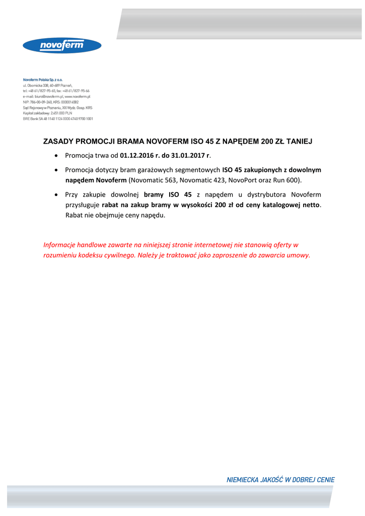 ZASADY PROMOCJI BRAMA NOVOFERM ISO 45 Z NAPĘDEM 200 ZŁ TANIEJ Promocja trwa od 01.12.2016 r. do 31.01.2017 r. Promocja dotyczy bram garażowych segmentowych ISO 45 zakupionych z dowolnym napędem Novoferm (Novomatic 563, Novomatic 423, NovoPort oraz Run 600). Przy zakupie dowolnej bramy ISO 45 z napędem u dystrybutora Novoferm przysługuje rabat na zakup bramy w wysokości 200 zł od ceny katalogowej netto. Rabat nie obejmuje ceny napędu. Informacje handlowe zawarte na niniejszej stronie internetowej nie stanowią oferty w rozumieniu kodeksu cywilnego. Należy je traktować jako zaproszenie do zawarcia umowy.
