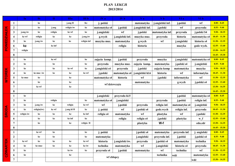 PLAN LEKCJI 2013/2014 PONIEDZIAŁEK Ia Ib II IIIa III b IV a IV b j.ang II Kz j. polski Va Vb VI a VI b matematyka j.angielski inf. j.polski wf 8.00 - 8.45 1 kz 2 kz j.ang religia św kz matematyka s4 j.polski j.angielski inf. j.polski wf przyroda 8.55 - 9.40 3 j.ang św kz religia kz wf kz j.angielski wf j.polski matematyka inf. przyroda j.polski S4 9.50 - 10.35 4 kz wf religia kz kz j.ang.św g.wych j.angielski inf. muzyka muz. przyroda historia matematyka s4 10.45 - 11.30 5 kz j.ang św kz kz religia inf muzyka muz. matematyka g.wych wf j.angielski historia s4 11.50 - 12.35 6 kz religia historia muzyka godz wych. 12.55 - 13.40 7 religia kz inf 13.50 - 14.35 WTOREK 8 14.45 - 15.30 1 kz kz wf kz zajęcia komp. j.polski przyroda muzyka j.angielski matematyka s4 8.00 - 8.45 2 kz kz kz przyroda muzyka muz. zajęcia komp. matematyka j.polski s4 j.angielski 8.55 - 9.40 3 kz kz kz wf kz j.angielski s4 przyroda j.polski zajęcia komp matematyka muzyka 9.50 - 10.35 4 kz kz muz św kz kz kz wf j.polski historia wf informatyka 10.45 - 11.30 5 kz muz kz kz j.polski informatyka wf 11.50 - 12.35 6 kz kz g.wych j.polski s4 12.55 - 13.40 7 kz wf kz matematyka s4 matematyka s4 j.angielski kl.6 historia wf dziewczęta wf matematyka 13.50 - 14.35 ŚRODA 8 14.45 - 15.30 1 kz j.angielski przyroda kl.5 2 kz kz matematyka s4 j.angielski 3 kz j.ang św kz religia kz wf wf j.polski 4 kz religia(św) kz wf j.ang kl II kz j. polski 5 religia św kz kz kz kz inf religia s4 6 kz kz kz inf kz 7 kz kz religia II religia j.polski matematyka s4 8.00 - 8.45 przyroda j.polski religia inf. 8.55 - 9.40 przyroda religia inf. matematyka s4 j.angielski 9.50 - 10.35 wf j.polski s4 godz.wych religia inf. przyroda 10.45 - 11.30 matematyka wf plastyka wf j.polski 11.50 - 12.35 religia religia s4 j.polski plastyka w_f 12.55 - 13.40 plastyka W-f edu.zdr 13.50 - 14.35 CZWARTEK 8 14.45 - 15.30 1 kz wf kz kz j. polski j.polski s4 matematyka przyroda inf. j. angielski 8.00 - 8.45 2 kz kz kz matematyka j.angielski przyroda inf. j.polski j.polski s4 8.55 - 9.40 3 kz wf kz kz kz kz wf historia j.angielski św. przyroda j.polski s4 matematyka technika 9.50 - 10.35 4 kz kz muz kz kz kz św technika matematyka wf j.angielski historia s4 przyroda 10.45 - 11.30 5 kz kz św kz przyroda s4 j.polski matematyka wf technika wf 11.50 - 12.35 6 kz kz matematyka 12.55 - 13.40 7 wf chłopcy technika wdż wdż 13.50 - 14.35 PIĄTEK 8 14.45 - 15.30 1 kz kz kz 2 kz kz wf kz j. polski II przyroda św. matematyka przyroda historia s4 8.00 - 8.45 matematyka j.angielski s4 j.polski religia inf. 8.55 - 9.40 3 j.ang. kz wf kz kz wf kz przyroda g.wych. św. j.polski religia inf. matematyka s4 j.polski 9.50 - 10.35 4 kz wf kz kz kz j.ang.św religia j.polski s4 technika wf j.angielski kl.5 j.polski 10.45 - 11.30 5 kz kz św j.ang kz wf technika wf j.polski religia s4 plastyka 11.50 - 12.35 6 kz kz plastyka zajęcia komp. religia kl IV. plastyka edu.zdr 12.55 - 13.40 wf 13.50 - 14.35 14.45 - 15.30