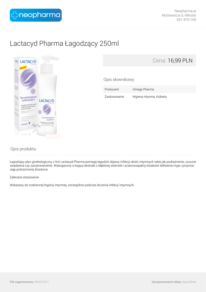 Neopharma.pl Mickiewicza 5, Mikstat 531-470-109 Lactacyd Pharma Łagodzący 250ml Cena: 16,99 PLN Opis słownikowy Producent Omega Pharma Zastosowanie Higiena intymna, Kobieta Opis produktu Łagodzący płyn ginekologiczny z linii Lactacyd Pharma pomaga łagodzić objawy infekcji okolic intymnych takie jak podrażnienie, uczucie swędzenia czy zaczerwienienie. Wzbogacony o kojący ekstrakt z błękitnej stokrotki i przeciwzapalny bisabolol delikatnie myje i przynosi ulgę podrażnionej śluzówce. Zalecane stosowanie Wskazany do codziennej higieny intymnej, szczególnie podczas leczenia infekcji intymnych. Plik wygenerowano: 09-03-2017 Powered by TCPDF (www.tcpdf.org) Oprogramowanie sklepu: AptusShop