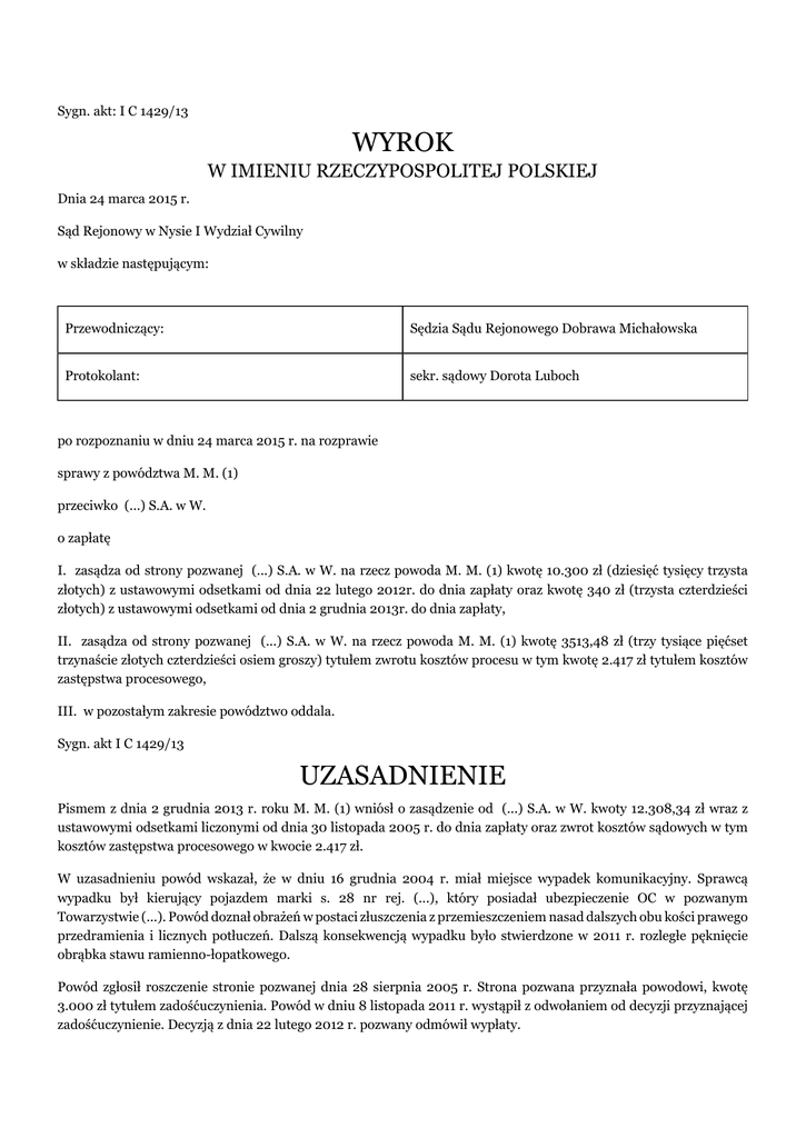Sygn. akt: I C 1429/13 WYROK W IMIENIU RZECZYPOSPOLITEJ POLSKIEJ Dnia 24 marca 2015 r. Sąd Rejonowy w Nysie I Wydział Cywilny w składzie następującym: Przewodniczący: Sędzia Sądu Rejonowego Dobrawa Michałowska Protokolant: sekr. sądowy Dorota Luboch po rozpoznaniu w dniu 24 marca 2015 r. na rozprawie sprawy z powództwa M. M. (1) przeciwko (...) S.A. w W. o zapłatę I. zasądza od strony pozwanej (...) S.A. w W. na rzecz powoda M. M. (1) kwotę 10.300 zł (dziesięć tysięcy trzysta złotych) z ustawowymi odsetkami od dnia 22 lutego 2012r. do dnia zapłaty oraz kwotę 340 zł (trzysta czterdzieści złotych) z ustawowymi odsetkami od dnia 2 grudnia 2013r. do dnia zapłaty, II. zasądza od strony pozwanej (...) S.A. w W. na rzecz powoda M. M. (1) kwotę 3513,48 zł (trzy tysiące pięćset trzynaście złotych czterdzieści osiem groszy) tytułem zwrotu kosztów procesu w tym kwotę 2.417 zł tytułem kosztów zastępstwa procesowego, III. w pozostałym zakresie powództwo oddala. Sygn. akt I C 1429/13 UZASADNIENIE Pismem z dnia 2 grudnia 2013 r. roku M. M. (1) wniósł o zasądzenie od (...) S.A. w W. kwoty 12.308,34 zł wraz z ustawowymi odsetkami liczonymi od dnia 30 listopada 2005 r. do dnia zapłaty oraz zwrot kosztów sądowych w tym kosztów zastępstwa procesowego w kwocie 2.417 zł. W uzasadnieniu powód wskazał, że w dniu 16 grudnia 2004 r. miał miejsce wypadek komunikacyjny. Sprawcą wypadku był kierujący pojazdem marki s. 28 nr rej. (...), który posiadał ubezpieczenie OC w pozwanym Towarzystwie (...). Powód doznał obrażeń w postaci złuszczenia z przemieszczeniem nasad dalszych obu kości prawego przedramienia i licznych potłuczeń. Dalszą konsekwencją wypadku było stwierdzone w 2011 r. rozległe pęknięcie obrąbka stawu ramienno-łopatkowego. Powód zgłosił roszczenie stronie pozwanej dnia 28 sierpnia 2005 r. Strona pozwana przyznała powodowi, kwotę 3.000 zł tytułem zadośćuczynienia. Powód w dniu 8 listopada 2011 r. wystąpił z odwołaniem od decyzji przyznającej zadośćuczynienie. Decyzją z dnia 22 lutego 2012 r. pozwany odmówił wypłaty. W niniejszej sprawie powód dochodził dodatkowego zadośćuczynienia w kwocie 10.300 zł oraz odszkodowania w kwocie 2.008,34 zł, na które składa się kwota 568,34 zł tytułem kosztów dojazdu na leczenie i rehabilitację oraz 1.440 zł tytułem kosztów opieki sprawowanej przez członków rodziny. W odpowiedzi na pozew, (...) S.A. w W. wniósł o oddalenie powództwa w całości i zasądzenie kosztów postępowania w tym kosztów zastępstwa procesowego według norm przepisanych, wskazując, że wypłacone przez niego zadośćuczynienie jest odpowiednie do rozmiaru szkody jaką poniósł powód. Zarzucił również w związku z faktem, że powód wezwał go do zapłaty dalszej części zadośćuczynienia i odszkodowania w dopiero w 2012 roku, niezasadnym jest żądanie odsetek od 2005 r. Sąd ustalił następujący stan faktyczny: W dniu 16 grudnia 2004 roku, powód M. M. (1) doznał obrażeń ciała w skutek wypadku komunikacyjnego jaki miał miejsce w miejscowości F.. Sprawcą wypadku był kierujący samochodem ciężarowym marki S. o numerze rejestracyjnym (...) – A. Z., który to nieumyślnie naruszył zasady bezpieczeństwa w ruchu drogowym i zajechał drogę kierującej samochodem osobowym marki O. (...) o numerze rejestracyjnym (...), matce powoda – R. M.. W tym czasie, sprawca wypadku posiadał ważną polisę ubezpieczenia od odpowiedzialności cywilnej w (...) S.A. W chwili wypadku powód, będący pasażerem samochodu osobowego, miał 15 lat. Na jego skutek doznał obrażeń w postaci zniszczenia z przemieszczeniem nasady kości promieniowej prawej z czasowym zaburzeniem funkcji stawu nadgarstkowego oraz licznych potłuczeń, czego skutkiem jest niestabilność przednia prawego stawu barkowego. Powód z licznymi potłuczeniami i pod wpływem silnego stresu został przewieziony z miejsca wypadku na Oddział (...) UrazowoOrtopedycznej Zespołu (...) w N., gdzie przebywał w dniach od 16 do 20 grudnia 2004 roku. Podczas pobytu w szpitalu zastosowano repozycję w znieczuleniu ogólnym, leczenie farmakologiczne, założono opatrunek gipsowy na okres 6 tygodni oraz zlecono kontrolne badania w poradni poszpitalnej. Powód kontynuował leczenie w poradni poszpitalnej od dnia 27 grudnia 2004 roku do dnia 27 kwietnia 2005 roku. Podczas wizyty kontrolnej 27 grudnia 2004 roku zlecono uzupełnienie zbyt luźnego unieruchomienia gipsowego oraz wykonano zdjęcie RTG. Dnia 27 stycznia 2005 roku, po sześciu tygodniach, gips został zdjęty jednak ruch ręki był nadal ograniczony a powód nadal uskarżał się na silny ból palców. Podobnie dnia 17 lutego 2005 roku powód uskarżał się na tenże ból (również na kolejnych wizytach w marcu i kwietniu), a jego ręka była nadal opuchnięta. Podczas kontroli 27 kwietnia 2005 r., lekarz zanotował ślad deficytu zgięcia grzbietowego ręki oraz zwichnięcie nadgarstka i przepisał odpowiednie leki. Powód został skierowany na rehabilitację, której, zgodnie z zaleceniami, oddał się od 5 do 18 kwietnia 2005 r. W związku z występującym bólem i ograniczeniem ruchomości nadgarstka powód ponownie rozpoczął leczenie; dnia 26 października 2005 r. rozpoznano zapalenie pochewki ścięgnistej, bolesność palca III i uszkodzenie III ścięgna. Powód wymagał pomocy osób trzecich w wymiarze 1 godziny dziennie przez okres 6 tygodni. Powód dojeżdżając na zabiegi rehabilitacyjne, wizyty kontrolne pokonał łącznie 680 km, koszt przejechania 1 km to 40 groszy. W związku z nawracającym bólem oraz niestabilnością stawu barkowego, powód 2 lutego 2011 r. został skierowany na badanie MR, które wykazało uszkodzenie przedniego obrąbka stawu barkowego, co jest następstwem opisanego na wstępie zdarzenia ubezpieczeniowego. Dowód: 1. Wyrok Sądu Rejonowego w Nysie w sprawie VI K 203/05, k. 17, 2. Dokumentacja medyczna, orzeczenia lek