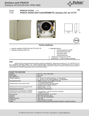 Zasilacz serii PSACH Zasilacz AC/AC24V/AC IP65 ABS PL PSACH 01244 v.1.1/VI PSACH 24VAC/4A/1x4A/HERMETIC Zasilacz AC do CCTV KOD: TYP: W D H IP65 Cechy zasilacza: · wyjście zasilania 24VAC/4A lub 27V AC/3,7A · napięcie zasilania 230V AC · zabezpieczenia: · przeciwzwarciowe SCP · przeciążeniowe OLP · termiczne OHP · antysabotażowe · obudowa hermetyczna IP 65 · gwarancja – 2 lata od daty produkcji OPIS Zasilacz AC/AC przeznaczony jest do zasilania urządzeń wymagających napięcia AC o wartości 24 V (U1= 24V AC/ U2= 27V AC) i wydajności całkowitej 4A@24 V AC. Posiada zabezpieczenia: przeciwzwarciowe (SCP), przeciążeniowe (OLP), termiczne transformatora (OHP) . Zasilacz umieszczony jest w plastikowej (ABS), natynkowej obudowie. Obudowa wyposażona jest ponadto w mikroprzełącznik (TAMPER) sygnalizujący otwarcie drzwiczek (czołówki). DANE TECHNICZNE Zasilanie: Pobór prądu: Moc zasilacza S: Napięcie wyjściowe Prąd wyjściowy AUX Zabezpieczenie przed zwarciem SCP: Zabezpieczenie przed przeciążeniem OLP: Zabezpieczenie termiczne Zabezpieczenie antysabotażowe TAMPER sygnalizujące otwarcie obudowy zasilacza Warunki pracy: Obudowa: Wymiary: Waga netto/brutto: Zamykanie: Uwagi: 230 V AC (-15%/+10%) 50Hz 0,5 A max. 100VA U1 : 23÷28 V AC (100% obciążenia ÷ 0% obciążenia) U2 : 25,5÷31,5 V AC (100% obciążenia ÷ 0% obciążenia) 4A@24 V AC max. lub 3,7A@27 V AC max. 1x F 4A bezpiecznik topikowy - uszkodzenie bezpiecznika topikowego wymaga wymiany wkładki topikowej obwód AC 24V : 1x F 4A obwód AC 230V : 1x T 1A wewnętrzne transformatora - mikrowyłącznik , styki NC (obudowa zamknięta), 0,5A@50V DC (max.) II klasa środowiskowa, -25 oC÷40 oC ABS, IP65, kolor jasny szary 160 x 160 x 90 [mm] (WxHxD) 1,9kg / 2kg Wkręt walcowy x 4 (z czoła) Obudowa posiada demontowana płytę montażowa z układami zasilacza. Tel. 0048-(0)-14-610-19-40, fax: 0048-(0)-14- 610-19-50, www.pulsar.pl, e-mail:[email protected]