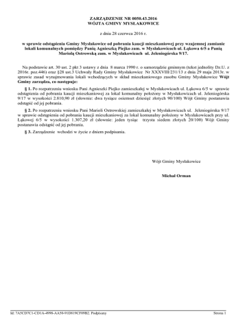 ZARZĄDZENIE NR 0050.43.2016 WÓJTA GMINY MYSŁAKOWICE z dnia 28 czerwca 2016 r. w sprawie odstąpienia Gminy Mysłakowice od pobrania kaucji mieszkaniowej przy wzajemnej zamianie lokali komunalnych pomiędzy Panią Agnieszką Piejko zam. w Mysłakowicach ul. Łąkowa 6/5 a Panią Mariolą Ostrowską zam. w Mysłakowicach ul. Jeleniogórska 9/17. Na podstawie art. 30 ust. 2 pkt 3 ustawy z dnia 8 marca 1990 r. o samorządzie gminnym (tekst jednolity Dz.U. z 2016r. poz.446) oraz §28 ust.3 Uchwały Rady Gminy Mysłakowice Nr XXXVIII/231/13 z dnia 29 maja 2013r. w sprawie zasad wynajmowania lokali wchodzących w skład mieszkaniowego zasobu Gminy Mysłakowice Wójt Gminy zarządza, co następuje: § 1. Po rozpatrzeniu wniosku Pani Agnieszki Piejko zamieszkałej w Mysłakowicach ul. Łąkowa 6/5 w sprawie odstąpienia od pobrania kaucji mieszkaniowej za lokal komunalny położony w Mysłakowicach ul. Jeleniogórska 9/17 w wysokości 2.810,90 zł (słownie: dwa tysiące osiemset dziesięć złotych 90/100) Wójt Gminy postanawia odstąpić od jej pobrania. § 2. Po rozpatrzeniu wniosku Pani Marioli Ostrowskiej zamieszkałej w Mysłakowicach ul. Jeleniogórska 9/17 w sprawie odstąpienia od pobrania kaucji mieszkaniowej za lokal komunalny położony w Mysłakowicach przy ul. Łąkowej 6/5 w wysokości 1.307,20 zł (słownie: jeden tysiąc trzysta siedem złotych 20/100) Wójt Gminy postanawia odstąpić od jej pobrania. § 3. Zarządzenie wchodzi w życie z dniem podpisania. Wójt Gminy Mysłakowice Michał Orman Id: 7A5CD7C1-CD1A-4998-AA50-91D819CF09B2. Podpisany Strona 1