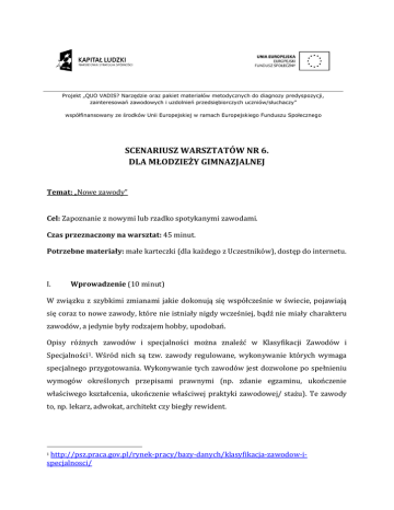 Projekt „QUO VADIS? Narzędzie oraz pakiet materiałów metodycznych do diagnozy predyspozycji, zainteresowań zawodowych i uzdolnień przedsiębiorczych uczniów/słuchaczy” współfinansowany ze środków Unii Europejskiej w ramach Europejskiego Funduszu Społecznego SCENARIUSZ WARSZTATÓW NR 6. DLA MŁODZIEŻY GIMNAZJALNEJ Temat: „Nowe zawody” Cel: Zapoznanie z nowymi lub rzadko spotykanymi zawodami. Czas przeznaczony na warsztat: 45 minut. Potrzebne materiały: małe karteczki (dla każdego z Uczestników), dostęp do internetu. I. Wprowadzenie (10 minut) W związku z szybkimi zmianami jakie dokonują się współcześnie w świecie, pojawiają się coraz to nowe zawody, które nie istniały nigdy wcześniej, bądź nie miały charakteru zawodów, a jedynie były rodzajem hobby, upodobań. Opisy różnych zawodów i specjalności można znaleźć w Klasyfikacji Zawodów i Specjalności1. Wśród nich są tzw. zawody regulowane, wykonywanie których wymaga specjalnego przygotowania. Wykonywanie tych zawodów jest dozwolone po spełnieniu wymogów określonych przepisami prawnymi (np. zdanie egzaminu, ukończenie właściwego kształcenia, ukończenie właściwej praktyki zawodowej/ stażu). Te zawody to, np. lekarz, adwokat, architekt czy biegły rewident. http://psz.praca.gov.pl/rynek-pracy/bazy-danych/klasyfikacja-zawodow-ispecjalnosci/ 1 Projekt „QUO VADIS? Narzędzie oraz pakiet materiałów metodycznych do diagnozy predyspozycji, zainteresowań zawodowych i uzdolnień przedsiębiorczych uczniów/słuchaczy” współfinansowany ze środków Unii Europejskiej w ramach Europejskiego Funduszu Społecznego Wśród nowych zawodów pojawiają się takie, których nigdy wcześniej nie było, ponieważ nie było też zapotrzebowania na tego typu prace, są to, np. promotor marki, tester gier komputerowych czy tajemniczy klient. Obecnie doradcy zawodowi mówią swoim klientom, że najlepiej jest robić dokładnie to, co się lubi, a być może właśnie hobby i zainteresowania zaprowadzą cię do przyszłego zawodu. W ten sposób to, co wyrasta z pasji pozostaje do końca życia. Zadanie 1. (20 minut) „CO TO ZA ZAWÓD?” KROK 1: Prośba o dobranie się Uczestników w trzy-czteroosobowe grupy. KROK 2: Przekazanie Uczestnikom w grupach opisów 4 nowych zawodów. Projekt „QUO VADIS? Narzędzie oraz pakiet materiałów metodycznych do diagnozy predyspozycji, zainteresowań zawodowych i uzdolnień przedsiębiorczych uczniów/słuchaczy” współfinansowany ze środków Unii Europejskiej w ramach Europejskiego Funduszu Społecznego Zawód nr 1 OPIS ZAWODU Kreuje nowe trendy w modzie oraz w innych dziedzinach. Stanowisko to jest wykorzystywane przez firmy odzieżowe, producentów nowych telefonów komórkowych, zegarków, samochodów, a nawet produktów spożywczych czy używek. Osoba zatrudniona na tym stanowisku zachęca potencjalnych konsumentów do zainteresowania się danym produktem, jednak nie ujawnia swoich prawdziwych intencji i interesów. Pojawia się w towarzystwie i korzystając z danych produktów ma oddziaływać na postawy i zainteresowania innych osób tak, aby te same zechciały sięgnąć po ten produkt. WYMAGANIA Na stanowisko to wybierane są osoby atrakcyjne, młode, potrafiące nawiązywać kontakty interpersonalne (wysokie kompetencje społeczne) i mające wielu znajomych. Doskonałym kandydatem na to stanowisko jest osoba popularna, potrafiąca wpływać na swoje otoczenie, obracająca się w wielu środowiskach, często pojawiająca się w modnych klubach i na popularnych imprezach, mogąca w naturalny sposób promować dany produkt w obrębie wyznaczonej grupy i nie będąc przy tym zdemaskowaną. Rola trendsettera nie ogranicza się jednak do korzystania z tegoż produktu w towarzystwie, musi on nawiązywać coraz to nowe kontakty i pod byle pretekstem czynnie promować produkty wśród potencjalnych konsumentów. MOŻLIWOŚCI ZATRUDNIENIA Zatrudnienie w tym zawodzie stwarzają liczne firmy i przedsiębiorstwa produkcyjne, wytwarzające lub dystrybuujące produkty luksusowe, atrakcyjne gadżety, samochody, odzież, artykuły spożywcze i używki, skierowane przeważnie do młodzieży i osób poniżej 35. roku życia. ------------------------------------------------------------------------------------------------POWYŻSZY OPIS ODNOSI SIĘ DO ZAWODU: TRENDSETTER, CZYLI PROMOTOR MARKI Projekt „QUO VADIS? Narzędzie oraz pakiet materiałów metodycznych do diagnozy predyspozycji, zainteresowań zawodowych i uzdolnień przedsiębiorczych uczniów/słuchaczy” współfinansowany ze środków Unii Europejskiej w ramach Europejskiego Funduszu Społecznego Zawód nr 2 OPIS ZAWODU Prowadzi badania marketingowe jako audytor usług i produktów w sieciach marketów i galeriach handlowych sprzedających kosmetyki, wyroby jubilerskie, ubrania, sprzęt elektroniczny, książki, samochody, w stacjach paliw, hotelach, salonach fryzjerskich, restauracjach itp. nie ujawniając swojej tożsamości; Wciela się w osobę próbującą kupić bądź zwrócić produkt lub tylko uzyskać informacje o towarze; dokonuje wszechstronnej i wnikliwej obserwacji zachowań personelu oraz oceny czystości i uporządkowania punktu sprzedaży; Zapoznaje się ze scenariuszem badania i dodatkowymi instrukcjami a po zakończeniu badania sporządza raport po jej ukończeniu. WYMAGANIA W zawodzie tym mogą pracować ludzie w różnym wieku, uczniowie, studenci, biznesmeni i emeryci. Chodzi o naturalność zachowania się w różnych warunkach, stąd różni kandydaci dobierani są do różnych miejsc pracy (np. kto inny do audytu w salonie samochodowym i kto inny do przeprowadzenia badania w instytucji publicznej). MOŻLIWOŚCI ZATRUDNIENIA Zatrudnienie w tym zawodzie stwarzają firmy oraz instytuty badania rynku i opinii publicznej. Mogą to także być duże korporacje, które bezpośrednio zlecają audyt jakości usług w swoich oddziałach, bądź w własnych produktów. ---------------