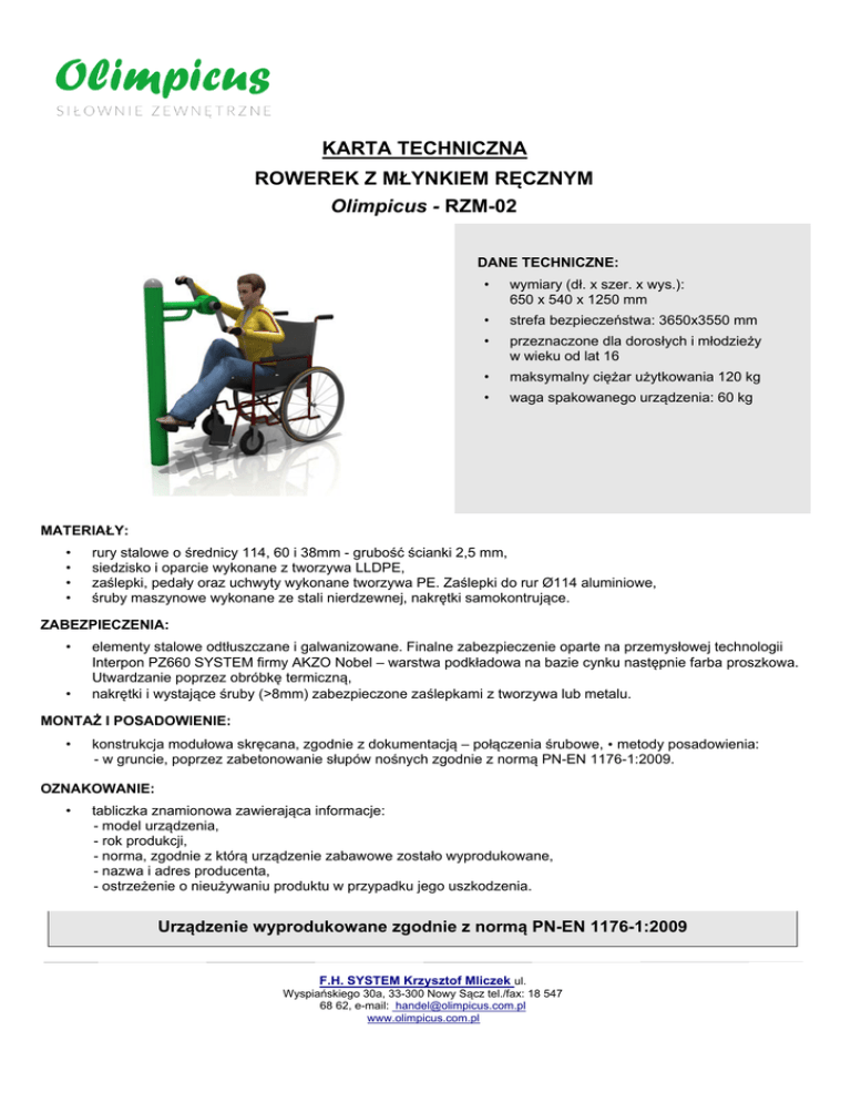 KARTA TECHNICZNA ROWEREK Z MŁYNKIEM RĘCZNYM Olimpicus - RZM-02 DANE TECHNICZNE: • wymiary (dł. x szer. x wys.): 650 x 540 x 1250 mm • strefa bezpieczeństwa: 3650x3550 mm • przeznaczone dla dorosłych i młodzieży w wieku od lat 16 • maksymalny ciężar użytkowania 120 kg • waga spakowanego urządzenia: 60 kg MATERIAŁY: • • • • rury stalowe o średnicy 114, 60 i 38mm - grubość ścianki 2,5 mm, siedzisko i oparcie wykonane z tworzywa LLDPE, zaślepki, pedały oraz uchwyty wykonane tworzywa PE. Zaślepki do rur Ø114 aluminiowe, śruby maszynowe wykonane ze stali nierdzewnej, nakrętki samokontrujące. ZABEZPIECZENIA: • • elementy stalowe odtłuszczane i galwanizowane. Finalne zabezpieczenie oparte na przemysłowej technologii Interpon PZ660 SYSTEM firmy AKZO Nobel – warstwa podkładowa na bazie cynku następnie farba proszkowa. Utwardzanie poprzez obróbkę termiczną, nakrętki i wystające śruby (>8mm) zabezpieczone zaślepkami z tworzywa lub metalu. MONTAŻ I POSADOWIENIE: • konstrukcja modułowa skręcana, zgodnie z dokumentacją – połączenia śrubowe, • metody posadowienia: - w gruncie, poprzez zabetonowanie słupów nośnych zgodnie z normą PN-EN 1176-1:2009. OZNAKOWANIE: • tabliczka znamionowa zawierająca informacje: - model urządzenia, - rok produkcji, - norma, zgodnie z którą urządzenie zabawowe zostało wyprodukowane, - nazwa i adres producenta, - ostrzeżenie o nieużywaniu produktu w przypadku jego uszkodzenia. Urządzenie wyprodukowane zgodnie z normą PN-EN 1176-1:2009 F.H. SYSTEM Krzysztof Mliczek ul. Wyspiańskiego 30a, 33-300 Nowy Sącz tel./fax: 18 547 68 62, e-mail: [email protected] www.olimpicus.com.pl