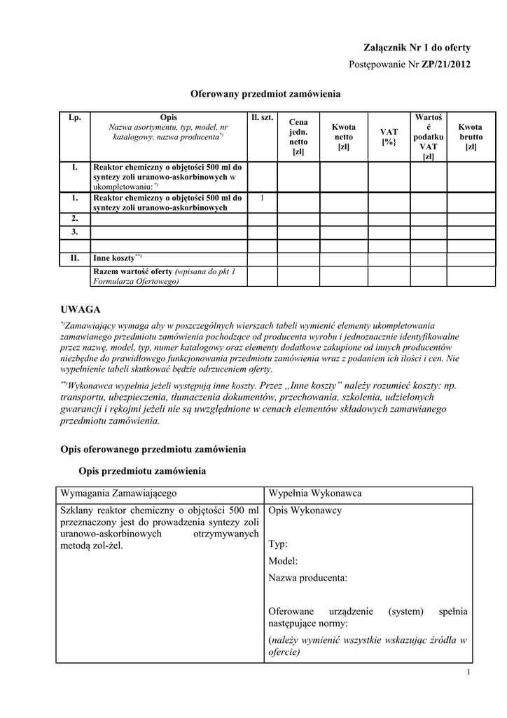 Załącznik Nr 1 do oferty Postępowanie Nr ZP/21/2012 Oferowany przedmiot zamówienia Lp. I. Opis Nazwa asortymentu, typ, model, nr katalogowy, nazwa producenta*) Reaktor chemiczny o objętości 500 ml do syntezy zoli uranowo-askorbinowych w ukompletowaniu: *) Reaktor chemiczny o objętości 500 ml do syntezy zoli uranowo-askorbinowych 1. Il. szt. Cena jedn. netto [zł] Kwota netto [zł] VAT [%} Wartoś ć podatku VAT [zł] Kwota brutto [zł] 1 2. 3. II. Inne koszty**) Razem wartość oferty (wpisana do pkt 1 Formularza Ofertowego) UWAGA *) Zamawiający wymaga aby w poszczególnych wierszach tabeli wymienić elementy ukompletowania zamawianego przedmiotu zamówienia pochodzące od producenta wyrobu i jednoznacznie identyfikowalne przez nazwę, model, typ, numer katalogowy oraz elementy dodatkowe zakupione od innych producentów niezbędne do prawidłowego funkcjonowania przedmiotu zamówienia wraz z podaniem ich ilości i cen. Nie wypełnienie tabeli skutkować będzie odrzuceniem oferty. Wykonawca wypełnia jeżeli występują inne koszty. Przez „Inne koszty” należy rozumieć koszty: np. transportu, ubezpieczenia, tłumaczenia dokumentów, przechowania, szkolenia, udzielonych gwarancji i rękojmi jeżeli nie są uwzględnione w cenach elementów składowych zamawianego przedmiotu zamówienia. **) Opis oferowanego przedmiotu zamówienia Opis przedmiotu zamówienia Wymagania Zamawiającego Wypełnia Wykonawca Szklany reaktor chemiczny o objętości 500 ml Opis Wykonawcy przeznaczony jest do prowadzenia syntezy zoli uranowo-askorbinowych otrzymywanych Typ: metodą zol-żel. Model: Nazwa producenta: Oferowane urządzenie następujące normy: (system) spełnia (należy wymienić wszystkie wskazując źródła w ofercie) 1 Reaktor chemiczny o objętości 500 ml do syntezy zoli uranowo-askorbinowych musi być ukompletowany i spełniać następujące parametry techniczne: L.p. Treść Parametry wymagane oferowane Zamawiający wymaga aby Wykonawca w swoim opisie dotyczącym poszczególnych punktów Wymagań Zamawiającego podał rzeczywiste dane oferowanego przedmiotu zamówienia wskazując źródła w dokumentacji dołączonej do oferty bez kopiowania informacji z rubryki obok 1 Reaktor chemiczny o objętości 500 ml 1. Reaktor chemiczny musi mieć statyw i podstawę, pręty wspierające, łączniki krzyżowe i złączki. 2. Statyw musi składać się z trzech wytrzymałych prętów ze stali nierdzewnej gwarantujących stabilność i redukujących do minimum wibracje podczas pracy. 3. Reaktor chemiczny musi mieć podstawę na odcieki z PE-HD. 4. Reaktor chemiczny musi mieć sprzęgło ze stali nierdzewnej, mocowane do mieszadła mechanicznego. 5. Reaktor chemiczny musi mieć samocentrujące się sprzęgło mieszadła, nie wymagające użycia narzędzi. 6. Reaktor chemiczny musi być wyposażony w prowadnicę pręta mieszającego wykonaną z PTFE ze sprzęgłem. 7. Reaktor chemiczny musi posiadać szklaną pokrywę naczynia reakcyjnego. 8. Reaktor chemiczny musi być wyposażony w uszczelkę O-ring wykonaną z FEP oraz kołnierz centrujący z PTFE. 9. Reaktor chemiczny musi mieć dwie obręcze przytrzymujące do naczynia wykonane ze stali nierdzewnej - dla każdego naczynia jedna obręcz. 10. Reaktor chemiczny musi mieć 2 szybko-złączkę do naczyń umożliwiającą natychmiastową ich wymianę, bez użycia narzędzi. 11. Reaktor chemiczny musi mieć węże łączące naczynie z głowicą wraz z szybko-złączkami. 12. Reaktor chemiczny musi zapewniać możliwość pracy z szerokim zakresem naczyń szklanych (z płaszczem termostatującym lub z płaszczem termostatującym i płaszczem próżniowym) o pojemnościach 250 ml, 500 ml, 1L, 2L, 3L i 5L. 13. Reaktor chemiczny musi być wyposażony w system mający możliwość współpracy ze wszystkimi dostępnymi na rynku mieszadłami mechanicznymi wiodących producentów. 14. Reaktor chemiczny musi mieć naczynie reakcyjne o objętości 500 ml z zaworem PTFE wraz z poniższym wyposażeniem-1 szt: złączki boczne, czujnik temperatury typu Pt100 PTFE z połączeniem Lemo, dopasowany do rozmiarów naczynia, adapter do czujnika temperatury z PTFE, pręt z kotwicową końcówką mieszającą z PTFE, dopasowany do rozmiarów naczynia. 15. Reaktor chemiczny musi być wyposażony w system dostosowany do pracy w zakresie temperatur -60ºC do +230°C. 16. Reaktor chemiczny musi być wyposażony w mieszadło mechaniczne - 1szt. 17. Mieszadło mechaniczne musi posiadać następujące cechy: maksymalny moment obrotowy 90 Ncm i chwilowe przeciążenia do 180 Ncm, zakres prędkości od 30 do 1000 obr./min, możliwość skalibrowania momentu obrotowego urządzenia przed lub w trakcie mieszania w celu monitorowania zmian lepkości cieczy w czasie, kontrolę prędkości za pomocą reostatu lub poprzez złącze, jasny, czytelny wyświetlacz wskazujący moment obrotowy i prędkość, praca z cieczami o lepkości do 40 000 mPas, stałą prędkość, nawet 3 przy zmianie lepkości. III. Inne wymagania: Wymagania Zamawiającego Wypełnia Wykonawca Oferowany zestaw musi być fabrycznie Oświadczam, że: nowy, wyprodukowany w 2012 roku. 1. Wykonawca zapewni na terenie Polski serwis gwarancyjny oraz serwis pogwarancyjny i zakup części zamiennych przez Zamawiającego przez okres co najmniej 5 lat, od daty zakończenia okresu gwarancji. 2. 3. W ramach udzielonej gwarancji Wykonawca pokryje koszty napraw urządzenia, jego wyposażenia i oprogramowania, a także pokryje koszty wymiany uszkodzonych elementów lub całej aparatury jeżeli zajdzie taka konieczność, koszty transportu, ubezpieczenia, koszty robocizny. 4. W okresie gwarancyjnym Wykonawca zapewni wykonanie całościowego przeglądu aparatury na miesiąc przed upływem terminu jej gwarancji. Wymagany termin dla realizacji niniejszego zamówienia, nie później niż do 15 października 2012 r. 5. Oferta musi być czytelna, sporządzona w języku polskim. Dopuszcza się możliwość składania opisów technic