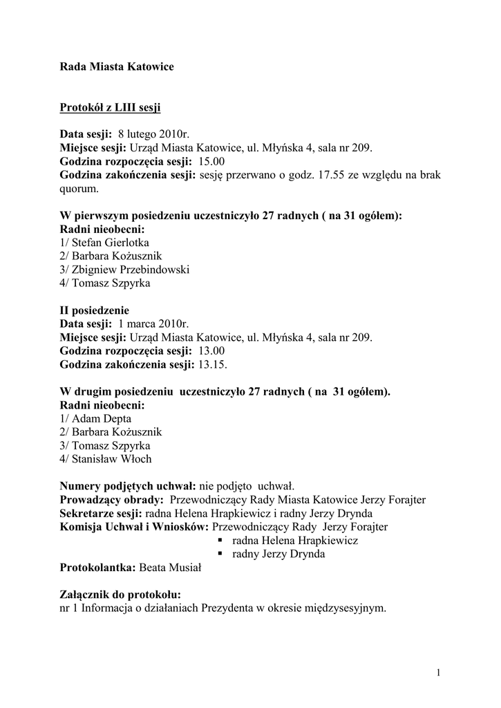 Rada Miasta Katowice Protokół z LIII sesji Data sesji: 8 lutego 2010r. Miejsce sesji: Urząd Miasta Katowice, ul. Młyńska 4, sala nr 209. Godzina rozpoczęcia sesji: 15.00 Godzina zakończenia sesji: sesję przerwano o godz. 17.55 ze względu na brak quorum. W pierwszym posiedzeniu uczestniczyło 27 radnych ( na 31 ogółem): Radni nieobecni: 1/ Stefan Gierlotka 2/ Barbara Kożusznik 3/ Zbigniew Przebindowski 4/ Tomasz Szpyrka II posiedzenie Data sesji: 1 marca 2010r. Miejsce sesji: Urząd Miasta Katowice, ul. Młyńska 4, sala nr 209. Godzina rozpoczęcia sesji: 13.00 Godzina zakończenia sesji: 13.15. W drugim posiedzeniu uczestniczyło 27 radnych ( na 31 ogółem). Radni nieobecni: 1/ Adam Depta 2/ Barbara Kożusznik 3/ Tomasz Szpyrka 4/ Stanisław Włoch Numery podjętych uchwał: nie podjęto uchwał. Prowadzący obrady: Przewodniczący Rady Miasta Katowice Jerzy Forajter Sekretarze sesji: radna Helena Hrapkiewicz i radny Jerzy Drynda Komisja Uchwał i Wniosków: Przewodniczący Rady Jerzy Forajter radna Helena Hrapkiewicz radny Jerzy Drynda Protokolantka: Beata Musiał Załącznik do protokołu: nr 1 Informacja o działaniach Prezydenta w okresie międzysesyjnym. 1 Porządek obrad LIII sesji Rady Miasta Katowice 1. Otwarcie sesji. 2. Powołanie sekretarzy sesji. 3. Powołanie Komisji Uchwał i Wniosków. 4. Przyjęcie protokołu z LII sesji Rady Miasta Katowice. 5. Zmiany w porządku obrad. 6. Sprawozdanie Prezydenta Miasta Katowice z działalności w okresie międzysesyjnym. 7. Omówienie projektu Studium uwarunkowań i kierunków zagospodarowania przestrzennego miasta Katowice. 8. Interpelacje. 9. Zapytania radnych. 10.Komunikaty i wolne wnioski. 11.Zamknięcie sesji. Przebieg obrad. Punkt 1 Otwarcie sesji. Przewodniczący Rady Jerzy Forajter otworzył obrady LIII sesji Rady Miasta Powitał wszystkich radnych, Prezydenta Miasta Piotra Uszoka, Wiceprezydenta Józefa Kocurka, Wiceprezydenta Arkadiusza Godlewskiego, Wiceprezydenta Leszka Piechotę, Naczelników oraz przedstawicieli Wydziałów Urzędu Miasta, dyrektorów i kierowników zaproszonych zakładów oraz jednostek organizacyjnych, przedstawicieli prasy, radia i telewizji oraz internautów. Prowadzący obrady powitał projektantów Studium uwarunkowań i kierunków zagospodarowania przestrzennego miasta Katowice z Biura Rozwoju Regionu w osobach : - Pana Marka Zemłę – Kierownika Projektu - Panią Iwonę Batkowską - Pana Rafała Miareckiego - Pana Wojciecha Tomczyka Punkt 2 Powołanie sekretarzy sesji. Przewodniczący Rady na sekretarzy sesji zaproponował następujących radnych: 1/ Helenę Hrapkiewicz 2/ Jerzego Dryndę Rada Miasta Katowice jednogłośnie, przy 26 głosach „za” przyjęła skład sekretarzy sesji. Punkt 3 Powołanie Komisji Uchwał i Wniosków. Przewodniczący Rady zaproponował do Komisji Uchwał i Wniosków sekretarzy sesji. 2 Zaproponowany skład Komisji Uchwał i Wniosków został przyjęty przez Radę Miasta Katowice jednogłośnie, przy 26 głosach „za”. Punkt 4 Przyjęcie protokołu z LII sesji Rady Miasta Katowice. Przewodniczący Rady przypomniał, że protokół z LII sesji Rady Miasta Katowice był wyłożony do wglądu w Biurze Rady Miasta i radni mogli zapoznać się z jego treścią. Wobec braku uwag i zgłoszeń ze strony radnych, Przewodniczący Rady poddał pod głosowanie przyjęcie protokołu z LII sesji Rady Miasta Katowice. Protokół z LII sesji został przyjęty jednogłośnie, przy 25 głosach „za”. Punkt 5 Zmiany w porządku obrad. Zarówno Przewodniczący Rady, jak i Prezydent Piotr Uszok nie wnieśli propozycji zmian do porządku obrad sesji. Punkt 6 Sprawozdanie Prezydenta Miasta o działaniach w okresie międzysesyjnym. Prezydent Piotr Uszok przedstawił informację o działaniach Prezydenta Miasta w okresie od 18 stycznia 2010r. do 4 lutego 2010r. /Informacja o działaniach Prezydenta w okresie międzysesyjnym- zał. nr 1 do protokołu/ Punkt 7 Omówienie projektu Studium uwarunkowań i kierunków zagospodarowania przestrzennego miasta Katowice. Prezydent Piotr Uszok stwierdził, że na ukończeniu jest tworzenie strategicznego dokumentu, jakim jest Studium uwarunkowań i kierunków zagospodarowania przestrzennego miasta Katowice. W trakcie prac pojawiła się nowa regulacja prawna dotycząca kwestii ochrony środowiska, co spowolniło procedurę uchwalania dokumentu o około pół roku. Na jego podstawie będą w przyszłości opracowywane projekty uchwał dotyczące planów zagospodarowania przestrzennego. Praca nad Studium trwa już dość długo i dlatego tak bardzo ważne jest zgłaszanie do projektu Studium ewentualnych uwag, w terminie do 5 marca br. Dyskusja dzisiejsza powinna zmierzać do zapoznania się z dokumentem, omówienia go z obecnymi na sesji projektantami i ewentualnego zgłaszania uwag, tak aby można je było rozpatrzyć i ewentualnie uwzględnić. Przewodniczący Rady stwierdził, że dzisiejsza sesja jest kolejnym etapem dyskusji publicznej, która ma zmierzać do tego aby na tym etapie składać ewentualne wnioski. Chodzi o uniknięcie takiej sytuacji, że na sesji poświęconej 3 uchwaleniu Studium wprowadza się jeszcze jakieś zasadnicze zmiany. Prowadzący obrady poprosił radnych o pisemne składanie ewentualnych uwag na podstawie przepisu art. 11 pkt 11 ustawy o planowaniu i zagospodarowaniu przestrzennym ( Dz.U. z 2003r., Nr 80, poz. 717 z póżn. zm.) Pan Rafał Zemła wyjaśnił, że Studium stanowi rozmieszczenie w przestrzeni miasta programów i ustaleń wynikających ze Strategii Rozwoju Miasta oraz innych dokumentów, takich jak np. wieloletnie plany inwestycyjne oraz wszystkie opracowania planistyczne miasta. Studium nie jest więc dokumentem autorskim projektantów, tylko stanowi o zachowaniu ciągłości planistycznej. Zmierza do rozwoju miasta w sposób harmonijny i zrównoważony. Głównym założeniem tego dokumentu jest próba rozwiązania problemów związanych z obsługą komunikacyjną, w tym szczególnie z tr