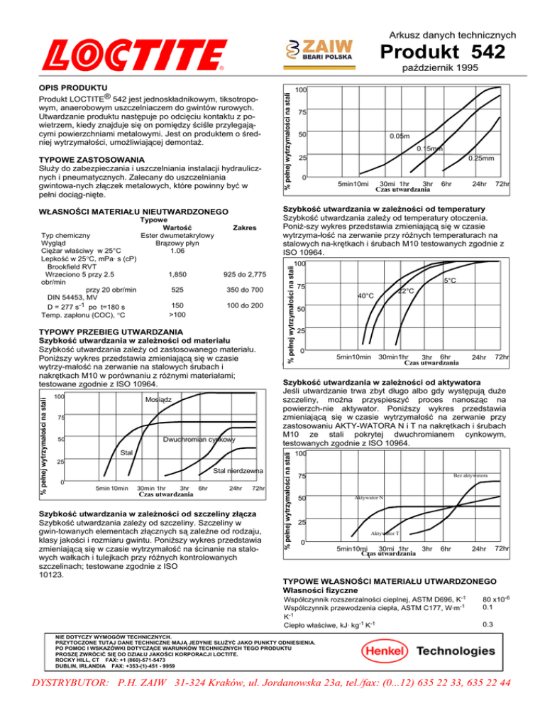 Arkusz danych technicznych Produkt 542 październik 1995 TYPOWE ZASTOSOWANIA Służy do zabezpieczania i uszczelniania instalacji hydraulicznych i pneumatycznych. Zalecany do uszczelniania gwintowa-nych złączek metalowych, które powinny być w pełni dociąg-nięte. WŁASNOŚCI MATERIAŁU NIEUTWARDZONEGO Zakres 525 350 do 700 150 >100 100 do 200 % pełnej wytrzymałości na stali 75 Dwuchromian cynkowy Stal 25 Stal nierdzewna 0 5min 10min 0.05m 0.15mm 25 0 30min 1hr 3hr Czas utwardzania 6hr 24hr 72hr Szybkość utwardzania w zależności od szczeliny złącza Szybkość utwardzania zależy od szczeliny. Szczeliny w gwin-towanych elementach złącznych są zależne od rodzaju, klasy jakości i rozmiaru gwintu. Poniższy wykres przedstawia zmieniającą się w czasie wytrzymałość na ścinanie na stalowych wałkach i tulejkach przy różnych kontrolowanych szczelinach; testowane zgodnie z ISO 10123. f % pełnej wytrzymałości na stali 925 do 2,775 Mosiądz 50 50 0.25mm 5min10mi 30mi 1hr 3hr Czas utwardzania 6hr 24hr 72hr 100 1,850 TYPOWY PRZEBIEG UTWARDZANIA Szybkość utwardzania w zależności od materiału Szybkość utwardzania zależy od zastosowanego materiału. Poniższy wykres przedstawia zmieniającą się w czasie wytrzy-małość na zerwanie na stalowych śrubach i nakrętkach M10 w porównaniu z różnymi materiałami; testowane zgodnie z ISO 10964. 100 75 Szybkość utwardzania w zależności od temperatury Szybkość utwardzania zależy od temperatury otoczenia. Poniż-szy wykres przedstawia zmieniającą się w czasie wytrzyma-łość na zerwanie przy różnych temperaturach na stalowych na-krętkach i śrubach M10 testowanych zgodnie z ISO 10964. 5°C 75 22°C 40°C 50 25 0 5min10min 30min1hr 3hr 6hr Czas utwardzania 24hr 72hr Szybkość utwardzania w zależności od aktywatora Jeśli utwardzanie trwa zbyt długo albo gdy występują duże szczeliny, można przyspieszyć proces nanosząc na powierzch-nie aktywator. Poniższy wykres przedstawia zmieniającą się w czasie wytrzymałość na zerwanie przy zastosowaniu AKTY-WATORA N i T na nakrętkach i śrubach M10 ze stali pokrytej dwuchromianem cynkowym, testowanych zgodnie z ISO 10964. % pełnej wytrzymałości na stali Typ chemiczny Wygląd Ciężar właściwy w 25°C Lepkość w 25°C, mPa· s (cP) Brookfield RVT Wrzeciono 5 przy 2.5 obr/min przy 20 obr/min DIN 54453, MV D = 277 s-1 po t=180 s Temp. zapłonu (COC), °C Typowe Wartość Ester dwumetakrylowy Brązowy płyn 1.06 100 % pełnej wytrzymałości na stali OPIS PRODUKTU Produkt LOCTITE® 542 jest jednoskładnikowym, tiksotropowym, anaerobowym uszczelniaczem do gwintów rurowych. Utwardzanie produktu następuje po odcięciu kontaktu z powietrzem, kiedy znajduje się on pomiędzy ściśle przylegającymi powierzchniami metalowymi. Jest on produktem o średniej wytrzymałości, umożliwiającej demontaż. 100 75 50 Bez aktywatora Aktywator N 25 Aktywator T 0 5min10mi 30mi 1hr 3hr Czas \ utwardzania 6hr 24hr 72hr TYPOWE WŁASNOŚCI MATERIAŁU UTWARDZONEGO Własności fizyczne Współczynnik rozszerzalności cieplnej, ASTM D696, K-1 Wspólczynnik przewodzenia ciepła, ASTM C177, W·m-1 K-1 Ciepło właściwe, kJ· kg-1 K-1 80 x10-6 0.1 0.3 NIE DOTYCZY WYMOGÓW TECHNICZNYCH. PRZYTOCZONE TUTAJ DANE TECHNICZNE MAJĄ JEDYNIE SŁUŻYĆ JAKO PUNKTY ODNIESIENIA. PO POMOC I WSKAZÓWKI DOTYCZĄCE WARUNKÓW TECHNICZNYCH TEGO PRODUKTU PROSZĘ ZWRÓCIĆ SIĘ DO DZIAŁU JAKOŚCI KORPORACJI LOCTITE. ROCKY HILL, CT FAX: +1 (860)-571-5473 DUBLIN, IRLANDIA FAX: +353-(1)-451 - 9959 DYSTRYBUTOR: P.H. ZAIW 31-324 Kraków, ul. Jordanowska 23a, tel./fax: (0...12) 635 22 33, 635 22 44 TDS Loctite®542 październik 1995 WŁASNOŚCI FUNKCJONALNE MATERIAŁU UTWARDZONEGO (Po 24 godzinach w 22°C na stali) Typowe Wartość Moment zerwania, IS0 10964 (4.3), N· m 15 (lb· in) (130) Moment odkręcania po zerwaniu, IS0 9 10964 (4.5), N· m (lb· in) (80) Moment luzowania, DIN 54454, N· m 25 (lb· in) (220) Maks. moment odkręcania po zerwaniu, 25 DIN 54454, N· m (lb· in) (220) Zakres 8 do 20 (70 do 180) 6 do 13 (50 do 115) 15 do 35 (130 do 310) 15 do 35 (130 do 310) TYPOWA ODPORNOŚĆ NA ŚRODOWISKO Proces badawczy : Moment luzowania, DIN 54454 Materiał: Nakrętki i śruby M10 pokryte fosforanem cynkowym Proces utwardzania: 1 tydzień w 22°C Wytrzymałość na temperaturę Badane w temperaturze. % wytrz. w tem. pok. 100 Tego produktu normalnie nie zaleca się do tworzyw (szczególnie materiałów termoplastycznych, gdzie może nastąpić pęknięcie naprężeniowe tworzywa). Użytkownicy powinni sprawdzić, czy dany produkt nadaje się do tych materiałów. Wskazówki dotyczące stosowania Aby uzyskać jak najlepsze wyniki należy dokładnie oczyścić i odtłuścić powierzchnie. Trzeba nanieść na śrubę taką ilość produktu, aby wypełnił wszystkie pracujące zwoje gwintu. Naj-bardziej odpowiednie dla tego produktu są wąskie szczeliny złącz (0,05 mm). Przy bardzo dużych rozmiarach gwintów mogą występować duże szczeliny, co będzie miało wpływ na szybkość utwardzania i wytrzymałość. Proukt ten daje możli-wość kontrolowanego tarcia podczas montażu (stosunek: moment/naprężenie). Przy dociąganiu krytycznym stosunek ten powinien być sprawdzony. 75 50 25 0 0 50 100 150 Temperatura, °C Starzenie cieplne Starzenie w danej temperaturze, testowane w 22°C. % wytrz. w tem. pok. Pełna informacja dotycząca bezpiecznego obchodzenia się z tym produktem znajduje się w arkuszu danych bezpieczeństwa dotyczącym materiału (MSDS). Jeśli do czyszczenia powierzchni przed klejeniem stosuje się wodne urządzenia zmywające, należy koniecznie sprawdzić, czy roztwór wodny jest odpowiedni dla danego kleju. W pewnych przypadkach takie wodne zmywanie może mieć wpływ na utwardzanie i na własności kleju. Zakresy danych Przytoczone tu dane techniczne mają służyć jako punkt odnie-sienia, a nie jako baza do przygotowania warunków technicz-nych. Proszę zwrócić się