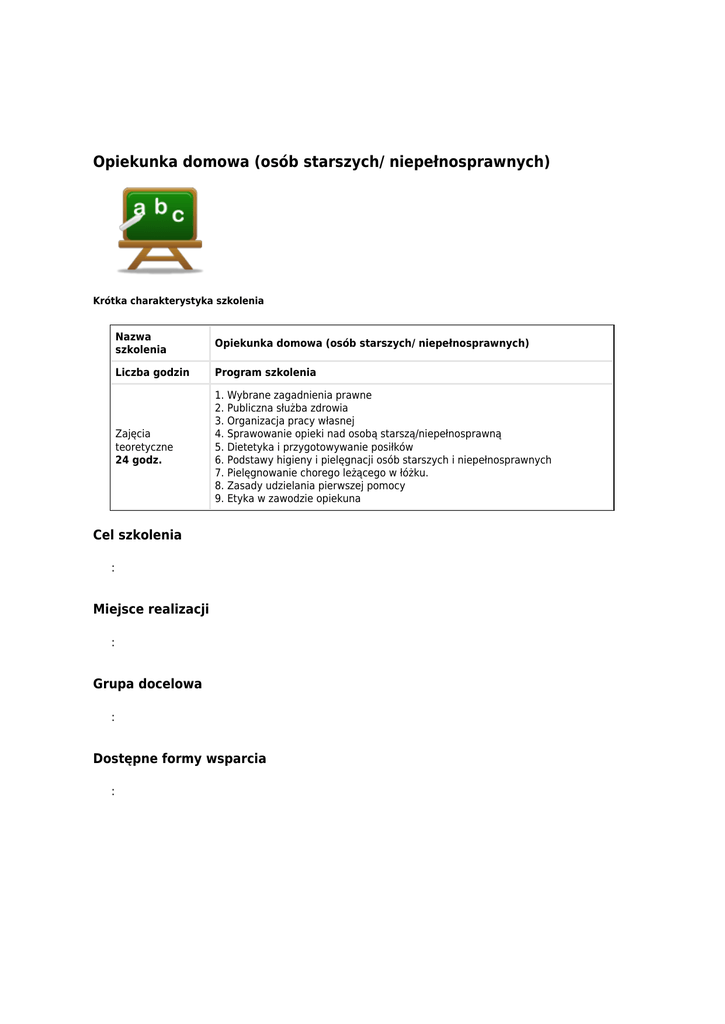 Opiekunka domowa (osób starszych/ niepełnosprawnych) Krótka charakterystyka szkolenia Nazwa szkolenia Opiekunka domowa (osób starszych/ niepełnosprawnych) Liczba godzin Program szkolenia Zajęcia teoretyczne 24 godz. 1. Wybrane zagadnienia prawne 2. Publiczna służba zdrowia 3. Organizacja pracy własnej 4. Sprawowanie opieki nad osobą starszą/niepełnosprawną 5. Dietetyka i przygotowywanie posiłków 6. Podstawy higieny i pielęgnacji osób starszych i niepełnosprawnych 7. Pielęgnowanie chorego leżącego w łóżku. 8. Zasady udzielania pierwszej pomocy 9. Etyka w zawodzie opiekuna Cel szkolenia : Miejsce realizacji : Grupa docelowa : Dostępne formy wsparcia :