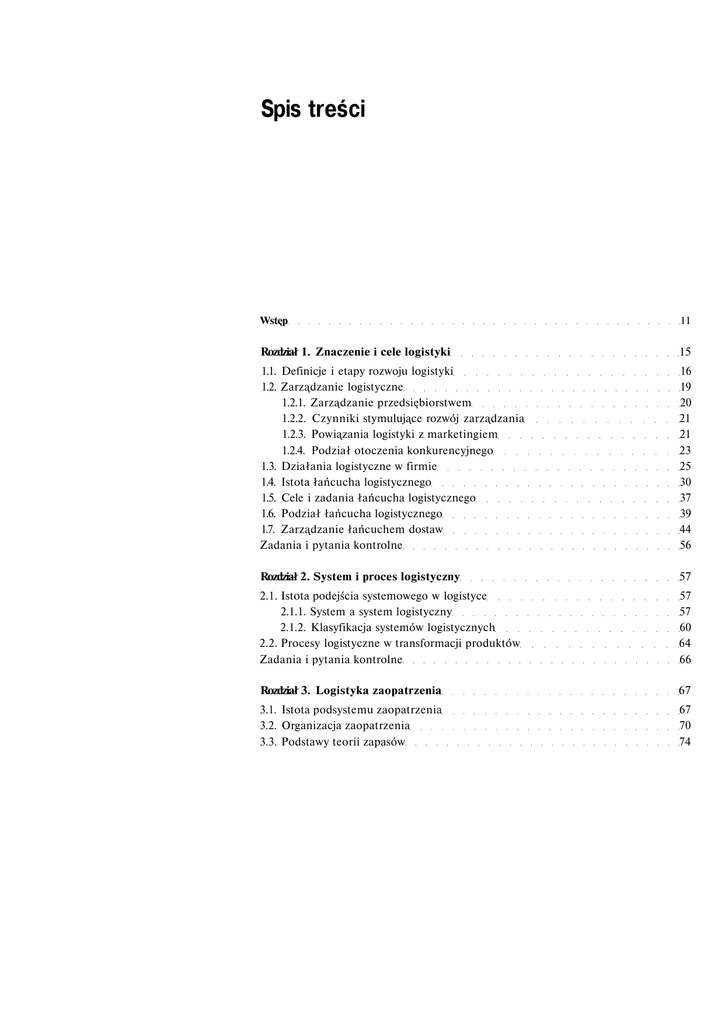 Spis treści Wstęp 11 Rozdział 1. Znaczenie i cele logistyki 15 1.1. Definicje i etapy rozwoju logistyki 1.2. Zarządzanie logistyczne 1.2.1. Zarządzanie przedsiębiorstwem 1.2.2. Czynniki stymulujące rozwój zarządzania 1.2.3. Powiązania logistyki z marketingiem 1.2.4. Podział otoczenia konkurencyjnego 1.3. Działania logistyczne w firmie 1.4. Istota łańcucha logistycznego 1.5. Cele i zadania łańcucha logistycznego 1.6. Podział łańcucha logistycznego 1.7. Zarządzanie łańcuchem dostaw Zadania i pytania kontrolne 16 19 20 21 21 23 25 30 37 39 44 56 Rozdział 2. System i proces logistyczny 57 2.1. Istota podejścia systemowego w logistyce 2.1.1. System a system logistyczny 2.1.2. Klasyfikacja systemów logistycznych 2.2. Procesy logistyczne w transformacji produktów Zadania i pytania kontrolne 57 57 60 64 66 Rozdział 3. Logistyka zaopatrzenia 67 3.1. Istota podsystemu zaopatrzenia 3.2. Organizacja zaopatrzenia 3.3. Podstawy teorii zapasów 67 70 74 3.4. Klasyfikacja zapasów 3.5. Koszty zapasów 3.6. Metody sterowania zapasami 3.7. Planowanie potrzeb materiałowych 3.8. Metody klasyfikacji materiałów 3.9. Modele decyzyjne w pozyskiwaniu zasobów/dostawców Zadania i pytania kontrolne 75 77 80 83 89 94 100 Rozdział 4. Logistyka produkcji 103 4.1. Proces produkcyjny 4.1.1. Operacje i ich elementy 4.1.2. Organizowanie komórek produkcyjnych 4.2. Funkcjonowanie systemu produkcyjnego 4.3. Organizowanie operacji w procesie produkcji 4.3.1. Techniczne przygotowanie nowych lub modernizowanych wyrobów 4.3.2. Produkcja — procesy obróbcze 4.4. Planowanie zapotrzebowania na zdolności produkcyjne 4.5. Zapasy 4.5.1. Materiały 4.5.2. Towary 4.5.3. Produkcja w toku 4.5.4. Wyroby gotowe 4.6. Logistyka recyrkulacji 4.6.1. Podstawy recyklingu 4.6.2. Kategorie odpadów 4.7. Wskaźniki monitorujące 4.7.1. Ewidencja produkcji 4.7.2. Wskaźniki produkcji 4.8. Obszary zadań logistycznych 4.8.1. Zastosowanie filozofii Kaizen 4.8.2. Lean Manufacturing — odchudzanie 4.8.3. Funkcje systemu Kanban Zadania i pytania kontrolne 103 103 105 106 107 107 112 120 123 124 124 125 127 127 127 129 129 130 130 132 133 138 139 143 Rozdział 5. Logistyka dystrybucji 144 5.1. Istota i funkcje dystrybucji 5.2. Kanały dystrybucji 5.2.1. Bezpośrednie kanały dystrybucji 5.2.2. Pośrednie kanały dystrybucji 5.2.3. Kanały konwencjonalne i zintegrowane pionowo 144 146 148 149 151 5.3. Uczestnicy kanałów dystrybucji 5.3.1. Hurtownicy 5.3.2. Agenci i brokerzy 5.3.3. Detaliści 5.3.4. Logistyczne centra dystrybucji 5.3.5. Instytucje wspomagające przepływy w kanałach dystrybucji 5.4. Projektowanie kanałów dystrybucji 5.5. Dystrybucja fizyczna 5.6. Prognozowanie popytu i systemy DRP 5.6.1. Prognozowanie popytu 5.6.2. Planowanie potrzeb dystrybucyjnych DRP 5.7. Logistyczna obsługa klientów 5.7.1. Istota i elementy obsługi klientów 5.7.2. Efektywna obsługa klientów ECR Zadania i pytania kontrolne 152 152 154 157 160 . . . . 162 163 169 170 170 172 175 176 176 179 Rozdział 6. Infrastruktura logistyczna — przepływ materiałów 187 6.1. Proces transportowy 6.1.1. Klasyfikacja transportu 6.1.2. Infrastruktura transportowa 6.1.3. Środki transportowe 6.1.4. Organizacja procesów transportowych 6.2. Proces magazynowania 6.2.1. Przyczyny magazynowania produktów 6.2.2. Procesy i operacje magazynowe 6.2.3. Budowle magazynowe 6.2.4. Wyposażenie magazynów 6.2.5. Organizacja procesów magazynowania 6.3. Procesy przeładunkowe 6.3.1. Podział procesów przeładunkowych 6.3.2. Fronty przeładunkowe 6.4. Opakowania 6.4.1. Funkcje opakowań 6.4.2. Klasyfikacja opakowań 6.4.3. Znakowanie opakowań 6.4.4. Gospodarka opakowaniami Zadania i pytania kontrolne 187 189 189 190 192 194 195 196 198 199 201 202 202 205 206 207 209 211 213 215 Rozdział 7. Infrastruktura logistyczna — przepływ informacji 222 7.1. Procesy przepływu informacji w systemach logistycznych 7.1.1. Znaczenie informacji dla realizacji procesów logistycznych 222 222 7.1.2. System automatycznej identyfikacji danych 7.1.3. Elektroniczna wymiana danych 7.2. Komputerowe wspomaganie systemów logistycznych 7.2.1. Systemy informatyczne i ich funkcje 7.2.2. Komputerowy system zarządzania procesami magazynowymi WMS 7.2.3. Komputerowe systemy wspomagające transport i spedycję 7.2.4. Ewolucja i struktura systemów MRP/ERP 7.2.5. Systemy zarządzania relacjami z klientami CRM 7.2.6. Struktura i funkcje komputerowych systemów zarządzania łańcuchem dostaw SCM 7.2.7. Wdrażanie systemów informatycznych Zadania i pytania kontrolne 223 229 235 235 251 253 255 Rozdział 8. Projektowanie systemów logistycznych 256 8.1. Warunki wdrożenia logistyki 8.2. Badanie możliwości 8.2.1. Badanie rynku i prognozowanie popytu 8.2.2. Lokalizacja przedsiębiorstwa i wielkość działki 8.2.3. Projektowanie przedsiębiorstw produkcyjnych 8.3. Wyznaczenie użytecznej powierzchni budowli 8.3.1. Wyznaczenie powierzchni części administracyjnej 8.3.2. Wyznaczenie powierzchni magazynu zaopatrzenia 8.3.3. Wyznaczenie powierzchni hali produkcyjnej 8.3.4. Wyznaczenie powierzchni magazynu wyrobów gotowych 8.3.5. Całkowita powierzchnia hali 8.4. Projektowanie w obsłudze rynku 8.4.1. Lokalizacja magazynów — centra logistyczne 8.4.2. Koszty i ceny w różnych gałęziach transportu 8.4.3. Transport samochodowy materiałów na duże odległości 8.4.4. Analiza warunków wpływających na wysokość ceny przewozu kolejowego 8.4.5. Lokalizacja i budowa magazynów pośrednich 8.4.6. Badania rynkowe określonej populacji 8.5. Obsługa logistyczna przedsiębiorstwa 8.5.1. Zastosowanie koncepcji marketingu dynamicznego 8.5.2. Podsystem planowania produkcji 8.5.3. Projektowanie magazynu 8.6. Projektowanie systemu produkcyjnego 8.7. Składowanie 8.7.1. Ogólna charakterystyka składowania 257 257 258 258 262 268 268 269 270 271 271 272 272 276 279 237 239 243 250 284 295 297 298 298 299 301 308 314 316 8.7.2. Podstawowe funkcje logistyczne składów 8.7.3. Podstawowe decy
