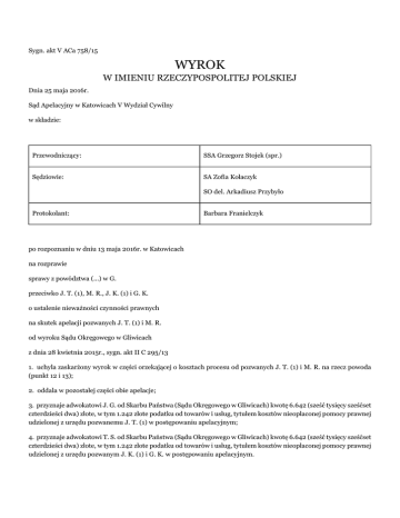 Sygn. akt V ACa 758/15 WYROK W IMIENIU RZECZYPOSPOLITEJ POLSKIEJ Dnia 25 maja 2016r. Sąd Apelacyjny w Katowicach V Wydział Cywilny w składzie: Przewodniczący: SSA Grzegorz Stojek (spr.) Sędziowie: SA Zofia Kołaczyk SO del. Arkadiusz Przybyło Protokolant: Barbara Franielczyk po rozpoznaniu w dniu 13 maja 2016r. w Katowicach na rozprawie sprawy z powództwa (...) w G. przeciwko J. T. (1), M. R., J. K. (1) i G. K. o ustalenie nieważności czynności prawnych na skutek apelacji pozwanych J. T. (1) i M. R. od wyroku Sądu Okręgowego w Gliwicach z dnia 28 kwietnia 2015r., sygn. akt II C 295/13 1. uchyla zaskarżony wyrok w części orzekającej o kosztach procesu od pozwanych J. T. (1) i M. R. na rzecz powoda (punkt 12 i 13); 2. oddala w pozostałej części obie apelacje; 3. przyznaje adwokatowi J. G. od Skarbu Państwa (Sądu Okręgowego w Gliwicach) kwotę 6.642 (sześć tysięcy sześćset czterdzieści dwa) złote, w tym 1.242 złote podatku od towarów i usług, tytułem kosztów nieopłaconej pomocy prawnej udzielonej z urzędu pozwanemu J. T. (1) w postępowaniu apelacyjnym; 4. przyznaje adwokatowi T. S. od Skarbu Państwa (Sądu Okręgowego w Gliwicach) kwotę 6.642 (sześć tysięcy sześćset czterdzieści dwa) złote, w tym 1.242 złote podatku od towarów i usług, tytułem kosztów nieopłaconej pomocy prawnej udzielonej z urzędu pozwanym J. K. (1) i G. K. w postępowaniu apelacyjnym. SSO del. Arkadiusz Przybyło SSA Grzegorz Stojek SSA Zofia Kołaczyk Sygn. akt V ACa 758/15 UZASADNIENIE Zaskarżonym wyrokiem – wydanym w sprawie z powództwa (...) w G.przeciwko J. T. (1), J. K. (1), G. K. i M. R. o ustalenie nieważności czynności prawnych – Sąd Okręgowy w Gliwicach: 1) ustalił, że nieważne jest „oświadczenie wystawcy weksli”, które 9 maja 2007 r. złożyli pozwani J. K. (1) i G. K.; 2) ustalił, że nieważne jest „oświadczenia wystawcy weksli”, które 9 maja 2007 r. złożyła pozwana M. R.; 3) ustalił, że nieważne jest oświadczenie pozwanych J. K. (1) i G. K. o ustanowieniu hipoteki kaucyjnej do sumy najwyższej 70.600 zł na rzecz pozwanej M. R., obciążającej zabudowaną nieruchomość objętą księgą wieczystą nr (...) Sądu Rejonowego w W., zawarte w akcie notarialnym sporządzonym w dniu 9 maja 2007 r. przez notariusza R. R. w jego kancelarii notarialnej w B., rep. (...) nr (...); 4) ustalił, że nieważne jest oświadczenie pozwanych J. K. (1) i G. K. o udzieleniu pełnomocnictwa pozwanej M. R. do sprzedaży nieruchomości objętej księgą wieczystą nr (...) Sądu Rejonowego w W., za cenę nie niższą niż 70.600 zł, zawarte w akcie notarialnym sporządzonym w dniu 9 maja 2007 r. przez notariusza R. R. w jego kancelarii notarialnej w B., rep A. nr (...); 5) ustalił, że nieważna jest warunkowa umowa sprzedaży zabudowanej nieruchomości, dla której Sąd Rejonowy w W. prowadził księgę wieczystą nr(...), zawarta pomiędzy J. K. (1) i G. K., reprezentowanymi przez pełnomocnika M. R., a J. T. (1), objęta aktem notarialnym sporządzonym w dniu 18 września 2007 r. przez notariusza R. R. w jego kancelarii notarialnej w B., rep. (...) nr (...); 6) ustalił, że nieważna jest umowa przenosząca własność zabudowanej nieruchomości, dla której Sąd Rejonowy w W. prowadził księgę wieczystą nr (...), zawarta pomiędzy J. K. (1) i G. K., reprezentowanymi przez pełnomocnika M. R., a J. T. (1), objęta aktem notarialnym sporządzonym w dniu 23 października 2007 r. przez notariusza R. R. w jego kancelarii notarialnej w B., rep. (...) nr(...); 7) orzekł o kosztach nieopłaconej pomocy prawnej udzielonej z urzędu pozwanym J. K. (1) i G. K.; 8) orzekł o kosztach nieopłaconej pomocy prawnej udzielonej z urzędu pozwanemu J. T. (1); 9) nie obciążył pozwanych J. K. (1) i G. K. kosztami postępowania; 10) nakazał pobrać od pozwanej M. R. na rzecz Skarbu Państwa (Sądu Okręgowego w Gliwicach) kwotę 5.166 zł tytułem części opłaty, od uiszczenia której powód był zwolniony; 11) nakazał pobrać od pozwanego J. T. (1) na rzecz Skarbu Państwa (Sądu Okręgowego w Gliwicach) kwotę 5.166 zł tytułem części opłaty, od uiszczenia której powód był zwolniony; 12) zasądził od pozwanego J. T. (1) na rzecz powoda kwotę 2.400 zł tytułem kosztów procesu; 13) zasądził od pozwanej M. R. na rzecz powoda kwotę 2.400 zł tytułem kosztów procesu. Rozstrzygnięcie oparł o następujące ustalenia faktyczne i oceny prawne. W latach 2006-2007 pozwani J. K. (1) i G. K. wprowadzili się do budynku mieszkalnego znajdującego się na nieruchomości położonej w P., składającej się z działek oznaczonych numerami (...), objętej księgą wieczystą nr (...) Sądu Rejonowego w W.; oboje byli właścicielami tej nieruchomości. W związku z budową domu na tej nieruchomości zaciągnęli kredyt i liczne pożyczki oraz popadli w kłopoty finansowe. Kiedy suma ich zadłużenia wyniosła 60.000 zł, postanowili zaciągnąć kredyt konsolidacyjny, który mogliby spłacać dłużej. Wobec braku zdolności kredytowej zwrócili się do J. K. (2), prowadzącego działalność gospodarczą w zakresie doradztwa, restrukturyzacji i pośrednictwa finansowego. Ich celem było pozyskanie kredytu konsolidacyjnego, by tak uzyskanymi środkami pieniężnymi mogli spłacić inne swoje długi. J. K. (2) miał być ich doradcą i pośrednikiem finansowym. Dostarczyli mu wszystkie dokumenty związane z ciążącymi na nich długami. Uzyskali obietnicę załatwienia kredytu bez poręczenia, jednak wcześniej J. K. (2) zobowiązał ich do spłaty długów w mniejszym rozmiarze, wobec wierzycieli, którzy wszczęli przeciwko nim postępowania egzekucyjne. W tym celu w dniu 7 maja 2007 r. J. K. (2) zawarł z pozwanymi J. K. (1) i G. K. (zleceniodawcami) umowę na restrukturyzację, której celem miało być podjęcie przez J. K. (2) działań zmierzających do uregulowania sytuacji finansowej zleceniodawców, zaś J. K. (2) zobowiązał się 