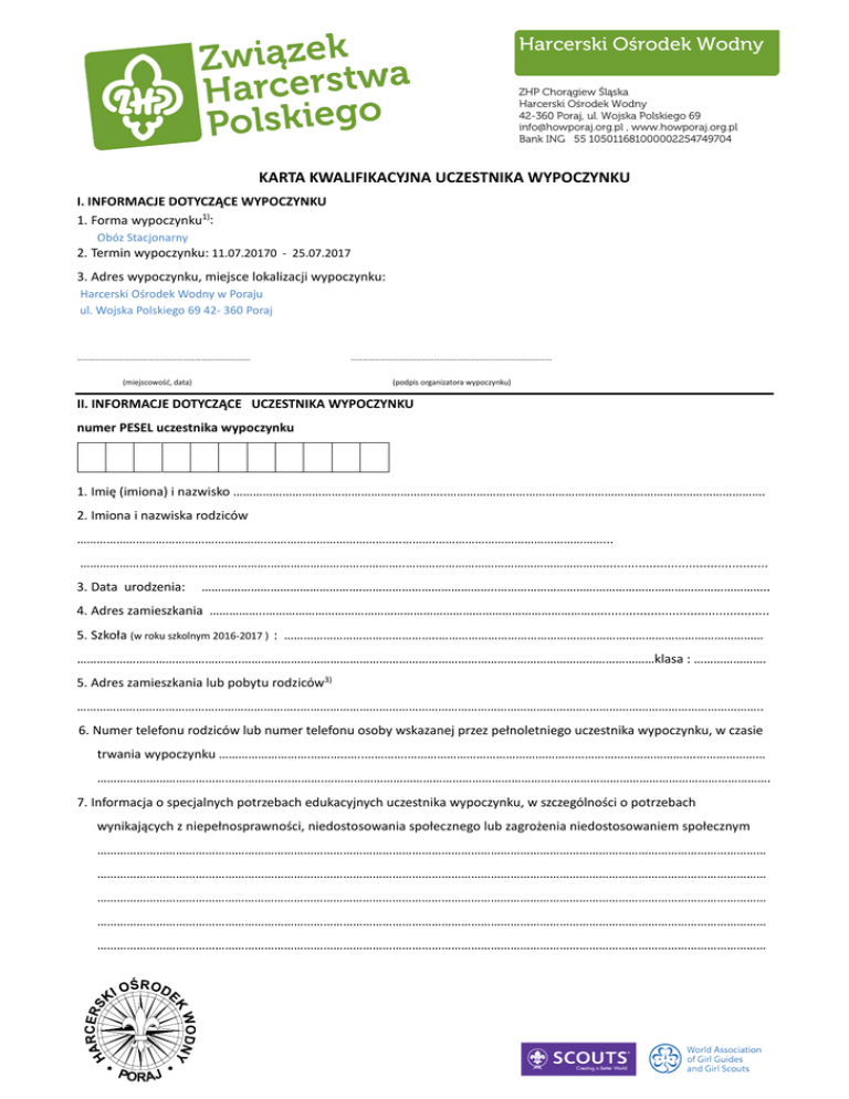 Karta kwalifikacyjna - Harcerski Ośrodek Wodny w Poraju