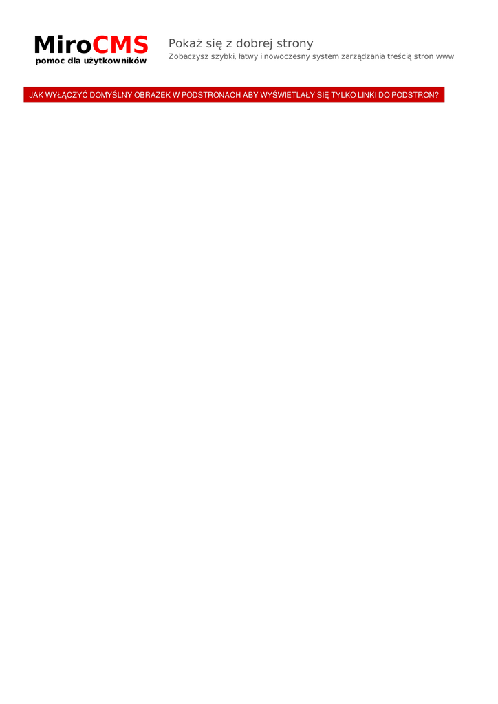 MiroCMS pomoc dla użytkowników Pokaż się z dobrej strony Zobaczysz szybki, łatwy i nowoczesny system zarządzania treścią stron www JAK WYŁĄCZYĆ DOMYŚLNY OBRAZEK W PODSTRONACH ABY WYŚWIETLAŁY SIĘ TYLKO LINKI DO PODSTRON?