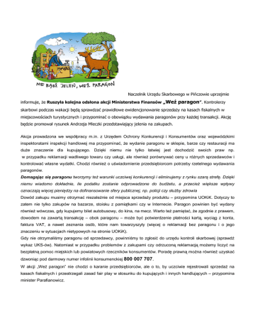 Naczelnik Urzędu Skarbowego w Pińczowie uprzejmie informuje, że Ruszyła kolejna odsłona akcji Ministerstwa Finansów „Weź paragon”. Kontrolerzy skarbowi podczas wakacji będą sprawdzać prawidłowe ewidencjonowanie sprzedaży na kasach fiskalnych w miejscowościach turystycznych i przypominać o obowiązku wydawania paragonów przy każdej transakcji. Akcję będzie promował rysunek Andrzeja Mleczki przedstawiający jelenia na zakupach. Akcja prowadzona we współpracy m.in. z Urzędem Ochrony Konkurencji i Konsumentów oraz wojewódzkimi inspektoratami inspekcji handlowej ma przypominać, że wydanie paragonu w sklepie, barze czy restauracji ma duże znaczenie dla kupującego. Dzięki niemu nie tylko łatwiej jest dochodzić swoich praw np. w przypadku reklamacji wadliwego towaru czy usługi, ale również porównywać ceny u różnych sprzedawców i kontrolować własne wydatki. Chodzi również o uświadomienie przedsiębiorcom potrzeby rzetelnego wydawania paragonów. Domagając się paragonu tworzymy też warunki uczciwej konkurencji i eliminujemy z rynku szarą strefę. Dzięki niemu wiadomo dokładnie, ile podatku zostanie odprowadzone do budżetu, a przecież większe wpływy oznaczają więcej pieniędzy na dofinansowanie sfery publicznej, np. policji czy służby zdrowia Dowód zakupu musimy otrzymać niezależnie od miejsca sprzedaży produktu – przypomina UOKiK. Dotyczy to zatem nie tylko zakupów na bazarze, stoisku z pamiątkami czy w Internecie. Paragon powinien być wydany również wówczas, gdy kupujemy bilet autobusowy, do kina, na mecz. Warto też pamiętać, że zgodnie z prawem, dowodem na zawartą transakcję – obok paragonu – może być potwierdzenie płatności kartą, wyciąg z konta, faktura VAT, a nawet zeznania osób, które nam towarzyszyły (więcej o reklamacji bez paragonu i o jego znaczeniu w sytuacjach nietypowych na stronie UOKiK). Gdy nie otrzymaliśmy paragonu od sprzedawcy, powinniśmy to zgłosić do urzędu kontroli skarbowej (sprawdź wykaz UKS-ów). Natomiast w przypadku problemów z zakupami czy odrzuconą reklamacją możemy liczyć na bezpłatną pomoc miejskich lub powiatowych rzeczników konsumentów. Poradę prawną można również uzyskać dzwoniąc pod darmowy numer infolinii konsumenckiej 800 007 707. W akcji „Weź paragon” nie chodzi o karanie przedsiębiorców, ale o to, by uczciwie rejestrowali sprzedaż na kasach fiskalnych i przestrzegali zasad fair play w stosunku do kupujących i innych handlujących – przypomina minister Parafianowicz.
