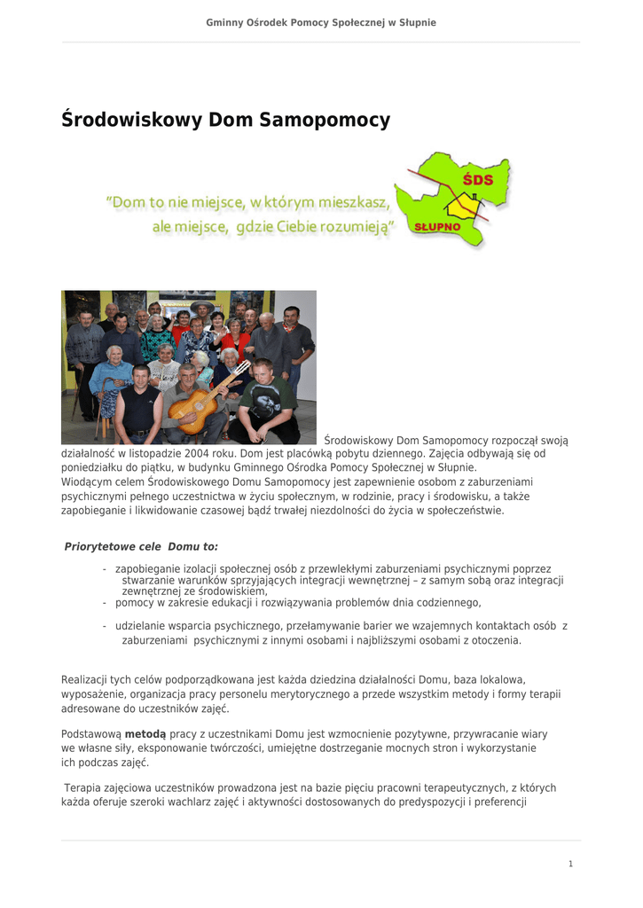 Gminny Ośrodek Pomocy Społecznej w Słupnie Środowiskowy Dom Samopomocy Środowiskowy Dom Samopomocy rozpoczął swoją działalność w listopadzie 2004 roku. Dom jest placówką pobytu dziennego. Zajęcia odbywają się od poniedziałku do piątku, w budynku Gminnego Ośrodka Pomocy Społecznej w Słupnie. Wiodącym celem Środowiskowego Domu Samopomocy jest zapewnienie osobom z zaburzeniami psychicznymi pełnego uczestnictwa w życiu społecznym, w rodzinie, pracy i środowisku, a także zapobieganie i likwidowanie czasowej bądź trwałej niezdolności do życia w społeczeństwie. Priorytetowe cele Domu to: - zapobieganie izolacji społecznej osób z przewlekłymi zaburzeniami psychicznymi poprzez stwarzanie warunków sprzyjających integracji wewnętrznej – z samym sobą oraz integracji zewnętrznej ze środowiskiem, - pomocy w zakresie edukacji i rozwiązywania problemów dnia codziennego, - udzielanie wsparcia psychicznego, przełamywanie barier we wzajemnych kontaktach osób z zaburzeniami psychicznymi z innymi osobami i najbliższymi osobami z otoczenia. Realizacji tych celów podporządkowana jest każda dziedzina działalności Domu, baza lokalowa, wyposażenie, organizacja pracy personelu merytorycznego a przede wszystkim metody i formy terapii adresowane do uczestników zajęć. Podstawową metodą pracy z uczestnikami Domu jest wzmocnienie pozytywne, przywracanie wiary we własne siły, eksponowanie twórczości, umiejętne dostrzeganie mocnych stron i wykorzystanie ich podczas zajęć. Terapia zajęciowa uczestników prowadzona jest na bazie pięciu pracowni terapeutycznych, z których każda oferuje szeroki wachlarz zajęć i aktywności dostosowanych do predyspozycji i preferencji 1 Gminny Ośrodek Pomocy Społecznej w Słupnie uczestników. Zajęcia dla uczestników prowadzone są w kilkuosobowych grupach w następujących pracowniach: 1. Pracownia kulinarna 2. Pracownia artystyczna i witrażu 3. Pracownia krawiecko - gobeliniarska 4. Pracownia modelarstwa (stolarnia, rzeźba) 5. Pracownia usprawniania ruchowego Zajęcia terapeutyczne w Środowiskowym Domu Samopomocy to nie tylko praca w poszczególnych pracowniach tematycznych .Uważamy, że niepełnosprawność nie powinna być przeszkodą w aktywnym życiu i doświadczaniu otaczającej rzeczywistości. Dlatego też proponujemy uczestnikom zajęć różnorodne formy aktywizacji życiowe i społecznej. Są to: Zajęcia psycho-edukacyjne i indywidualne poradnictwo psychologiczne - prowadzone przez psychologa zatrudnionego w Środowiskowym Domu Samopomocy. Spotkania mają na celu przyswajanie przez osoby niepełnosprawne wiadomości i umiejętności psychospołecznych potrzebnych w codziennym życiu. Są to treningi asertywności, warsztaty z psychoprofilaktyki uzależnień, zajęcia relaksacyjne, warsztaty poświęcone metodom przezwyciężania stresu, zajęcia poświęcone kształtowaniu postaw akceptacji swojej niepełnosprawności. Od kilku lat z uczestnikami Domu prowadzone są warsztaty teatralne, zajęcia mają charakter integracyjny, biorą w nich udział uczestnicy ŚDS i osoby z otoczenia. Warsztaty teatralne aktywizują podopiecznych, są również płaszczyzną współpracy młodzieży z osobami niepełnosprawnymi. Działania podejmowane w ramach warsztatów teatralnych mają ogromne znaczenie dla uczestników Środowiskowego Domu Samopomocy w Słupnie. Podczas warsztatów teatralnych uczestnicy mają możliwość poznanie siebie nawzajem (poznania swoich potrzeb i problemów), nawiązania nowych przyjaźni, nabycia nowych umiejętności komunikacyjnych i społecznych, poznania nowych form spędzania czasu wolnego. Ponadto praca grupy teatralnej pod nazwą „A było to tak…”wzmacnia integrację ze środowiskiem lokalnym i ponadlokalnym, jak również jest płaszczyzną powstawania nowych inicjatyw międzypokoleniowych. Uczestnicy Domu redagują gazetkę „A będzie to tak…” - gazetka jest kwartalnikiem powstającym wg pomysłu uczestników zajęć. Zawiera treści dotyczące wydarzeń i planów Środowiskowego Domu Samopomocy w Słupnie. Środowiskowy Dom Samopomocy jest dziennym centrum aktywności dla osób niepełnosprawnych. Dom koncentruje się na rozpoznaniu potrzeb i możliwości osób zgłaszających się do uczestnictwa. Zajęcia w Środowiskowym Domu Samopomocy charakteryzują się systematycznością oraz celowością a przede wszystkim indywidualnym podejściem do każdego uczestnika. Zajęcia odbywają się zgodnie z założeniami podstawowych metod rewalidacyjnych i są realizowane przez zespół wspierająco – aktywizujący w składzie: - kierownik instruktorzy terapii zajęciowej psychiatra psycholog rehabilitant Środowiskowy Dom Samopomocy dążąc do integracji społecznej swoich uczestników współpracuje z: - rodzinami uczestników ŚDS w Słupnie, 2 Gminny Ośrodek Pomocy Społecznej w Słupnie - Organizacjami pozarządowymi działającymi na terenie gm. Słupno (Stowarzyszenie PATRON, Partnerstwo Lokalne „Nasza 19”) , Parafią Rzymskokatolicką p.w. św. Marcina w Słupnie, Niepublicznym Zakładem Opieki Zdrowotnej – Centrum Medyczne „Rodzina” w Słupnie, Klubami Seniora funkcjonującymi na terenie gm. Słupno Innymi placówkami pomocy dla osób niepełnosprawnych (Domy Pomocy, Warsztaty Terapii Zajęciowe, Środowiskowe Domu Samopomocy z województwa mazowieckiego). 3