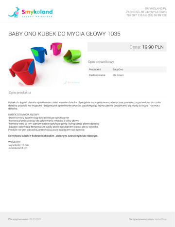 SMYKOLAND.PL ŻABNO 53, 88-342 WYLATOWO 784 387 126 lub (52) 56 99 128 BABY ONO KUBEK DO MYCIA GŁOWY 1035 Cena: 19,90 PLN Opis słownikowy Producent BabyOno Zastosowanie dla dzieci Opis produktu Kubek do kąpieli ułatwia spłukiwanie ciała i włosów dziecka. Specjalnie zaprojektowana, elastyczna powłoka, przystawiona do czoła dziecka pozwala na wygodne i bezpieczne spłukiwanie włosów zapobiegając jednocześnie dostawaniu się wody do oczu i na twarz dziecka. KUBEK DO MYCIA GŁOWY: -Dwie komory zapewniają dokładniejsze spłukiwanie -komora przednia służy do spłukiwania włosów z boku głowy -komora tylna w tym samym czasie spłukuje górną i tylną część głowy dziecka -zawsze sprawdzaj temperaturę wody przed spłukaniem ciała i głowy dziecka. Produkt nie jest zabawką, przechowuj poza zasięgiem rąk dziecka Do wyboru kubek w kolorze niebieskim , zielonym, czerwonym lub różowym. WYMIARY: -wysokość 16 cm -szerokość 8 cm Plik wygenerowano: 09-03-2017 Powered by TCPDF (www.tcpdf.org) Oprogramowanie sklepu: AptusShop