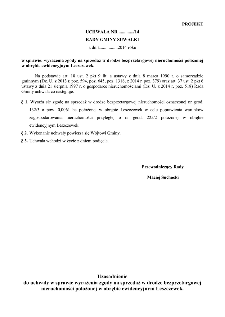 PROJEKT UCHWAŁA NR ............./14 RADY GMINY SUWAŁKI z dnia................2014 roku w sprawie: wyrażenia zgody na sprzedaż w drodze bezprzetargowej nieruchomości położonej w obrębie ewidencyjnym Leszczewek. Na podstawie art. 18 ust. 2 pkt 9 lit. a ustawy z dnia 8 marca 1990 r. o samorządzie gminnym (Dz. U. z 2013 r. poz. 594, poz. 645, poz. 1318, z 2014 r. poz. 379) oraz art. 37 ust. 2 pkt 6 ustawy z dnia 21 sierpnia 1997 r. o gospodarce nieruchomościami (Dz. U. z 2014 r. poz. 518) Rada Gminy uchwala co następuje: § 1. Wyraża się zgodę na sprzedaż w drodze bezprzetargowej nieruchomości oznaczonej nr geod. 132/3 o pow. 0,0061 ha położonej w obrębie Leszczewek w celu poprawienia warunków zagospodarowania nieruchomości przyległej o nr geod. 225/2 położonej w obrębie ewidencyjnym Leszczewek. § 2. Wykonanie uchwały powierza się Wójtowi Gminy. § 3. Uchwała wchodzi w życie z dniem podjęcia. Przewodniczący Rady Maciej Suchocki Uzasadnienie do uchwały w sprawie wyrażenia zgody na sprzedaż w drodze bezprzetargowej nieruchomości położonej w obrębie ewidencyjnym Leszczewek. Zgodnie z art. 18 ust. 2 pkt 9 lit. a ustawy z dnia 8 marca 1990 roku o samorządzie gminnym do wyłącznej właściwości rady gminy należy m.in. podejmowanie uchwał w sprawach majątkowych gminy dotyczących zbycia nieruchomości gruntowych stanowiących własność gminy. Sprzedaż w drodze bezprzetargowej nieruchomości oznaczonej nr geod. 132/3 w obrębie ewidencyjnym Leszczewek w celu poprawienia warunków zagospodarowania nieruchomości przyległej o nr geod. 225/2 położonej w obrębie ewidencyjnym Leszczewek.