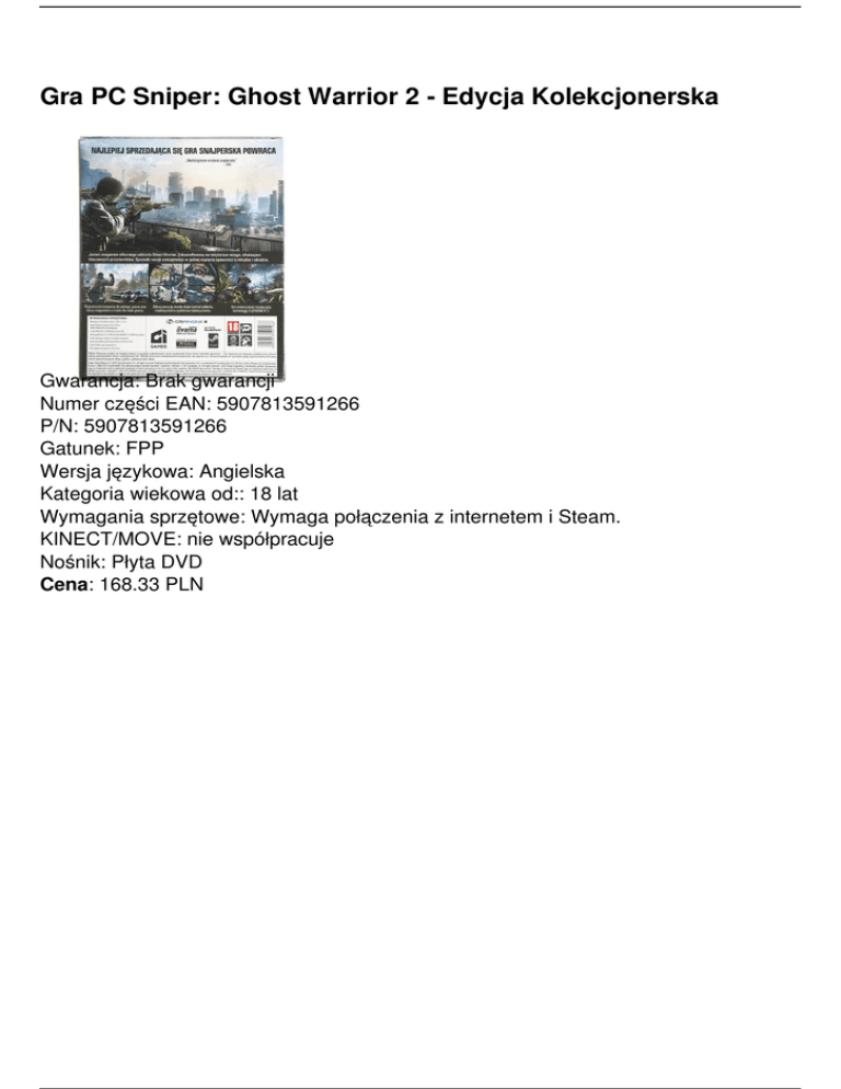 Gra PC Sniper: Ghost Warrior 2 - Edycja Kolekcjonerska Gwarancja: Brak gwarancji Numer części EAN: 5907813591266 P/N: 5907813591266 Gatunek: FPP Wersja językowa: Angielska Kategoria wiekowa od:: 18 lat Wymagania sprzętowe: Wymaga połączenia z internetem i Steam. KINECT/MOVE: nie współpracuje Nośnik: Płyta DVD Cena: 168.33 PLN Powered by TCPDF (www.tcpdf.org)