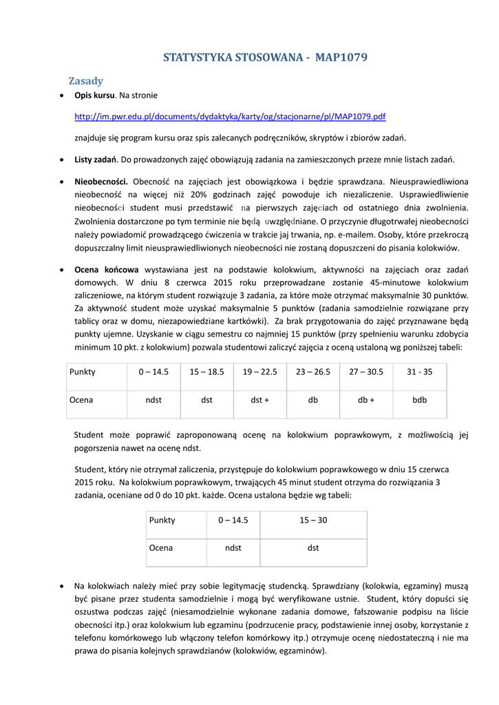 STATYSTYKA STOSOWANA - MAP1079 Zasady Opis kursu. Na stronie http://im.pwr.edu.pl/documents/dydaktyka/karty/og/stacjonarne/pl/MAP1079.pdf znajduje się program kursu oraz spis zalecanych podręczników, skryptów i zbiorów zadań. Listy zadań. Do prowadzonych zajęć obowiązują zadania na zamieszczonych przeze mnie listach zadań. Nieobecności. Obecność na zajęciach jest obowiązkowa i będzie sprawdzana. Nieusprawiedliwiona nieobecność na więcej niż 20% godzinach zajęć powoduje ich niezaliczenie. Usprawiedliwienie nieobecności student musi przedstawić na pierwszych zajęciach od ostatniego dnia zwolnienia. Zwolnienia dostarczone po tym terminie nie będą uwzględniane. O przyczynie długotrwałej nieobecności należy powiadomić prowadzącego ćwiczenia w trakcie jaj trwania, np. e-mailem. Osoby, które przekroczą dopuszczalny limit nieusprawiedliwionych nieobecności nie zostaną dopuszczeni do pisania kolokwiów. Ocena końcowa wystawiana jest na podstawie kolokwium, aktywności na zajęciach oraz zadań domowych. W dniu 8 czerwca 2015 roku przeprowadzane zostanie 45-minutowe kolokwium zaliczeniowe, na którym student rozwiązuje 3 zadania, za które może otrzymać maksymalnie 30 punktów. Za aktywność student może uzyskać maksymalnie 5 punktów (zadania samodzielnie rozwiązane przy tablicy oraz w domu, niezapowiedziane kartkówki). Za brak przygotowania do zajęć przyznawane będą punkty ujemne. Uzyskanie w ciągu semestru co najmniej 15 punktów (przy spełnieniu warunku zdobycia minimum 10 pkt. z kolokwium) pozwala studentowi zaliczyć zajęcia z oceną ustaloną wg poniższej tabeli: Punkty 0 – 14.5 15 – 18.5 19 – 22.5 23 – 26.5 27 – 30.5 31 - 35 Ocena ndst dst dst + db db + bdb Student może poprawić zaproponowaną ocenę na kolokwium poprawkowym, z możliwością jej pogorszenia nawet na ocenę ndst. Student, który nie otrzymał zaliczenia, przystępuje do kolokwium poprawkowego w dniu 15 czerwca 2015 roku. Na kolokwium poprawkowym, trwających 45 minut student otrzyma do rozwiązania 3 zadania, oceniane od 0 do 10 pkt. każde. Ocena ustalona będzie wg tabeli: Punkty 0 – 14.5 15 – 30 Ocena ndst dst Na kolokwiach należy mieć przy sobie legitymację studencką. Sprawdziany (kolokwia, egzaminy) muszą być pisane przez studenta samodzielnie i mogą być weryfikowane ustnie. Student, który dopuści się oszustwa podczas zajęć (niesamodzielnie wykonane zadania domowe, fałszowanie podpisu na liście obecności itp.) oraz kolokwium lub egzaminu (podrzucenie pracy, podstawienie innej osoby, korzystanie z telefonu komórkowego lub włączony telefon komórkowy itp.) otrzymuje ocenę niedostateczną i nie ma prawa do pisania kolejnych sprawdzianów (kolokwiów, egzaminów).