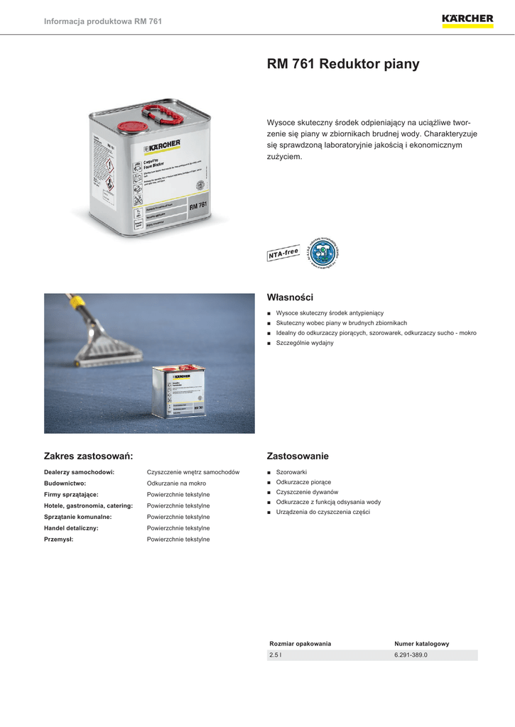 Informacja produktowa RM 761 RM 761 Reduktor piany Wysoce skuteczny środek odpieniający na uciążliwe tworzenie się piany w zbiornikach brudnej wody. Charakteryzuje się sprawdzoną laboratoryjnie jakością i ekonomicznym zużyciem. Własności ■ Wysoce skuteczny środek antypieniący ■ Skuteczny wobec piany w brudnych zbiornikach ■ Idealny do odkurzaczy piorących, szorowarek, odkurzaczy sucho - mokro ■ Szczególnie wydajny Zakres zastosowań: Zastosowanie Dealerzy samochodowi: Czyszczenie wnętrz samochodów ■ Szorowarki Budownictwo: Odkurzanie na mokro ■ Odkurzacze piorące Firmy sprzątające: Powierzchnie tekstylne ■ Czyszczenie dywanów Hotele, gastronomia, catering: Powierzchnie tekstylne Sprzątanie komunalne: Powierzchnie tekstylne Handel detaliczny: Powierzchnie tekstylne Przemysł: Powierzchnie tekstylne ■ Odkurzacze z funkcją odsysania wody ■ Urządzenia do czyszczenia części Rozmiar opakowania Numer katalogowy 2.5 l 6.291-389.0 Informacja produktowa RM 761 Zastosowanie: Środki ostrożności: Środek do stosowania metoda ekstrakcji ■ Wstrząsnąć środek przed użyciem ■ Dodać produkt do zbiornika z brudną wodą ■ Wlać nierozcieńczony środek do zbiornika ■ Chronić przed zamarzaniem. Ostrzeżenia i wytyczne dotycące bezpiecznego użytkowania: Środek do czyszczenia dywanów ■ Dodać produkt do zbiornika z brudną wodą ■ Niebezpieczny ■ H315 Działa drażniąco na skórę. Szorowarki ■ Dodać produkt do zbiornika z brudną wodą ■ H319 Działa drażniąco na oczy. ■ H304 Połknięcie i dostanie się przez drogi oddechowe może grozić Odkurzacze z funkcją odsysania wody ■ Spryskać środkiem powierzchnię mająca kontakt z brudną wodą ■ Dodać produkt do zbiornika z brudną wodą Urządzenia do czyszczenia części ■ Spryskać środkiem powierzchnię mająca kontakt z brudną wodą śmiercią. ■ P280 Stosować rękawice ochronne/odzież ochronną/ochronę oczu/ ochronę twarzy. ■ P305 + P351 + P338 W PRZYPADKU DOSTANIA SIĘ DO OCZU: Ostrożnie płukać wodą przez kilka minut. Wyjąć soczewki kontaktowe, jeżeli są i można je łatwo usunąć. Nadal płukać. ■ P405 Przechowywać pod zamknięciem. ■ P501a Zawartość / pojemnik usuwać zgodnie z przepisami miejscowymi / regionalnymi / narodowymi / międzynarodowymi. Dalsze informacje: ■ Karta charakterystyki substancji niebezpiecznej (MSDS) Dozowanie i wydajność: Zawartość: Metoda czyszczenia: Odkurzacze z funkcją odsysania Roztwór wstępny: Dozowanie: Rodzaj zabrudzeń: Wydajność: 0.5 % 200 l Odkurzacze piorące 0.5 % 200 l Czyszczenie dywanów 0.5 % 200 l Szorowarki 0.5 % 200 l Urządzenia do czyszczenia części 0.5 % 200 l wody Potrzebujesz więcej informacji? Kärcher Sp. z o.o. ul. Stawowa 138-140 31-346 Kraków Polska Tel: 801 811 234 lub 12 63 97 105 Fax: 12 63 97 111 Email: [email protected]