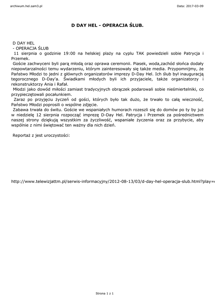 archiwum.hel.sam3.pl Data: 2017-03-09 D DAY HEL - OPERACJA ŚLUB. D DAY HEL - OPERACJA ŚLUB 11 sierpnia o godzinie 19:00 na helskiej plaży na cyplu TAK powiedzieli sobie Patrycja i Przemek. Goście zachwyceni byli parą młodą oraz oprawa ceremonii. Piasek, woda,zachód słońca dodały niepowtarzalności temu wydarzeniu, którym zainteresowały się także media. Przypomnijmy, że Państwo Młodzi to jedni z głównych organizatorów imprezy D-Day Hel. Ich ślub był inauguracją tegorocznego D-Day'a. Świadkami młodych byli ich przyjaciele, także organizatorzy i rekonstruktorzy Ania i Rafał. Młodzi jako dowód miłości zamiast tradycyjnych obrączek podarowali sobie nieśmiertelniki, co przypieczętowali pocałunkiem. Zaraz po przyjęciu życzeń od gości, których było tak dużo, że trwało to całą wieczność, Państwo Młodzi poprosili o wspólne zdjęcie. Zabawa trwała do świtu. Goście we wspaniałych humorach rozeszli się do domów po ty by już w niedzielę 12 sierpnia rozpocząć imprezę D-Day Hel. Patrycja i Przemek za pośrednictwem naszej strony dziękują wszystkim za życzliwość, wspaniałe życzenia oraz za przybycie, aby wspólnie z nimi świętować ten ważny dla nich dzień. Reportaż z jest uroczystości: http://www.telewizjattm.pl/serwis-informacyjny/2012-08-13/03/d-day-hel-operacja-slub.html?play=o Strona 1 z 1