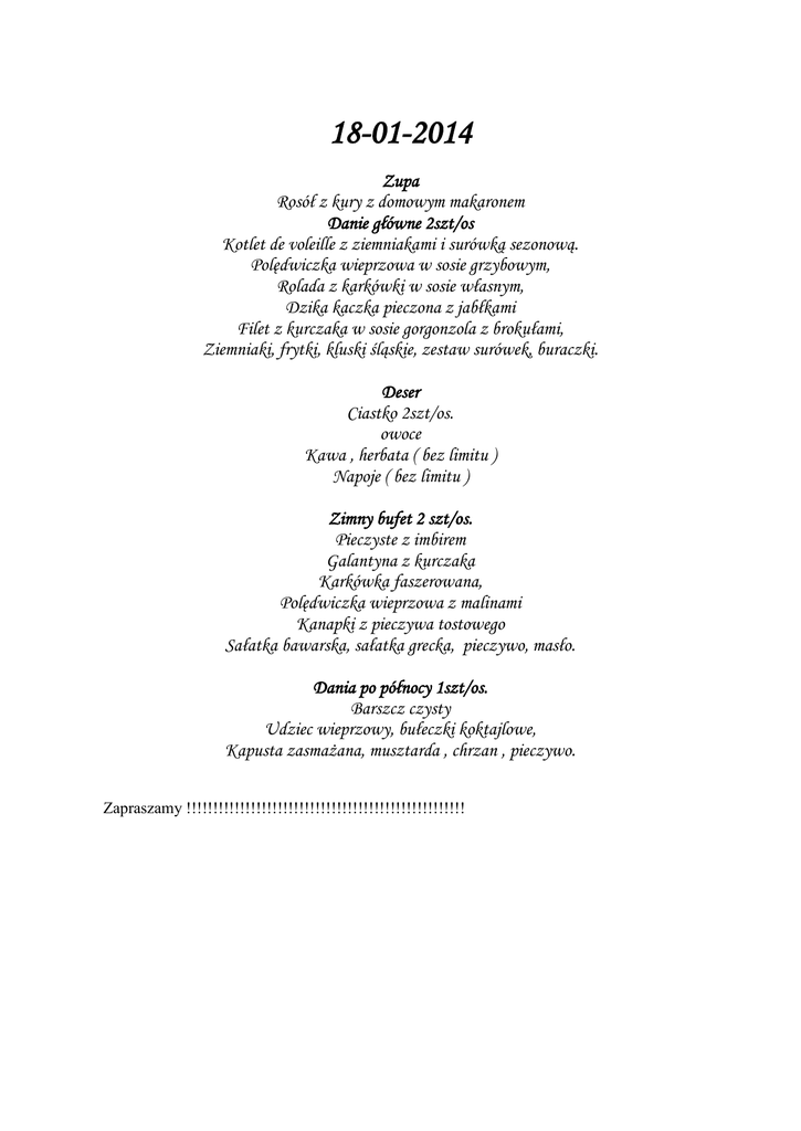 18-01-2014 Zupa Rosół z kury z domowym makaronem Danie główne 2szt/os Kotlet de voleille z ziemniakami i surówką sezonową. Polędwiczka wieprzowa w sosie grzybowym, Rolada z karkówki w sosie własnym, Dzika kaczka pieczona z jabłkami Filet z kurczaka w sosie gorgonzola z brokułami, Ziemniaki, frytki, kluski śląskie, zestaw surówek, buraczki. Deser Ciastko 2szt/os. owoce Kawa , herbata ( bez limitu ) Napoje ( bez limitu ) Zimny bufet 2 szt/os. Pieczyste z imbirem Galantyna z kurczaka Karkówka faszerowana, Polędwiczka wieprzowa z malinami Kanapki z pieczywa tostowego Sałatka bawarska, sałatka grecka, pieczywo, masło. Dania po północy 1szt/os. Barszcz czysty Udziec wieprzowy, bułeczki koktajlowe, Kapusta zasmażana, musztarda , chrzan , pieczywo. Zapraszamy !!!!!!!!!!!!!!!!!!!!!!!!!!!!!!!!!!!!!!!!!!!!!!!!!!!!