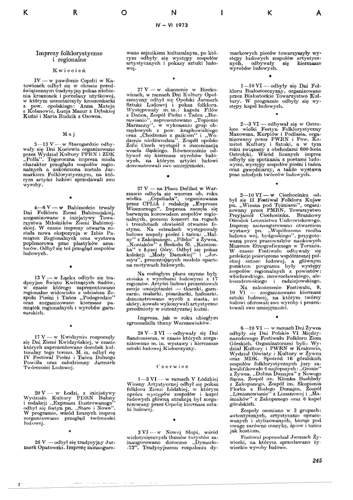 K R O N I IV - VI Imprezy folklorystyczne i regionalne Kwiecień I V •— w pawilonie Cepelii w K a towicach o d b y ł się w okresie przed ś w i ą t e c z n y m tradycyjny pokaz zdobie nia kroszonek i porcelany u ż y t k o w e j , w k t ó r y m uczestniczyły kroszonkarki z pow. opolskiego: Anna Mateja z Kolanowic, Ł u c j a Mazur z Dębskiej K u ź n i i Maria R u d z i k z Osowca. M a j 3— 13 V — w Starogardzie odby w a ł y się D n i Kociewia organizowane przez W y d z i a ł K u l t u r y P P R N i Z D K „ P o l f a " . Tegoroczna impreza m i a ł a charakter p r z e g l ą d u zespołów regio nalnych a z a k o ń c z o n a została Jar m a r k i e m Folklorystycznym, na k t ó r y m a r t y ś c i ludowi sprzedawali swe wyroby. * 4— 6 V — w B a b i m o ś c i e t r w a ł y D n i Folkloru Ziomi Babimojskiej, zorganizowane z inicjatywy Towa rzystwa Miłośników Ziemi Babimoj skiej. W czasie imprezy otwarta zo s t a ł a nowa ekspozycja w Izbie Pa m i ą t e k Regionalnych oraz wystawa poplenerowa prac p l a s t y k ó w ama torów. O d b y ł się też przegląd zespołów ludowych. * 13 V — w Ł ą c k u odbyło się tra dycyjne Święto K w i t n ą c y c h S a d ó w , w czasie k t ó r e g o zaprezentowano regionalne widowisko z u d z i a ł e m Ze społu Pieśni i T a ń c a „ P o d e g r o d z i e " oraz zorganizowano kiermasz pa m i ą t e k regionalnych i w y r o b ó w garn carskich. * 17 V — w K w i d z y n i u rozpoczęły się D n i Ziemi K w i d z y ń s k i e j , w czasie k t ó r y c h zaprezentowano dorobek k u l t u r a l n y tego terenu. M . i n . o d b y ł się I V Festiwal Pieśni i T a ń c a Dolnego Powiśla oraz całodzienny J a r m a r k Twórczości Ludowej. 20 V — w Łodzi, z i n i c j a t y w y Wydziału Kultury P D R N Bałuty i redakcji „ E x p r e s s u Ilustrowanego" o d b y ł się festyn p n . „ S t a r e i N o w e " . W programie, wśród licznych imprez zorganizowano przogląd twórczości ludowej. * 26 V — o d b y ł się tradycyjny Jar m a r k Opatowski. I m p r e z ę zainauguro K A 1973 wano sejmikiem k u l t u r a l n y m , po k t ó r y m o d b y ł y się w y s t ę p y zespołów artystycznych i pokazy sztuki ludo wej. * 27 V — w skansenie w Bierko wicach, w ramach D n i K u l t u r y Opol szczyzny o d b y ł się Opolski Jarmark Sztuki Ludowej i pokaz folkloru. W y s t ę p o w a ł y m . i n . : kapela F i l ó w z D a ń c a , Zespół Pieśni i T a ń c a „Bierawianio", zaprezentowano „Topienie Marzanny", w wykonaniu grup ob rzędowych z pow. krapkowickiego oraz „Chodzenie z g a i k i e m " i „ W o dzenie n i e d ź w i e d z i a " . Zespół opolski Zofii Czech w y s t ą p i ł z inscenizacją wesela śląskiego. Równocześnie od b y w a ł się kiermasz w y r o b ó w ludo wych, na k t ó r y m a r t y ś c i ludowi demonstrowali swe umiejętności. • markowych pieców t o w a r z y s z y ł y w y s t ę p y ludowych zespołów artystycz nych, odbywały się kiermasze w y r o b ó w ludowych. * 1— 1 0 V I — o d b y ł y się D n i Fol k l o r u B i a ł o s t o c c z y z n y , organizowane przez Białostockie Towarzystwo K u l t u r y . W programie o d b y ł y się w y s t ę p y kapel ludowych. * 2— 3 V I — o d b y w a ł się w Ostrołęco w i e l k i Festyn Folklorystyczny Mazowsza, K u r p i ó w i Podlasia, orga nizowany przez P W R N i Pow. K o m i t e t K u l t u r y i Sztuki, a w t y m roku z w i ą z a n y z obchodami 600-lecia Ostrołęki. W ś r ó d licznych imprez o d b y ł y się spotkania z poetami ludo w y m i , w y s t ę p y zespołów pieśni i t a ń c a oraz g a w ę d z i a r z y , a t a k ż e wystawa prac m ł o d y c h t w ó r c ó w ludowych. * 27 V — na Placu Defilad w War szawie o d b y ł a się wzorem ub. r o k u wielka „Cepeliada", organizowana przez C P L i A i redakcję „ E x p r e s s u Wieczornego". Impreza zaczęła się b a r w n y m korowodem zespołów regio nalnych, poczem koncert na rogach i trombitach obwieścił otwarcie fe stynu. Na estradach w y s t ę p o w a ł y ludowe zespoły pieśni i t a ń c a : „ H a l n y " z Zakopanego, „ P i l s k o " z Ż y w c a , „ K o n i a k ó w " z Beskidu Śl. „ K a m i o n k a " z Łysej G ó r y . O d b y ł się pokaz kolekcji „ M o d y D a m s k i e j " i „ J e r seyu", p r e z e n t u j ą c y c h modele oparte na motywach ludowych. N a rozległym placu czynne b y ł y stoiska z wyrobami ludowymi z 17 regionów. Artyści ludowi prezentowali swoje umiejętności — tkaczki, garn carze, malarki, pisankarki, hafciarki, demonstrowano w y r ó b z ciasta, zo s k ó r y , kowale w y k o n y w a l i artystyczne przedmioty w autentycznej k u ź n i . Impreza, j a k w roku u b i e g ł y m zgromadziła t ł u m y W a r s z a w i a k ó w . 28 V — 3 VT — o d b y w a ł y się D n i Sandomierza, w czasie k t ó r y c h zorga nizowano m . i n . wystawy i kiermasze sztuki ludowej Kielecczyzny. Czerwiec 1—3 V I — w ramach V Łódzkiej Wiosny Artystycznej o d b y ł się pokaz folkloru Ziemi Ł ó d z k i e j , w k t ó r y m oprócz w y s t ę p ó w zespołów i kapel ludowych główną a t r a k c j ą b y ł zorga nizowany przez Cepelię kiormasz sztu k i ludowej. * 3 V I — w Nowej Słupi, wśród wielotysięcznych t ł u m ó w t u r y s t ó w za inaugurowano doroczne „ D y m a r k i -73". Tradycyjnemu rozpaleniu dy- 2—10 V I — w Ciechocinku od b y ł się I I Festiwal F o l k l o r u K u j a w p n . „ W i o s n a pod T ę ż n i a m i " , organi zowany przez P M R N , Towarzystwo Przyjaciół Ciechocinka, Branżowy Ośrodek Lecznictwa Uzdrowiskowego. I m p r e z ę zainaugurowano otwarciem wystawy p n . „Współczesna rzeźba ludowca w o j . bydgoskiego", przygoto w a n ą przez p r a c o w n i k ó w naukowych Muzeum Etnograficznego w T o r u n i u . W czasie Festiwalu o d b y w a ł y się prelekcje poświęcone współczesnej pol skiej sztuce ludowej, a g 