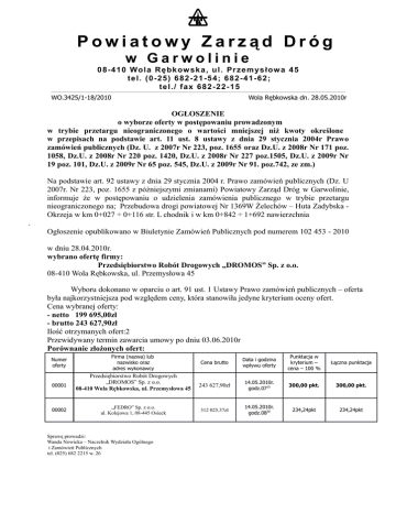 Powiatowy Zarząd Dróg w Garwolinie 0 8 -41 0 Wo la R ę bk ow sk a , ul . Pr ze m ys łow a 4 5 te l. (0 -25 ) 6 8 2 -21 -5 4; 6 82 -4 1 -62 ; te l./ fa x 6 82 -2 2 -15 ==================================================================================================================================================================================================== WO.3425/1-18/2010 Wola Rębkowska dn. 28.05.2010r OGŁOSZENIE o wyborze oferty w postępowaniu prowadzonym w trybie przetargu nieograniczonego o wartości mniejszej niż kwoty określone w przepisach na podstawie art. 11 ust. 8 ustawy z dnia 29 stycznia 2004r Prawo zamówień publicznych (Dz. U. z 2007r Nr 223, poz. 1655 oraz Dz.U. z 2008r Nr 171 poz. 1058, Dz.U. z 2008r Nr 220 poz. 1420, Dz.U. z 2008r Nr 227 poz.1505, Dz.U. z 2009r Nr 19 poz. 101, Dz.U. z 2009r Nr 65 poz. 545, Dz.U. z 2009r Nr 91. poz.742, ze zm.) Na podstawie art. 92 ustawy z dnia 29 stycznia 2004 r. Prawo zamówień publicznych (Dz. U 2007r. Nr 223, poz. 1655 z późniejszymi zmianami) Powiatowy Zarząd Dróg w Garwolinie, informuje że w postępowaniu o udzielenia zamówienia publicznego w trybie przetargu nieograniczonego na; Przebudowa drogi powiatowej Nr 1369W Żelechów – Huta Zadybska Okrzeja w km 0+027 ÷ 0+116 str. L chodnik i w km 0+842 ÷ 1+692 nawierzchnia . Ogłoszenie opublikowano w Biuletynie Zamówień Publicznych pod numerem 102 453 - 2010 w dniu 28.04.2010r. wybrano ofertę firmy: Przedsiębiorstwo Robót Drogowych „DROMOS” Sp. z o.o. 08-410 Wola Rębkowska, ul. Przemysłowa 45 Wyboru dokonano w oparciu o art. 91 ust. 1 Ustawy Prawo zamówień publicznych – oferta była najkorzystniejsza pod względem ceny, która stanowiła jedyne kryterium oceny ofert. Cena wybranej oferty: - netto 199 695,00zł - brutto 243 627,90zł Ilość otrzymanych ofert:2 Przewidywany termin zawarcia umowy po dniu 03.06.2010r Porównanie złożonych ofert: Numer oferty 00001 00002 Firma (nazwa) lub nazwisko oraz adres wykonawcy Przedsiębiorstwo Robót Drogowych „DROMOS” Sp. z o.o. 08-410 Wola Rębkowska, ul. Przemysłowa 45 „FEDRO” Sp. z o.o. ul. Kolejowa 1, 08-445 Osieck Sprawę prowadzi: Wanda Nowicka – Naczelnik Wydziału Ogólnego i Zamówień Publicznych tel. (025) 682 2215 w. 26 Cena brutto Data i godzina wpływu oferty Punktacja w kryterium – cena – 100 % Łączna punktacja 243 627,90zł 14.05.2010r. godz.0715 300,00 pkt. 300,00 pkt. 312 025,37zł 14.05.2010r. godz.0830 234,24pkt 234,24pkt Powiatowy Zarząd Dróg w Garwolinie 0 8 -41 0 Wo la R ę bk ow sk a , ul . Pr ze m ys łow a 4 5 te l. (0 -25 ) 6 8 2 -21 -5 4; 6 82 -4 1 -62 ; te l./ fa x 6 82 -2 2 -15 ==================================================================================================================================================================================================== WO.3425/1-18/2010 Wola Rębkowska dn. 28.05.2010r Przedsiębiorstwo Robót Drogowych „DROMOS” Sp. z o.o. 08-410 Wola Rębkowska, ul. Przemysłowa 45 OGŁOSZENIE o wyborze oferty w postępowaniu prowadzonym w trybie przetargu nieograniczonego o wartości mniejszej niż kwoty określone w przepisach na podstawie art. 11 ust. 8 ustawy z dnia 29 stycznia 2004r Prawo zamówień publicznych (Dz. U. z 2007r Nr 223, poz. 1655 oraz Dz.U. z 2008r Nr 171 poz. 1058, Dz.U. z 2008r Nr 220 poz. 1420, Dz.U. z 2008r Nr 227 poz.1505, Dz.U. z 2009r Nr 19 poz. 101, Dz.U. z 2009r Nr 65 poz. 545, Dz.U. z 2009r Nr 91. poz.742, ze zm.) Na podstawie art. 92 ustawy z dnia 29 stycznia 2004 r. Prawo zamówień publicznych (Dz. U 2007r. Nr 223, poz. 1655 z późniejszymi zmianami) Powiatowy Zarząd Dróg w Garwolinie, informuje że w postępowaniu o udzielenia zamówienia publicznego w trybie przetargu nieograniczonego na; Przebudowa drogi powiatowej Nr 1369W Żelechów – Huta Zadybska Okrzeja w km 0+027 ÷ 0+116 str. L chodnik i w km 0+842 ÷ 1+692 nawierzchnia . Ogłoszenie opublikowano w Biuletynie Zamówień Publicznych pod numerem 102 453 - 2010 w dniu 28.04.2010r. wybrano ofertę firmy: Przedsiębiorstwo Robót Drogowych „DROMOS” Sp. z o.o. 08-410 Wola Rębkowska, ul. Przemysłowa 45 Wyboru dokonano w oparciu o art. 91 ust. 1 Ustawy Prawo zamówień publicznych – oferta była najkorzystniejsza pod względem ceny, która stanowiła jedyne kryterium oceny ofert. Cena wybranej oferty: - netto 199 695,00zł - brutto 243 627,90zł Ilość otrzymanych ofert:2 Przewidywany termin zawarcia umowy po dniu 03.06.2010r Porównanie złożonych ofert: Numer oferty 00001 Firma (nazwa) lub nazwisko oraz adres wykonawcy Przedsiębiorstwo Robót Drogowych „DROMOS” Sp. z o.o. 08-410 Wola Rębkowska, ul. Przemysłowa 45 Cena brutto Data i godzina wpływu oferty Punktacja w kryterium – cena – 100 % Łączna punktacja 243 627,90zł 14.05.2010r. godz.0715 300,00 pkt. 300,00 pkt. 00002 „FEDRO” Sp. z o.o. ul. Kolejowa 1, 08-445 Osieck 312 025,37zł 14.05.2010r. godz.0830 234,24pkt 234,24pkt Sprawę prowadzi: Wanda Nowicka – Naczelnik Wydziału Ogólnego i Zamówień Publicznych tel. (025) 682 2215 w. 26 Powiatowy Zarząd Dróg w Garwolinie 0 8 -41 0 Wo la R ę bk ow sk a , ul . Pr ze m ys łow a 4 5 te l. (0 -25 ) 6 8 2 -21 -5 4; 6 82 -4 1 -62 ; te l./ fa x 6 82 -2 2 -15 ==================================================================================================================================================================================================== WO.3425/1-18/2010 Wola Rębkowska dn. 28.05.2010r „FEDRO” Sp. z o.o. ul. Kolejowa 1, 08-445 Osieck OGŁOSZENIE o wyborze oferty w postępowaniu prowadzonym w trybie przetargu nieograniczonego o wartości mniejszej niż kwoty określone w przepisach na podstawie art. 11 ust. 8 ustawy z dnia 29 stycznia 2004r Prawo zamówień publicznych (Dz. U. z 2007r Nr 223, poz. 1655 oraz Dz.U. z 2008r Nr 171 poz. 1058, Dz.U. z 2008r Nr 220 poz. 1420, Dz.U. z 2008r Nr 227 poz.1505, Dz.U. z 2009r Nr 19 poz. 101, Dz.U. z 2009r Nr 65 poz. 545, Dz.U. z 2009r Nr 91. 