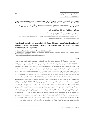èæ ƱřźƿřƾſŚƴƃƵźƄůƲưŬƳřƽ ƶƯŚƳ æèíîèåçèæéê ƽƹŹMentha longifolia (Lamiaceae)ƾƷƺĩƽƶƳƺěžƳŚſř ƾƄĩƶƴĩ źŧřƾſŹźŝ ƪƀºƗŹƺºŞƳŻźŝƱōźǀŧŐţƹVarroa destructor (Acari: Varroidae)řƹŹřƹƽƶƴĩ Apis mellifera (Hym.: Apidae)ƾƿŚěƹŹř æ çƾŞſŚưƸƏƲǀƀůƭLjƛƹ *ƹæŹƺěƾƯźŰƯŶǀƘſ ƾưſŚƣŶǀůƹ ũźĩŹƺƄĩƾƯřŵƭƺƬƗšŚƤǀƤŰţƽƶƀſƺƯ çƱřźƸţŽŹŶƯŢǀŝźţƵŚĮƄƳřŵƽŻŹƹŚƄĩƽƵŶĪƄƳřŵƽŻŹƹŚ ƄĩƾſŚƴƃƵźƄůƵƹźĭ æ [email protected]ƾĪǀƳƹźŤĪƫřŢƀ욌ŞţŚĪƯƩƺŘƀƯ* Acaricidal activity of essential oil from Mentha longifolia(Lamiaceae) against Varroa destructor (Acari: Varroidae) and its effect on Apis mellifera (Hym.: Apidae) V. Ghasemi1, S. Moharramipour1&* and G. H. Tahmasbi2 1. Department of Entomology, Faculty of Agriculture, Tarbiat Modares University, Tehran, Iran, 2. Animal Science Research Institute, Karaj, Iran. *Corresponding author, E-mail: [email protected] ƵŶǀĪģ ƾƿŚººěƹŹřƪƀººƗŹƺººŞƳŻšŚººƟōƲƿźººţƮººƸƯŻřƾººĪƿVarroa destructor Anderson & TruemanřƹŹřƹƽƶººƴĩ ƩŚƤŤƳřƲǀƴĤưƷƹƪƀƗŹƺŞƳŻƽŶƃŹƞƬŤŴƯƪůřźƯƞƴƫƺưƷŻřƶƿŸƜţŚŝƶĩŶƃŚŝƾƯƱŚƸūźſŚţźſŹŵ Apis mellifera L. ŻřƵŵŚƠŤºſřźǀųřƽŚƷƩŚſƾƏŹŵ ŶƴĩƾƯŵŹřƹƽŹřŵŹƺŞƳŻŢƘƴƇ ƶŝřŹƾƿLJŚŝƽŵŚƈŤƣřšŹŚƀųƾſƹźƿƹƽřŻƽŹŚưǀŝƪƯřƺƗ ŢſřƵŶƃƹŶƴĩšLJƺƈŰƯƾĭŵƺƫōƹŢƟōƲƿřŹŵŢƯƹŚƤƯŵŚŬƿřƶŝźŬƴƯřƹŹřƹƽƶƴĩƩźŤƴĩŹƺƔƴƯƶŝƾƿŚǀưǀƃƽŚƷ ŢƟō Ƃĩ ŹƺºŞƳŻƹřƹŹřƹƽƶƴ ĩźŝMentha longifolia L.ƾƷƺĩƽƶƳƺěžƳŚſřƾƀƠƴţŢǀưſƱřżǀƯƾſŹźŝźƋŚůƢǀƤŰţƕƺƋƺƯřŸƫ ÑåtÒƾŞƀƳŢŝƺƏŹŽƺǀƀƬſƽƶūŹŵ çÒtæƽŚƯŵŚŝŶƃŹơŚţřƎƿřźƃŹŵƵŵŚƯƚƫŚŝƽŚƷƶƴĩŹƺƔƴƯƲƿŶŝ ŶƃŚŝƾƯƪƀƗ ŹŚưǀţřƺƷźŤǀƫźŝźŤǀƫƹźĪǀƯèìÒŚţåÒŻřƶƘƫŚƐƯŵŹƺƯžƳŚſřƞƬŤŴƯƽŚƷŢƔƬƛŚŝŢƗŚſ æåšŶƯƶŝƾĪƿŹŚţƹŶƇŹŵ ƹŶºƇŹŵÑÒ Òå ƾŞƀºƳŢŝƺƏŹƹŽƺǀƀƬſƽƶūŹŵ èç ƽŚƯŵ ŹƺţŚŝƺĪƳřƎƿřźƃŹŵźĭŹŚĩƪƀƗƽŚƷŹƺŞƳŻ ƲǀƴĤưƷŶƳŶƃ ŹřźƣřƺƷźŤǀƫźŝźŤǀƫƹźĪǀƯÓçÒŚţåÓçŻřƾƷƺĩƽƶƳƺěžƳŚſřƞƬŤŴƯƽŚƷ ŢƔƬƛźǀŧ ŐţŢŰţŢƗŚſæåšŶƯƶŝƾĪƿŹŚţ ĨƿźƷƹƾƷŵžƳŚſřƕƹźƃŻřžěŹřźĪţźƷƽřźŝƵŶƳŻƹƵŵźƯ ŵřźƟřŵřŶƘţŶƳŶƃƾůřźƏŹřźĪţÑŹŵŚƷŹŚưǀţƽƶưƷ ŶƴŤƟźĭ ƱŚºƯŻƹŢºƔƬƛƂƿřżºƟřŚºŝƪƀºƗŹƺºŞƳŻƹřƹŹřƹƽƶºƴĩźºǀƯƹīźƯƱřżǀƯƶĩŵřŵƱŚƄƳŪƿŚŤƳŶƃƁŹŚưƃŹŚŝĨƿŢƗŚſ ƹçåÒŜǀţźţƶŝ ƾƷŵžƳŚſřƕƹźƃŻřžěŢƗŚſ æåƹîřƹŹřƹƽƶƴĩƽřźŝ LC50ƱřżǀƯŢſřƵŵźĩřŶǀěƂƿřżƟřƾƷŵžƳŚſř ŻřžºěŢƗŚºſæåƹîƾºƏŹŵƪƀºƗ ŹƺºŞƳŻŵŹƺºƯŹŵLC50ƱřżºǀƯƶºĩƾƫŚůŹŵ ŶƃƶŞſŚŰƯřƺƷźŤǀƫźŝźŤǀƫƹźĪǀƯæÓÒ ƽƶºƳƺěžƳŚſřƶŝřƹŹřƹƽƶƴĩźŤƄǀŝŢǀſŚƀů ƽƵŶƴƷŵ ƱŚƄƳƶĩŵƺŝřƺƷźŤǀƫźŝźŤǀƫƹźĪǀƯ ÑìÓ ƹ Òåí ŜǀţźţƶŝƾƷŵžƳŚſř ƱŚºƯŻšŶºƯƹŢºƔƬƛƮǀºƔƴţƽřźºŝƽźŤƄºǀŝšŚºƤǀƤŰţŢſřƭŻLJ ƲƿřźŝŚƴŝ ŢſřƾŗŚěƹŹř ƪƀƗŹƺŞƳŻŚŝƶƀƿŚƤƯŹŵƾƷƺĩ ŵƺưƳƵŵŚƠŤſřŚƷƱŚŤſŹƺŞƳŻŹŵřƹŹřƹ ƽƶƴĩƩźŤƴĩƽŚƷ ƶƯŚƳźŝŹŵƱōŻřƱřƺŤŝŚţŵźǀĭšŹƺƇƾƷƺĩ ƽƶƳƺěƾƷŵ žƳŚſř æèííææçìƁźƿŸěæèííéçŢƟŚƿŹŵ ÐÏ ƾƷƺƧƽƶƳƺěžƳŚſřƾƄƧ ƶƴƧźŧřƾſŹźŝ ƱřŹŚƨưƷƹƾưſŚƣ ƾŗŚěƹŹřƪƀƗŹƺŞƳŻƾƀƠƴţŢǀưſƾƷƺĩƽƶƳƺěřƹŹřƹ ƽƶƴĩ ƽŶǀƬĩƱŚĭĥřƹ Abstract Varroa destructor Anderson & Trueman is one of the most important pests of Apis mellifera L. world widely. It causes great economic loss to the beekeeping industry through feeding on various developmental stages of bees and by transmission of pathogenic viral agents. Recently, application of chemical pesticides has led to the occurrence of mite resistance and contamination of hive products. Therefore, the objective of the current study is to evaluate fumigant toxicity of essential oil from Mentha longifolia L. against varroa mite and honey bee. Adult females of varroa mites were treated with different concentrations of essential oil (from 0.5 to 3.75 µl/l air) at 25°C and 40% RH in darkness for 10 h. Also, worker honey bees were exposed to concentrations of essential oil (from 0.62 to 6.25 µl/l air) in incubator set at 32°C and 45 - 50% RH in dark for 10 h. All experiments were conducted with four replications. The number of dead and live treated animals was counted each hour from commencement of exposure. Results showed that the mortality was increased as concentration and exposure time of the oil increased. Estimated LC50 value of M. longifolia treated on V. destructor 9 and 10 h after exposure was 2.05 and 1.65 µl/l air, respectively. However, LC50 values of the oil on A. mellifera at the same exposure times were 5.08 and 4.76 µl/l air, respectively. These findings indicate that varroa mite is more susceptible than A. mellifera. Therefore, more comprehensive experiments are necessary to find appropriate concentration and exposure time of M. longifolia essential oil in varroa mite control programs in apiaries. Key words: Varroa destructor, Mentha longifolia, Fumigant toxicity, Apis mellifera ƶƯŶƤƯ ŹƺºŞƳŻŢºƟōƲƿźºţŹƹō ƱŚƿŻƱřƺƴƗ ƶŝVarroa destructor Anderson & TruemanřƹŹřƹƽƶƴĩ źºſŚţźºſŹŵƽŹřŵŹƺºŞƳŻŢƘƴƇƽƵŶƴƴĩ ŶƿŶƸţƪƯŚƗƲƿ ƮƸƯƹ źţ Apis mellifera L.ƾƿŚěƹŹřƪƀƗ