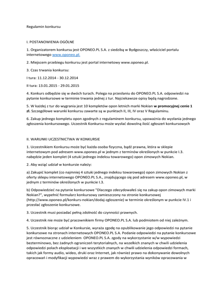 Regulamin konkursu I. POSTANOWIENIA OGÓLNE 1. Organizatorem konkursu jest OPONEO.PL S.A. z siedzibą w Bydgoszczy, właściciel portalu internetowego www.oponeo.pl. 2. Miejscem przebiegu konkursu jest portal internetowy www.oponeo.pl. 3. Czas trwania konkursu: I tura: 11.12.2014 - 30.12.2014 II tura: 13.01.2015 - 29.01.2015 4. Konkurs odbędzie się w dwóch turach. Polega na przesłaniu do OPONEO.PL S.A. odpowiedzi na pytanie konkursowe w terminie trwania jednej z tur. Najciekawsze opisy będą nagrodzone. 5. W każdej z tur do wygrania jest 10 kompletów opon letnich marki Nokian w promocyjnej cenie 1 zł. Szczegółowe warunki konkursu zawarte są w punktach II, III, IV oraz V Regulaminu. 6. Zakup jednego kompletu opon zgodnych z regulaminem konkursu, upoważnia do wysłania jednego zgłoszenia konkursowego. Uczestnik Konkursu może wysłać dowolną ilość zgłoszeń konkursowych II. WARUNKI UCZESTNICTWA W KONKURSIE 1. Uczestnikiem Konkursu może być każda osoba fizyczna, bądź prawna, która w sklepie internetowym pod adresem www.oponeo.pl w jednym z terminów określonych w punkcie I.3. nabędzie jeden komplet (4 sztuki jednego indeksu towarowego) opon zimowych Nokian. 2. Aby wziąć udział w konkursie należy: a) Zakupić komplet (co najmniej 4 sztuki jednego indeksu towarowego) opon zimowych Nokian z oferty sklepu internetowego OPONEO.PL S.A., znajdującego się pod adresem www.oponeo.pl, w jednym z terminów określonych w punkcie I.3. b) Odpowiedzieć na pytanie konkursowe "Dlaczego zdecydowałeś się na zakup opon zimowych marki Nokian?", wypełnić formularz konkursowy zamieszczony na stronie konkursowej (http://www.oponeo.pl/konkurs-nokian/dodaj-zgloszenie) w terminie określonym w punkcie IV.1 i przesłać zgłoszenie konkursowe. 3. Uczestnik musi posiadać pełną zdolność do czynności prawnych. 4. Uczestnik nie może być pracownikiem firmy OPONEO.PL S.A. lub podmiotem od niej zależnym. 5. Uczestnik biorąc udział w Konkursie, wyraża zgodę na opublikowanie jego odpowiedzi na pytanie konkursowe na stronach internetowych OPONEO.PL S.A. Podanie odpowiedzi na pytanie konkursowe jest równoznaczne z udzieleniem OPONEO.PL S.A. zgody na wykorzystanie w/w wypowiedzi bezterminowo, bez żadnych ograniczeń terytorialnych, na wszelkich znanych w chwili udzielenia odpowiedzi polach eksploatacji i we wszystkich znanych w chwili udzielenia odpowiedzi formach, takich jak formy audio, wideo, druki oraz Internet, jak również prawo na dokonywanie dowolnych opracowań i modyfikacji wypowiedzi wraz z prawem do wykorzystania wyników opracowania w podanej wyżej formie oraz na decydowanie o sposobie oznaczania lub pomijaniu oznaczania autorstwa. 6. Laureat Konkursu wyraża zgodę na opublikowanie jego danych osobowych oraz odpowiedzi na pytanie konkursowe na stronach internetowych OPONEO.PL S.A. III. PRZEDMIOT WYGRANEJ W KONKURSIE 1. Nagrodą główną w konkursie jest komplet opon letnich marki Nokian (4 sztuki jednego indeksu towarowego) w promocyjnej cenie 1 zł. Zwycięzca konkursu może wybrać dowolny komplet opon letnich marki Nokian dostępny w sprzedaży w sklepie internetowym pod adresem www.oponeo.pl, z zastrzeżeniem, iż wybrane opony muszą mieć identyczny rozmiar, jak opony zimowe z zwycięskiego zgłoszenia konkursowego. 2. W przypadku nagród, na rzecz osób fizycznych nieprowadzących działalności gospodarczej, której wartość nie przekracza kwoty 760 zł, jej realizacja nie podlega podatkowi od osób fizycznych zgodnie z art. 21 ust. 1 pkt 68 ustawy z dnia 26 lipca 1991 r. o podatku dochodowym od osób fizycznych (Dz. U. z 1993 r., Nr 90, poz. 416 z późn. zm.). 3. W przypadku nagród, na rzecz osób fizycznych nieprowadzących działalności, której wartość przekracza kwotę 760 zł, jej realizacja podlega podatkowi od osób fizycznych zgodnie z art. 31 ust. 1 pkt 2 ustawy z dnia 26 lipca 1991 r. o podatku dochodowym od osób fizycznych (Dz. U. z 1993 r., Nr 90, poz. 416 z późn. zm.). Zwycięzca konkursu zobowiązuje się zapłacić zryczałtowany 10% podatek dochodowy od osób fizycznych od nagrody, której wartość przekracza kwotę 760 zł. Informacja o kwocie podatku zostanie przesłana wraz z oryginałem faktury za promocyjny zakup opon letnich. Wartość faktury za zakup promocyjny zostanie powiększona o kwotę podatku. 4. W przypadku nagród na rzecz osób fizycznych prowadzących działalność gospodarczą, wartość nagrody należy doliczyć do przychodów zgodnie z art. 14 pkt 2 ust. 8 Ustawy o pod. od os. fizycznych. 5. W przypadku nagród na rzecz osób prawnych jej realizacja podlega podatkowi zgodnie z art. 12 pkt.1 ust.2 i pkt 5a ustawy z dnia 15 lutego 1992 o podatku dochodowym od osób prawnych (Dz. U. z 2000 r. nr 54, poz. 654 z późn. zmianami). IV. TERMINY 1. Uczestnik może wziąć udział w konkursie, gdy dokona zakupu opon objętych sprzedażą konkursową w jednym z terminów określonych w punkcie I.3, a następnie prześle zgłoszenie konkursowe w terminie nie późniejszym, niż 7 dni kalendarzowych od dnia zakończenia danej tury. Decyduje data wpłynięcia zgłoszenia konkursowego do bazy danych OPONEO.PL S.A. 2. Zakup kompletu opon w jednym z terminów określonych w punkcie I.3 upoważnia Uczestnika do uczestnictwa tylko w tej turze konkursu, której termin trwania pokrywa się z terminem zakupu. 3. Wybór najciekawszych odpowiedzi na pytanie konkursowe, a następnie wybór spośród nich Laureatów konkursu, odbędzie się w siedzibie firmy OPONEO.PL S.A.. Wyniki konkursu zostaną ogłoszone w następujących terminach: I tura: 30.01.2015 II tura: 27.02.2015 4. Laureaci konkursu zostaną powiadomieni korespondencyjnie (e-mail) lub telefonicznie w przeciągu 2 dni roboczych od podjęcia decyzji przez OPONEO.PL S.A. 5. Ustalenie między Organizatorem a Laureatami terminu przekazania nagrody, powinno nastąpić w ciągu 14 dni od powiadomienia o wygranej, pod rygorem utraty prawa do niej. Nie ustalenie terminu w w