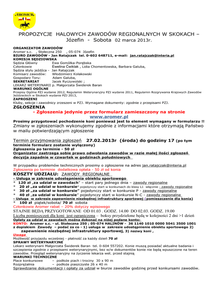 PROPOZYCJE HALOWYCH ZAWODÓW REGIONALNYCH W SKOKACH – Józefin - Sobota 02 marca 2013r. ORGANIZATOR ZAWODÓW Aromer s.c. , Stołeczna 250 , 05-074 Józefin BIURO ZAWODÓW - Jan Ratajczak tel. 0-602 648711, e-mail: [email protected] KOMISJA SĘDZIOWSKA Sędzia Główny Ewa Gomółka-Porębska Członkowie Ewelina Ćwiklak , Lidia Chomentowska, Barbara Galuba, Sędzia stylu jeźdźca - Jan Ratajczak Komisarz zawodów: Włodzimierz Kołakowski Gospodarz Toru: Adam Galuba, SEKRETARIAT Jacek Ryczywolski ; LEKARZ WETERYNARII p. Małgorzata Świderek Baran WARUNKI OGÓLNE Przepisy Ogólne PZJ wydanie 2012, Regulamin Weterynaryjny PZJ wydanie 2011, Regulamin Rozgrywania Krajowych Zawodów Jeździeckich w Skokach wydanie PZJ 2013, ZAPROSZENI Kluby, sekcje i zawodnicy zrzeszeni w PZJ. Wymagane dokumenty: zgodnie z przepisami PZJ. ZGŁOSZENIA - Zgłoszenia jedynie przez formularz zamieszczony na stronie www.aromer.pl Prosimy przygotować pochodzenie koni ponieważ jest to element wymagany w formularzu !! Zmiany w zgłoszeniach wykonujemy zgodnie z informacjami które otrzymają Państwo w mailu potwierdzającym zgłoszenie Termin przyjmowania zgłoszeń 27.02.2013r (środa) do godziny 17 (po tym terminie formularz zostanie wyłączony) Zgłoszenia po terminie - 50 zł Organizator zastrzega sobie prawo odwołania zawodów w razie małej ilości zgłoszeń decyzja zapadnie w czwartek w godzinach południowych W przypadku problemów technicznych prosimy o zgłoszenie na adres [email protected] Zgłoszenia po terminie dodatkowa opłata - 50 zł od konia KOSZTY UDZIAŁU: ZAWODY REGIONALNE - Usługa w zakresie udostępnienia obiektu sportowego * 120 zł „za udział w zawodach” – start pary jednego dnia – zawody regionalne * 20 zł „za udział w konkursie” pojedynczy start w konkursach do klasy L1 włącznie - zawody regionalne * 30 zł „za udział w konkursie” pojedynczy start w konkursie P - zawody regionalne * 40 zł „za udział w konkursie” pojedynczy start w konkursie N-C - zawody regionalne - Usługa w zakresie zapewnienie niezbędnej infrastruktury sportowej (pomieszczenie dla konia) * 100 zł piątek/sobota/ 70 zł sobota Członkowie Aromer rabat – 20% dotyczy wpisowego STAJNIE BĘDĄ PRZYGOTOWANE OD 01.03 . GODZ. 14.00 DO 02.03. GODZ. 19.00 Liczba pomieszczeń dla koni jest ograniczona – boksy przydzielone będą w kolejności 2 dni >1 dzień Opłaty za udział w zawodach można dokonać na niżej podane konto: KONTO: Aromer s.c. - ul. Stołeczna 250 ; 05-074 HALINÓW - 36 1140 1010 0000 5041 3500 1001 z dopiskiem Zawody – podać za co - 1) usługa w zakresie udostępnienie obiektu sportowego 2) zapewnienie niezbędnej infrastruktury sportowej, 3) nazwy koni , Uwaga Możliwość przyjazdu wcześniej - płatność za każdy dzień 70 zł SPRAWY WETERYNARYJNE Lekarz weterynarii Małgorzata Świderek Baran tel. 0-604 557202. Konie muszą posiadać aktualne badania i szczepienia zgodnie z przepisami weterynaryjnymi, bez w/w dokumentów konie nie będą wpuszczone na teren zawodów. Przegląd weterynaryjny na życzenie lekarza wet. przed stajnią WARUNKI TECHNICZNE Place konkursowe – podłoże piach i trociny 30 x 90 m Rozprężalnia – podłoże piaszczyste 26 x 40 m Sprawdzanie dokumentacji i opłaty za udział w biurze zawodów godzinę przed konkursami zawodów. OFEROWANE ŚWIADCZENIA Noclegi prosimy rezerwować we własnym zakresie. Hotele: 1. Villa Park Wesoła **** - ul. 1 Praskiego Pułku 89 ;Wesoła; 22-773 61 30 (6km) 2. Bella Vista *** - ul. Trakt Brzeski , Stara Miłosna ; 22 783 30 51 (4km) 3. Gościniec ** - ul. Stara Miłosna ; 22 773 20 98 (4km) 4. Relaks *** - Wola Ducka ; 22 789 99 30 (12 km) 5. Hotel Amigo ** - Sulejówek , ul Trakt Brzeski 100 ; 22-783 15 36 (2km) 6. Pokoje Gościnne Nina * - Trakt Brzeski 83b ; 22-773 39 80 PROGRAM ZAWODÓW REGIONALNYCH - Sobota 02.03.2013r rozpoczęcie godz. ok 9.00 Konkurs nr 1, „open”, dokładności bez rozgrywki, wys. 50/60 cm (art. 238.1.1) Konkurs nr 2, „open” dokładności bez rozgrywki, wys. 70 cm (art. 238.1.1) Konkurs nr 3, klasy LL, „open”, dokładności bez rozgrywki, wys. 80 cm (art. 238.1.1) Konkurs Konkurs Konkurs Konkurs Konkurs Konkurs Konkurs Konkurs Konkurs nr nr nr nr nr nr nr nr nr 4seria A licencja dla kucy (90 cm) Reg. B PZJ 4 seria B z oceną stylu jeźdźca (90 cm) dla kucy Reg PZJ 5 seria A licencja dla dużych koni (L1) Reg B PZJ 5 seria B z oceną stylu jeźdźca - dużych koni (105 cm) Reg PZJ 6, klasy L, dwufazowy (I faza dokładności, druga faza zwykła),wys. 100 cm, (art. 274.5.2) 7, klasy P, dwufazowy, (I faza dokładności, II faza zwykła) wys. 110 cm (art. 274.5.2) 8, klasy N, zwykły, wys. 120 cm (art. 238.2.1) 9, klasy N1, zwykły, wys. 125 cm (art. 238.2.1) 10, klasy C, zwykły, wys. 130 cm (art. 238.2.1) Informację o godzinie startu będzie można uzyskać w dn. 14.12.2012. od godz. 1700 na stronach www.aromer.pl i innych portalach jeździeckich NAGRODY - flots dla 25% uczestników każdego konkursu - nagrody rzeczowe w konkursach 1,2,3,4A,4B,5A,5B - puchary, - nagrody finansowe w konkursach 6,7,8,9,10 - pula nagród cała suma ze startowego + wpływy sponsorskie INFORMACJE RÓŻNE Na terenie zawodów będą obecni: lekarz, lekarz weterynarii Organizator nie ponosi żadnej odpowiedzialności w razie wypadków i zachorowań zawodników, luzaków i koni jak również w przypadku kradzieży, zniszczeń, pożarów i innych zdarzeń losowych. Każda zmiana w stosunku do zgłoszeń ostatecznych oraz na listach startowych będzie możliwa jedynie za zgodą Sędziego Głównego w zależności od możliwości organizacyjnych. Organizator zastrzega sobie prawo zmian w propozycjach. KODEKS POSTĘPOWANIA Z KONIEM Polski Związek Jeździecki oczekuje od wszystkich osób zaangażowanych w sport jeździecki respektowania wydanego przez PZJ Kodeksu Postępowania z Końmi, jak również przestrzegania zasady, że dobro koni jest najważniejsze. Dobro koni musi być zawsze uwzględn
